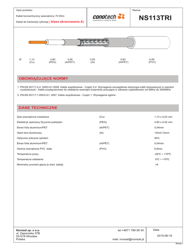 Nazwa Opis produktu NS113TRI Kabel koncentryczny wewnętrzny 75 Ohm Kabel do transmisji cyfrowej ( Ø 1,13 (Cu) klasa ekranowania A) 4,80 (PEG) 4,90 (Al/PET) 5,50 (Al) 5,60 (Al/PET) 6,80 (PVC) OBOWIĄZUJĄCE NORMY 1. PN-EN 50117-2-4: 2005+A1:2008. Kable współosiowe - Część 2-4: Wymagania szczegółowe dotyczące kabli stosowanych w sieciach rozdzielczych - Kable przyłączeniowe do układania wewnątrz budynków pracujące w zakresie częstotliwości od 5MHz do 3000MHz. 2. PN-EN 50117-1:2003+A1: 2007. Kable współosiowe - Część 1: Wymagania ogólne. DANE TECHNICZNE Żyła wewnętrzna miedziana (Cu) 1,13 ± 0,02 mm Dielektryk spieniany fizycznie polietylen (PEG) 4,80 ± 0,02 mm Ekran folia aluminium/PET (Al/PET) 0,04mm Oplot drut aluminiowy (Al) 144x0,12mm Optyczne pokrycie oplotem 95% Ekran folia aluminium/PET (Al/PET) 0,04mm Otulina zewnętrzna PVC biały (PVC) 6,8mm Temperatura pracy -20ºC ÷ +70ºC Temperatura układania 0ºC ÷ +70ºC Minimalny promień gięcia [x śred. kabla] >8 Novisat sp. z o.o. ul. Zaporoska 37B 53-519 Wrocław Polska tel.+4871 799 09 34 Data 2015-06-15 mail: [email protected] Strona 1 Nazwa Opis produktu NS113TRI Kabel koncentryczny wewnętrzny 75 Ohm Kabel do transmisji cyfrowej ( klasa ekranowania A) DANE ELEKTRYCZNE Impedancja charakterystyczna (przy częstotliwości 200MHz) 75 ± 3 Ohm Pojemność jednostkowa 50,3 ± 2 pF/m Skuteczna przenikalność dielektryczna Ɛ < 2,2 Tłumienność echa własnego ≥ 40dB Tłumienność kabla (przy częstotliwości 200MHz) ≤ 20dB/100m Współczynnik skuteczności ekranowania 30-1000 [Mhz] ≥ 85 Współczynnik skuteczności ekranowania 1500-2200 [Mhz] ≥75 NS113TRI 60 Insertion loss (dB/100m) at 20°C 50 40 30 NS113TRI 20 10 0 0 0,5 1 1,5 2 Frequency (GHz, 5MHz - 2,4GHz ) Rysunek 1: Tłumienie kabla w przedziale częstotliwości 5-2400MHz Novisat sp. z o.o. ul. Zaporoska 37B 53-519 Wrocław Polska tel.+4871 799 09 34 Data 2015-06-15 mail: [email protected] Strona 2 Nazwa Opis produktu Kabel koncentryczny wewnętrzny 75 Ohm Kabel do transmisji cyfrowej ( klasa ekranowania A) NS113TRI Rysunek 2: Przebieg przebieg zmian fazy w funkcji częstotliwości Rysunek 3: Tłumienność kabla NS113 TRI Rysunek 4: Tłumienność odbiciowa kabla NS113 TRI - port 1 Rysunek 5: Tłumienność odbiciowa kabla NS113 TRI - port 2 APARATURA STOSOWANA DO BADAŃ 1.Cęgi absorbcyjne, MDS 21, Rohde & Schwartz, IŁ 10-5-2 2.Analizator sieci, HP 8753 C, Hewlett-Packard, IŁ 47-2-325 3.Miernik parametrów macierzy S, HP 85046 B, Hewlett-Packard, IŁ 10-7-3 4.Zestaw do kalibracji, HP 85036 B, Hewlett-Packard, IŁ 60-019 5.Tester kabli współosiowych, 1503 C, Tektronix, IŁ 74-0-33 6.Analizator widma, MS 2601 K, Anritsu, IŁ 47-2-278 7.Generator sygnałowy, Hewlett-Packard IŁ 800-301656 8.Automatyczny miernik C, E 315 A, MERATRONIC, IŁ 08-3-4; 9.Cęgi absorbcyjne, MDS 22, Rohde & Schwartz, IŁ 1801-1054 PRODUKTY POWIĄZANE Złącze typu F 6,8mm nakręcane Złącze typu F podwójne ( tzw. beczka) Złącze typu F 6,8 mm zaciskanie (w sześciokąt) Zaciskarka do złącz typu F zaciskanych Klucz do złącz typu F Novisat sp. z o.o. ul. Zaporoska 37B 53-519 Wrocław Polska tel.+4871 799 09 34 Data 2015-06-15 mail: [email protected] Strona 3