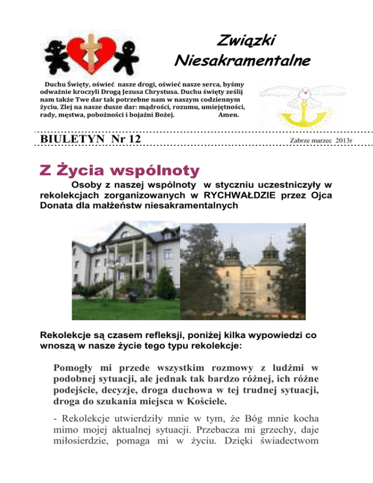 Związki Niesakramentalne Duchu Święty, oświeć nasze drogi, oświeć nasze serca, byśmy odważnie kroczyli Drogą Jezusa Chrystusa. Duchu święty ześlij nam także Twe dar tak potrzebne nam w naszym codziennym życiu. Zlej na nasze dusze dar: mądrości, rozumu, umiejętności, rady, męstwa, pobożności i bojaźni Bożej. Amen. BIULETYN Nr 12 Zabrze marzec 2013r Z Życia wspólnoty Osoby z naszej wspólnoty w styczniu uczestniczyły w rekolekcjach zorganizowanych w RYCHWAŁDZIE przez Ojca Donata dla małżeństw niesakramentalnych Rekolekcje są czasem refleksji, poniżej kilka wypowiedzi co wnoszą w nasze życie tego typu rekolekcje: Pomogły mi przede wszystkim rozmowy z ludźmi w podobnej sytuacji, ale jednak tak bardzo różnej, ich różne podejście, decyzje, droga duchowa w tej trudnej sytuacji, droga do szukania miejsca w Kościele. - Rekolekcje utwierdziły mnie w tym, że Bóg mnie kocha mimo mojej aktualnej sytuacji. Przebacza mi grzechy, daje miłosierdzie, pomaga mi w życiu. Dzięki świadectwom poznanych tutaj ludzi, wiem, że nawet tacy ludzie jak my doznają łaski i pomocy, że mogą się nawrócić i bardziej kochać Boga i ludzi. - Największe moje przeżycie w tym czasie to Eucharystia. Nieliczne grono osób biorące czynny udział w spotkaniu, to mistyczne przeżycie Mszy św. jest jak miód na moje serce, Można "dotknąć" Boga, poczuć Jego obecność. Poza tym spotkania w grupach - dzielenie się doświadczeniami, wysłuchanie drugiej osoby bardzo umacnia mnie w szukaniu dobrej drogi do Pana. - Największym przeżyciem tego czasu jest poczucie, że nie jestem odtrącony pomimo mego grzechu.(...) Widzę teraz jak bardzo ważny jest sakrament małżeństwa, jaka to jest odpowiedzialność i wiem, ze nie jestem odrzucony przez Kościół i przede wszystkim przez Boga. Następne rekolekcje z Ojcem Donatem w październiku 2013r Czego potrzeba, by odbyła się Msza święta? W normalnych warunkach potrzebny jest kościół drewniany czy murowany, czasem ubogi, jak Jezus Frasobliwy, czasem wykwintny i bogaty. Potrzebny jest ksiądz, ołtarz, nieraz zabytkowy, oglądany przez turystów, czasem bardzo niepozorny. Potrzebny jest mszał, kielich, patena, obrus, chleb, wino, świece, dzwonek, chociaż można obejść się bez niego, bo wiemy na pamięć, kiedy zadzwoni. Kiedy jednak się odezwie, jest tak, jakby Jezus chodził po kościele, jak kiedyś po Ogrodzie Oliwnym, i budził: „czy możesz chociaż w czasie jednej Mszy świętej być naprawdę ze Mną?” Czego jeszcze potrzeba? Potrzebna jest jeszcze kropla wody. W eleganckim kościele celebransowi podają elegancką łyżeczkę, żeby strącił nią do kielicha jedną kroplę. W innych kościołach, gdzie złoto jest dość ubogie wobec kwiatów polnych, ksiądz „na oko” odmierza tę kroplę. Jak to dziwne, że kapłan, który tak posługuje się swymi konsekrowanymi palcami, aby czasem niekonsekrowanym paluchem nie dotknąć Komunii świętej, wrzuca w głąb kielicha, w którym niedługo znajdzie się Krew Przenajświętsza, zwyczajną, niedestylowaną, niepoświęconą, niekonsekrowaną kroplę wody. Zwykła kropla, którą wieśniaczka czerpie ze studni, a mieszczuch otrzymuje z kranu, dostaje się w głąb Mszy świętej. To my jesteśmy jak ta kropla, tacy niedestylowani, nigdy do końca nie oczyszczeni, nie poświęceni, nie konsekrowani w całości. Mamy brać udział we Mszy świętej, w czasie której nie wystarczy wstawać, klękać, recytować, śpiewać, ale trzeba jeszcze dostać się aż do Krwi Pana Jezusa, choćby to miało nas zaboleć. Wciąż ktoś kocha i ktoś odrzuca. Wciąż ktoś się śpieszy, lecz nikt na niego nie czeka. Kołacze, a komu innemu otwierają. Biegnie z sercem, droga się urywa… Nasze życie, pełne samotności, czasem – wydawałoby się – bezsensowne, jest jak ta kropla wody. Może jednak wpaść w środek Mszy świętej i nabrać wielkiego znaczenia . Przychodzimy na Mszę zawsze z ostatnim zmartwieniem, z tym, co nas zabolało, poraniło. Właśnie to mamy połączyć z ofiarą Pana Jezusa. Kropla Wpada do kielicha, do Krwi Przenajświętszej. Kapłan nie mówi, że pije Krew Najświętszą i wodę. Mówi, że pije Krew Najświętszą, bo wody już nie ma – jest tylko Jezus. Jeżeli w czasie Mszy świętej oddamy to, co nas bardzo boli, oddamy tak jak kroplę wody do kielicha, to znikniemy. Będzie tylko Pan Jezus. Ks. Jan Twardowski ŹRÓDŁO WODY ŻYWEJ Rekolekcje dla osób żyjących w związkach niesakramentalnych To propozycja skierowana do osób, które różnych powodów nie mogą zawrzeć sakramentalnego związku małżeńskiego. Celem rekolekcji jest ukazanie, że Kościół jest domem, w którym dla WSZYSTKICH jest miejsce, nawet jeśli ktoś nie może otrzymać sakramentalnego rozgrzeszenia oraz przystępować do komunii Świętej. W czasie rekolekcji poruszane są takie tematy jak; doświadczenie Bożej Miłości, przebaczenie, modlitwa, świadectwo wiary. ZAPRASZAMY Termin: 12-14 Kwietnia 2013 r Miejsce: Dom Rekolekcyjny Matki Bożej Nieustającej Pomocy Ul. Zamoyskiego 56 w Krakowie Kom; 515 660 125 Szczegóły; WWW.cadr.redemotor.pl Spotkania niesakramentalnych Parafia Św KAMILA Zabrze Następne; każdą trzecią niedziele miesiąca. Godzina spotkań została przesunięta na wcześniejszą. Spotkania rozpoczynają się w Kaplicy od Adoracji przed Najświętszym Sakramentem 17 Marzec godz 17:00 21 Kwiecień2013 godz 17:00 19 Maja 2013 godz 17:00 Opiekun grupy - ojciec Wojciech Węglicki MI. ___________________________________________ Kontakt : e-mail: [email protected] www.kamilianie-zabrze.pl