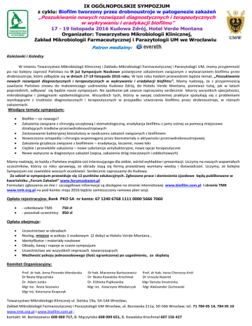 IX OGÓLNOPOLSKIE SYMPOZJUM z cyklu: Biofilm tworzony przez drobnoustroje w patogenezie zakażeń „Poszukiwanie nowych rozwiązań diagnostycznych i terapeutycznych w wykrywaniu i eradykacji biofilmu” 17 - 19 listopada 2016 Kudowa Zdrój, Hotel Verde Montana Organizator: Towarzystwo Mikrobiologii Klinicznej, Zakład Mikrobiologii Farmaceutycznej i Parazytologii UM we Wrocławiuu Patron medialny: Koleżanki i Koledzy W imieniu Towarzystwa Mikrobiologii Klinicznej i Zakładu Mikrobiologii Farmaceutycznej i Parazytologii UM, mamy przyjemność po raz kolejny zaprosić Państwa na IX już Sympozjum Naukowe poświęcone zakażeniom związanym z wytwarzaniem biofilmu przez drobnoustroje, które odbędzie się w dniach 17-19 listopada 2016 roku. W tym roku hasłem przewodnim będzie temat. „Poszukiwanie nowych rozwiązań diagnostycznych i terapeutycznych w wykrywaniu i eradykacji biofilmu”. Mamy nadzieję, że z przyjemnością zawitacie Państwo znowu do malowniczego uzdrowiska Kudowa Zdrój, do Hotelu Verde Montana, ponieważ tutaj, jak w latach poprzednich, odbywać się będzie nasze sympozjum. Na spotkanie jak zawsze zapraszamy serdecznie lekarzy wszystkich specjalności, mikrobiologów i pielęgniarki epidemiologiczne. Wszystkich tych, którzy w swojej codziennej praktyce spotykają się z problemami wynikającymi z trudności diagnostycznych i terapeutycznych w przypadku utworzenia biofilmu przez drobnoustroje, w różnych zakażeniach. Wiodące tematy sympozjum: Biofilm – co nowego? Zakażenia związane z chirurgią szczękową i stomatologiczną, eradykacja biofilmu z jamy ustnej za pomocą miejscowo działających środków przeciwdrobnoustrojowych Zastosowanie bakteryjnej biocelulozy w zwalczaniu zakażeń związanych z biofilmem Nowoczesna ortopedia i chirurgia wspomagana przez biomateriały o aktywności przeciwdrobnoustrojowej Zakażenia grzybicze związane z biofilmem – eradykacja, leczenie, nowe leki Ciężkie i przewlekłe zakażenia – nowe substancje antybakteryjne, nowe opcje terapeutyczne Nowe wytyczne w diagnostyce zakażeń (sepsa, zakażenia dróg moczowych i oddechowych) Mamy nadzieję, że każdy z Państwa znajdzie coś interesującego dla siebie, wśród wykładów i prezentacji. Liczymy na naszych wspaniałych uczestników, którzy co roku sprawiają, że obrady stają się formą prawdziwej wymiany wiedzy i doświadczeń. Liczymy, że kolejne Sympozjum nie zawiedzie waszych oczekiwań. Serdecznie zapraszamy do Kudowy. Za udział w sympozjum przewiduje się 12 punktów edukacyjnych. Zgłoszone prace i doniesienia zjazdowe będą publikowane w kwartalniku „Forum Zakażeń” www.forumzakazen.pl Formularz zgłoszenia on line i szczegółowe informacje są dostępne na stronie internetowej www.biofilm.com.pl i stronie TMK www.tmk.org.pl na pod koniec maja 2016 będzie zamieszczony ramowy plan sesji. Opłata rejestracyjna: Bank PKO SA nr konta: 67 1240 6768 1111 0000 5666 7060 - członkowie TMK 750 zł - pozostali uczestnicy 850 zł Opłata obejmuje: Uczestnictwo w obradach Nocleg, miejsce w pokoju 2 osobowym (2 doby) w Hotelu Verde Montana , Identyfikator i materiały naukowe Obiady, kawę i napoje w czasie sympozjum Uczestnictwo we wszystkich imprezach towarzyszących Możliwość pokoju jednoosobowego (ilość ograniczona) po uzgodnieniu, za dopłatą Komitet Organizacyjny: Prof. dr hab. Anna Przondo-Mordarska Dr Beata Mączyńska Dr Adam Junka Mgr inż. Anna Secewicz Mgr inż. Katarzyna Knapczyk Dr hab. Marzenna Bartoszewicz Dr Beata Kowalska-Krochmal Dr. Elżbieta Piątkowska Mgr inż. Katarzyna Włodarczyk Prof. dr hab. Irena Choroszy-Król Dr Urszula Nawrot Mgr Danuta Smutnicka Mgr Aleksander Zuchowski Towarzystwo Mikrobiologii Klinicznej ul. Sielska 19a, 54-144 Wrocław; Zakład Mikrobiologii Farmaceutycznej i Parazytologii UM Wrocław, ul. Borowska 211a, 50-566 Wrocław; tel. 71 784 05 14, 784 05 10 www.tmk.org.pl i www.biofilm.com.pl ; kontakt: M. Bartoszewicz 608 069 717, B. Mączyńska 608 099 651, B. Kowalska-Krochmal 607 156 427