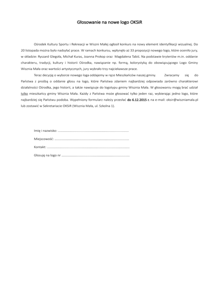 Głosowanie na nowe logo OKSiR Ośrodek Kultury Sportu i Rekreacji w Wiszni Małej ogłosił konkurs na nowy element identyfikacji wizualnej. Do 20 listopada można było nadsyłać prace. W ramach konkursu, wpłynęło aż 33 propozycji nowego logo, które oceniło jury, w składzie: Ryszard Glegoła, Michał Kuras, Joanna Prokop oraz Magdalena Tabiś. Na podstawie kryteriów m.in. oddanie charakteru, tradycji, kultury i historii Ośrodka, nawiązanie np. formą, kolorystyką do obowiązującego Logo Gminy Wisznia Mała oraz wartości artystycznych, jury wybrało trzy najciekawsze prace. Teraz decyzję o wyborze nowego loga oddajemy w ręce Mieszkańców naszej gminy. Zwracamy się do Państwa z prośbą o oddanie głosu na logo, które Państwa zdaniem najbardziej odpowiada zarówno charakterowi działalności Ośrodka, jego historii, a także nawiązuje do logotypu gminy Wisznia Mała. W głosowaniu mogą brać udział tylko mieszkańcy gminy Wisznia Mała. Każdy z Państwa może głosować tylko jeden raz, wybierając jedno logo, które najbardziej się Państwu podoba. Wypełniony formularz należy przesłać do 6.12.2015 r. na e-mail: [email protected] lub zostawić w Sekretariacie OKSiR (Wisznia Mała, ul. Szkolna 1). Imię i nazwisko: …............................................................................ Miejscowość: …................................................................................ Kontakt: …......................................................................................... Głosuję na logo nr ….........................................................................