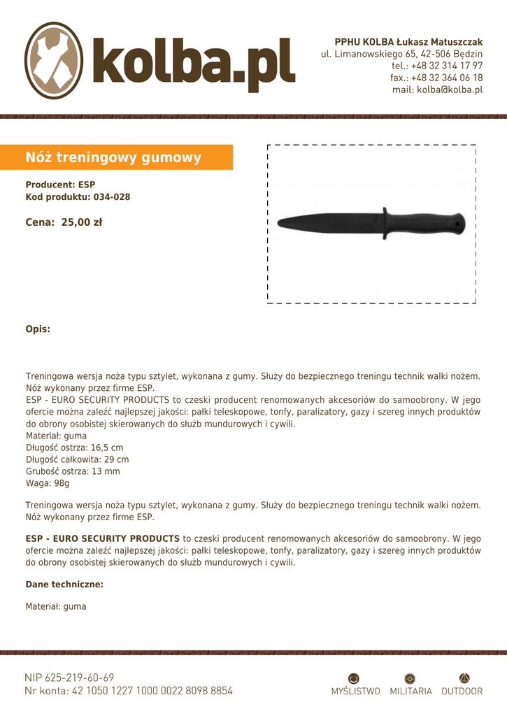 Nóż treningowy gumowy Producent: ESP Kod produktu: 034-028 Cena: 25,00 zł Opis: Treningowa wersja noża typu sztylet, wykonana z gumy. Służy do bezpiecznego treningu technik walki nożem. Nóż wykonany przez firme ESP. ESP - EURO SECURITY PRODUCTS to czeski producent renomowanych akcesoriów do samoobrony. W jego ofercie można zaleźć najlepszej jakości: pałki teleskopowe, tonfy, paralizatory, gazy i szereg innych produktów do obrony osobistej skierowanych do służb mundurowych i cywili. Materiał: guma Długość ostrza: 16,5 cm Długość całkowita: 29 cm Grubość ostrza: 13 mm Waga: 98g Treningowa wersja noża typu sztylet, wykonana z gumy. Służy do bezpiecznego treningu technik walki nożem. Nóż wykonany przez firme ESP. ESP - EURO SECURITY PRODUCTS to czeski producent renomowanych akcesoriów do samoobrony. W jego ofercie można zaleźć najlepszej jakości: pałki teleskopowe, tonfy, paralizatory, gazy i szereg innych produktów do obrony osobistej skierowanych do służb mundurowych i cywili. Dane techniczne: Materiał: guma Długość ostrza: 16,5 cm Długość całkowita: 29 cm Grubość ostrza: 13 mm Waga: 98g