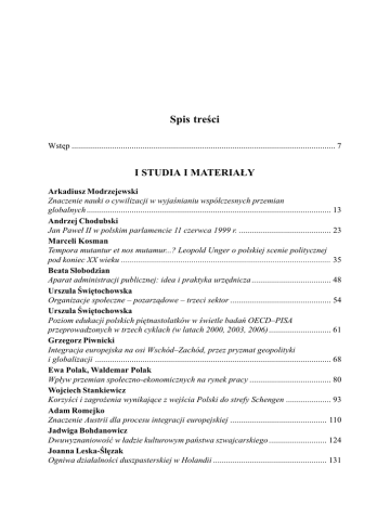 Spis treci Wstêp ........................................................................................................................... 7 I STUDIA I MATERIA£Y Arkadiusz Modrzejewski Znaczenie nauki o cywilizacji w wyjanianiu wspó³czesnych przemian globalnych .................................................................................................................. 13 Andrzej Chodubski Jan Pawe³ II w polskim parlamencie 11 czerwca 1999 r. ........................................... 23 Marceli Kosman Tempora mutantur et nos mutamur...? Leopold Unger o polskiej scenie politycznej pod koniec XX wieku .................................................................................................. 35 Beata S³obodzian Aparat administracji publicznej: idea i praktyka urzêdnicza..................................... 48 Urszula wiêtochowska Organizacje spo³eczne pozarz¹dowe trzeci sektor ............................................... 54 Urszula wiêtochowska Poziom edukacji polskich piêtnastolatków w wietle badañ OECDPISA przeprowadzonych w trzech cyklach (w latach 2000, 2003, 2006) ............................. 61 Grzegorz Piwnicki Integracja europejska na osi WschódZachód, przez pryzmat geopolityki i globalizacji .............................................................................................................. 68 Ewa Polak, Waldemar Polak Wp³yw przemian spo³eczno-ekonomicznych na rynek pracy ...................................... 80 Wojciech Stankiewicz Korzyci i zagro¿enia wynikaj¹ce z wejcia Polski do strefy Schengen ..................... 93 Adam Romejko Znaczenie Austrii dla procesu integracji europejskiej ............................................. 110 Jadwiga Bohdanowicz Dwuwyznaniowoæ w ³adzie kulturowym pañstwa szwajcarskiego ........................... 124 Joanna Leska-lêzak Ogniwa dzia³alnoci duszpasterskiej w Holandii ..................................................... 131 Adam Romejko Przemoc na tle religijnym we wspó³czesnych Indiach .............................................. 135 Tomasz Lenkiewicz O postrzeganiu odrêbnoci kulturowo-cywilizacyjnej Rosji ..................................... 145 Tadeusz Dmochowski Koncepcja bezpieczeñstwa narodowego Federacji Rosyjskiej 19972000 .............. 158 Tadeusz Dmochowski Stosunki radziecko-chiñskie w wypowiedziach Gorbaczowa (19851989) .............. 180 Jacek Jakubowski Ustrój polityczny Republiki Estonii .......................................................................... 191 Marek Dziêcielski Konserwatywny wiat junkierstwa pomorskiego na tle ¿ycia i dzia³alnoci Georga von Diezelskyego z Choczewa (18731944) .............................................. 206 Jaros³aw lêzak Uwarunkowanie przemian demograficznych w Wolnym Miecie Gdañsku .............. 229 Jacek Knopek £emkowie w Polsce miêdzy to¿samoci¹ a asymilacj¹ .......................................... 242 Andrzej Jan Chodubski Mniejszoci narodowe i etniczne w pomorskiej przestrzeni kulturowej ................... 256 Stanis³aw Musia³ Poznawcze i instytucjonalne aspekty politologii w wiecie i Polsce ........................ 273 II. RECENZJE I OMÓWIENIA Marceli Kosman, Polska w drugim tysi¹cleciu, t. 1 Czasy narodu i pañstwa szlacheckiego (Andrzej Chodubski) .................................................................... 293 Tadeusz Antoni Siedlik, Z historii Polski 19001939. Klêska demokracji (Andrzej Chodubski) ........................................................................................... 298 Wojciech Materski, Na widecie. II Rzeczpospolita wobec Sowietów 19181943, (Andrzej Chodubski) ........................................................................................... 302 Wojciech leszyñski, Bezpieczeñstwo wewnêtrzne w polityce pañstwa polskiego na ziemiach pó³nocno-wschodnich II Rzeczypospolitej (Andrzej Chodubski) .... 307 Edward Walewander, Pedagogika katolicka w diecezji lubelskiej 19181939 (Andrzej Chodubski) ........................................................................................... 312 Andrzej G¹siorowski, Jan Kaszubowski i s³u¿by specjalne Gestapo, Smiersz, UB, (Andrzej Chodubski) ........................................................................................... 317 Marceli Kosman, Los Genera³a. Wokó³ medialnego wizerunku Wojciecha Jaruzelskiego (Andrzej Chodubski) .................................................................... 322 Wojciech Marcin Stankiewicz, Konflikt jako zjawisko integruj¹ce i dezintegruj¹ce oblicze wspó³czesnego wiata (Andrzej Chodubski) ................ 326 Wspó³czesne problemy wiata islamu, red. Marek J. Malinowski, Rafa³ Ozarowski, (Andrzej Chodubski) ............................................................ 331 Problemy transformacji, integracji i bezpieczeñstwa pañstw Azji Centralnej, red. Tadeusz Bodio, Andrzej Wierzbicki, Piotr Za³êski (Andrzej Chodubski) ........................................................................................... 336 Roman Bäcker, Rosyjskie mylenie polityczne za czasów prezydenta Putina (Andrzej Chodubski) ........................................................................................... 341 Arkadiusz ¯ukowski, Diaspora polska w Republice Po³udniowej Afryki w warunkach wspó³czesnej unifikacji i dywersyfikacji wiata (Andrzej Chodubski) ........................................................................................... 346 Jacek Knopek, Stosunki Polski z krajami Afryki Zachodniej (Andrzej Chodubski) ........................................................................................... 350 Jakub Potulski, Socjologia polityki (Andrzej Chodubski) ...................................... 355 Wokó³ polityki spo³ecznej. Ksiêga jubileuszowa dedykowana Profesorowi Julianowi Auleytnerowi, red. Katarzyna G³¹bicka, Miros³aw Grewiñski (Andrzej Chodubski) ...............................................................................