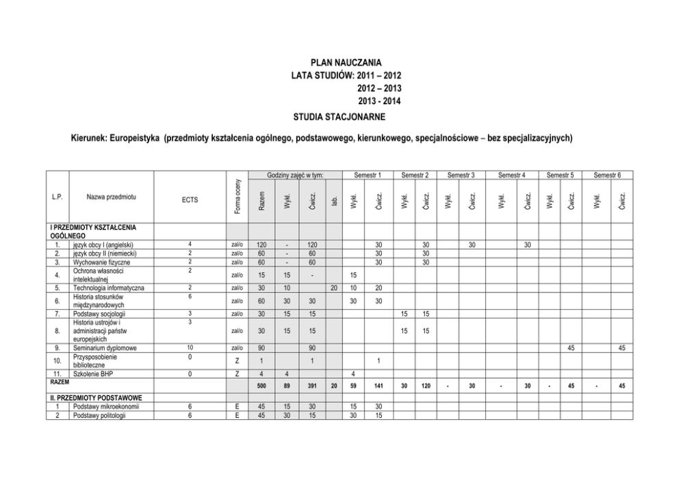 PLAN NAUCZANIA LATA STUDIÓW: 2011 – 2012 2012 – 2013 2013 - 2014 STUDIA STACJONARNE Kierunek: Europeistyka (przedmioty kształcenia ogólnego, podstawowego, kierunkowego, specjalnościowe – bez specjalizacyjnych) 10 zal/o 60 30 30 3 3 zal/o 30 15 15 15 15 zal/o 30 15 15 15 15 zal/o 90 90 Z 1 1 Z 4 4 500 89 391 45 45 15 30 30 15 10 0 0 RAZEM II. PRZEDMIOTY PODSTAWOWE 1 Podstawy mikroekonomii 2 Podstawy politologii 6 6 E E Ćwicz. 30 Semestr 6 Wykł. zal/o Ćwicz. 2 6 Semestr 5 Wykł. - 30 Ćwicz. 15 Semestr 4 Wykł. 15 30 30 30 Ćwicz. zal/o 30 30 30 Semestr 3 Wykł. 120 60 60 Ćwicz. - Wykł. 120 60 60 Ćwicz. zal/o zal/o zal/o Wykł. 4 2 2 2 ECTS lab. Ćwicz. I PRZEDMIOTY KSZTAŁCENIA OGÓLNEGO 1. język obcy I (angielski) 2. język obcy II (niemiecki) 3. Wychowanie fizyczne Ochrona własności 4. intelektualnej 5. Technologia informatyczna Historia stosunków 6. międzynarodowych 7. Podstawy socjologii Historia ustrojów i 8. administracji państw europejskich 9. Seminarium dyplomowe Przysposobienie 10. biblioteczne 11. Szkolenie BHP Semestr 2 Wykł. Nazwa przedmiotu Semestr 1 Razem L.P. Forma oceny Godziny zajęć w tym: 30 15 20 10 20 30 30 45 45 1 4 20 59 141 15 30 30 15 30 120 - 30 - 30 - 45 - 45 8 9 10 15 30 E 60 30 30 30 30 E 60 30 30 30 30 E 30 15 15 15 15 E 30 30 360 195 165 zal/o 30 - 30 30 zal/o 30 - 30 30 zal/o 30 - 30 30 E 60 30 E 60 zal/o 15 Wykł. 30 Ćwicz. 15 Wykł. 45 lab. E 30 Ćwicz. 7 15 Wykł. 6 30 Semestr 6 Ćwicz. 5 Ekonomiczne podstawy integracji europejskiej Historia społeczna Europy Źródła cywilizacji europejskiej Historia gospodarcza Europy Instytucje oraz zasady funkcjonowania Unii Europejskiej Systemy polityczne państw europejskich Polityka regionalna Unii 45 Semestr 5 Wykł. 4 E Semestr 4 Ćwicz. RAZEM III. PRZEDMIOTY KIERUNKOWE Podstawy 1 międzynarodowych stosunków gospodarczych Podstawy 2 międzynarodowych stosunków politycznych Procesy integracyjne w 3 Europie 4 Ćwicz. 8 8 Wykł. 7 6 8 Ćwicz. 6 6 Wykł. 5 Podstawy wiedzy o państwie i prawie Podstawy makroekonomii Prawo wspólnotowe Unii Europejskiej Antropologia społeczna i kultura Europy Prawo gospodarcze Unii Europejskiej Problemy społeczne i narodowo-religijne w Europie Ćwicz. 4 ECTS Semestr 3 Wykł. 3 Nazwa przedmiotu Semestr 2 Razem L.P. Semestr 1 Forma oceny Godziny zajęć w tym: - - - - - 15 15 3 30 - 75 60 45 60 45 45 30 30 30 30 30 30 30 30 30 15 15 15 15 zal/o 30 15 15 15 15 E 60 30 30 30 30 E 60 30 30 30 30 E 30 15 15 3 3 3 6 6 3 3 8 8 4 Przedmioty specjalnościowe Europejskie stosunki społeczno-polityczne Polska w procesie integracji 1 europejskiej Najnowsza historia 2 polityczna Europy Bezpieczeństwo 3 międzynarodowe Stosunki międzynarodowe w 4 Europie Unia Europejska w 5 międzynarodowym systemie politycznym Polska polityka zagraniczna 6 7 8 9. 10. 11. 12. 4 zal/o 45 30 5 zal/o 60 4 zal/o 3 15 30 30 30 30 15 15 15 15 - 90 90 90 Wykł. 15 - Wykł. 15 - Wykł. - - Wykł. - lab. Ćwicz. 285 30 30 45 45 Semestr 6 Wykł. 195 Semestr 5 Ćwicz. 480 RAZEM Semestr 4 Ćwicz. 30 Semestr 3 Ćwicz. 30 Semestr 2 Ćwicz. 60 Ćwicz. E Semestr 1 Wykł. 8 Ćwicz. Europejskiej Polityki sektorowe Unii Europejskiej ECTS Wykł. 11 Nazwa przedmiotu Razem L.P. Forma oceny Godziny zajęć w tym: 60 60 15 30 15 30 30 30 30 45 30 15 30 15 zal/o 30 15 15 15 15 zal/o 30 15 15 15 15 zal/o 30 15 15 15 15 zal/o 30 15 15 15 15 zal/o 45 30 15 30 15 zal/o 30 15 15 15 15 zal/o 30 15 zal/o 60 zal/o 30 3 3 Systemy partyjne Europy 3 Mniejszości narodowe w Europie Współczesne systemy polityczne Procesy integracyjne w Europie ŚrodkowoWschodniej 5 Prawa socjalne i ochrona praw człowieka w Unii Europejskiej Wspólna polityka zagraniczna i bezpieczeństwa Unii 6 3 3 3 30 zal/o 30 15 15 15 15 zal/o 15 15 15 zal/o 15 15 15 Ćwicz. 15 Wykł. 30 Ćwicz. 15 Wykł. 45 Ćwicz. zal/o Wykł. 15 Ćwicz. 15 Wykł. 15 Ćwicz. 15 Wykł. 30 lab. zal/o 3 5 3 1 1 600 Razem 1940 300 779 300 - 1141 20 - - - - - - 90 60 15 30 105 90 Przedmioty specjalnościowe Europejskie stosunki gospodarcze 1 2 3 4 5 6 7 8 Semestr 6 Ćwicz. Semestr 5 Wykł. Semestr 4 Ćwicz. Europejskiej Wspólna polityka Unii Europejskiej w zakresie 13. wymiaru sprawiedliwości i spraw wewnętrznych Stosunki kulturalne w 14. Europie Regionalizm i federalizm w 15. Europie Współczesne ruchy 16. społeczne w Europie Islam i islamizm we 17. współczesnej Europie Suma godzin specjalnościowych ECTS Semestr 3 Wykł. Nazwa przedmiotu Semestr 2 Razem L.P. Semestr 1 Forma oceny Godziny zajęć w tym: Fundusze strukturalne Unii Europejskiej Prawa socjalne w Unii Europejskiej Ekonomiczne skutki rozwoju i poszerzenia Unii Europejskiej Funkcjonowanie wspólnego rynku Ochrona konkurencji i konsumenta w UE Polityka rolna Unii Europejskiej 4 Polityka społeczna Unii Europejskiej Polityka handlowa w Unii 3 2 zal/o 45 15 30 zal/o 30 30 zal/o 30 15 15 15 15 zal/o 30 15 15 15 15 zal/o 15 zal/o 30 15 15 15 15 zal/o 30 15 15 15 15 zal/o 15 30 3 3 1 15 15 3 2 15 15 105 150 2 14 Polityka ekologiczna i ochrony środowiska w UE Fundusze strukturalne UE dla samorządów terytorialnych Bezpieczeństwo ekonomiczne państw Polityka budżetowa Unii Europejskiej Polityka wsparcia rozwoju lokalnego Unii Europejskiej Gospodarka finansowa samorządu w Polsce i w UE 3 15 Polityka rozwoju zrównoważonego i ekorozwoju w Unii Europejskiej Kształtowanie ładu zagospodarowania przestrzennego w Unii Europejskiej Strategie rozwoju regionalnego w Unii Europejskiej 3 Dostosowanie gospodarki polskiej do standardów UE 3 Europejski fundusz społeczny i jego wykorzystywanie w 2 10 11 12 13 16 17 18 19 20 Semestr 5 Semestr 6 zal/o 30 15 15 15 15 zal/o 30 15 15 15 15 zal/o 60 30 30 30 30 zal/o 30 15 15 15 15 zal/o 30 15 15 15 15 zal/o 30 15 15 15 15 zal/o 30 15 15 15 15 zal/o 30 15 15 15 15 zal/o 15 15 15 Ćwicz. 15 30 Wykł. 15 Ćwicz. 15 Ćwicz. 15 Wykł. 30 Ćwicz. zal/o Wykł. 15 Ćwicz. zal/o Wykł. 15 Ćwicz. 30 Wykł. 45 lab. zal/o Wykł. 4 Semestr 4 Ćwicz. Europejskiej Finanse Unii Euro