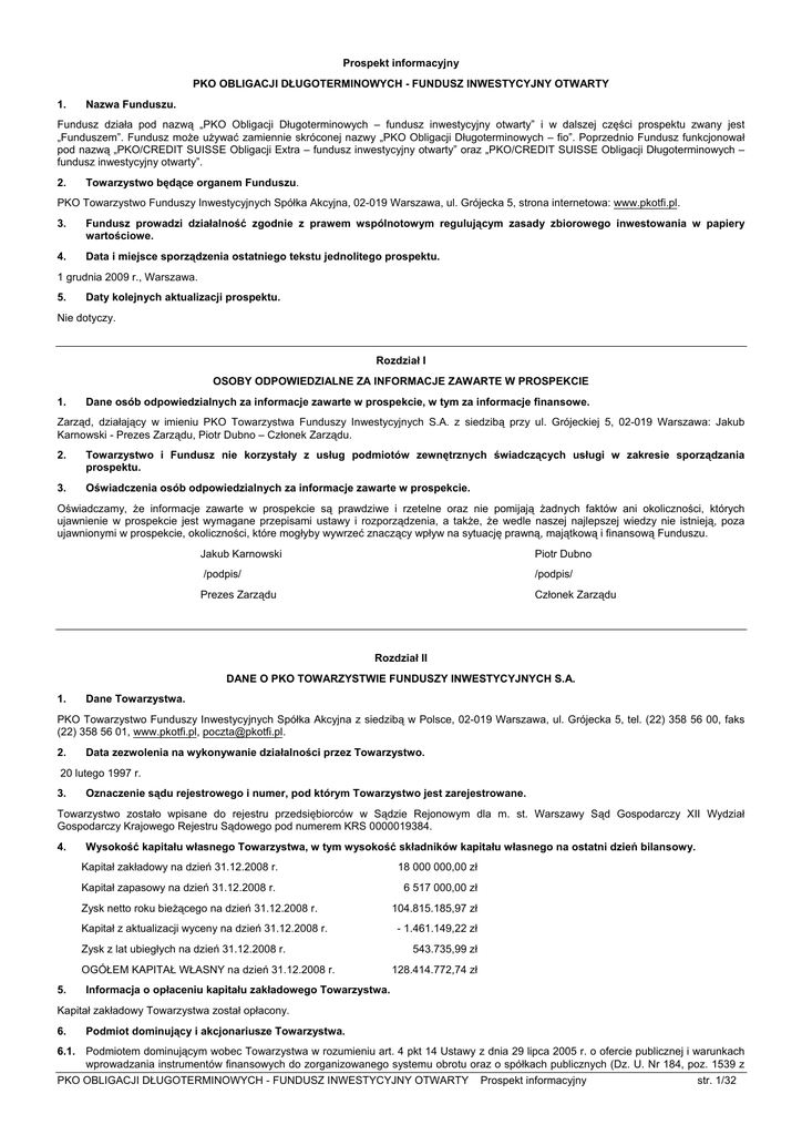 Prospekt informacyjny PKO OBLIGACJI DŁUGOTERMINOWYCH - FUNDUSZ INWESTYCYJNY OTWARTY 1. Nazwa Funduszu. Fundusz działa pod nazwą „PKO Obligacji Długoterminowych – fundusz inwestycyjny otwarty” i w dalszej części prospektu zwany jest „Funduszem”. Fundusz może używać zamiennie skróconej nazwy „PKO Obligacji Długoterminowych – fio”. Poprzednio Fundusz funkcjonował pod nazwą „PKO/CREDIT SUISSE Obligacji Extra – fundusz inwestycyjny otwarty” oraz „PKO/CREDIT SUISSE Obligacji Długoterminowych – fundusz inwestycyjny otwarty”. 2. Towarzystwo będące organem Funduszu. PKO Towarzystwo Funduszy Inwestycyjnych Spółka Akcyjna, 02-019 Warszawa, ul. Grójecka 5, strona internetowa: www.pkotfi.pl. 3. Fundusz prowadzi działalność zgodnie z prawem wspólnotowym regulującym zasady zbiorowego inwestowania w papiery wartościowe. 4. Data i miejsce sporządzenia ostatniego tekstu jednolitego prospektu. 1 grudnia 2009 r., Warszawa. 5. Daty kolejnych aktualizacji prospektu. Nie dotyczy. Rozdział I OSOBY ODPOWIEDZIALNE ZA INFORMACJE ZAWARTE W PROSPEKCIE 1. Dane osób odpowiedzialnych za informacje zawarte w prospekcie, w tym za informacje finansowe. Zarząd, działający w imieniu PKO Towarzystwa Funduszy Inwestycyjnych S.A. z siedzibą przy ul. Grójeckiej 5, 02-019 Warszawa: Jakub Karnowski - Prezes Zarządu, Piotr Dubno – Członek Zarządu. 2. Towarzystwo i Fundusz nie korzystały z usług podmiotów zewnętrznych świadczących usługi w zakresie sporządzania prospektu. 3. Oświadczenia osób odpowiedzialnych za informacje zawarte w prospekcie. Oświadczamy, że informacje zawarte w prospekcie są prawdziwe i rzetelne oraz nie pomijają żadnych faktów ani okoliczności, których ujawnienie w prospekcie jest wymagane przepisami ustawy i rozporządzenia, a także, że wedle naszej najlepszej wiedzy nie istnieją, poza ujawnionymi w prospekcie, okoliczności, które mogłyby wywrzeć znaczący wpływ na sytuację prawną, majątkową i finansową Funduszu. Jakub Karnowski Piotr Dubno /podpis/ /podpis/ Prezes Zarządu Członek Zarządu Rozdział II DANE O PKO TOWARZYSTWIE FUNDUSZY INWESTYCYJNYCH S.A. 1. Dane Towarzystwa. PKO Towarzystwo Funduszy Inwestycyjnych Spółka Akcyjna z siedzibą w Polsce, 02-019 Warszawa, ul. Grójecka 5, tel. (22) 358 56 00, faks (22) 358 56 01, www.pkotfi.pl, [email protected]. 2. Data zezwolenia na wykonywanie działalności przez Towarzystwo. 20 lutego 1997 r. 3. Oznaczenie sądu rejestrowego i numer, pod którym Towarzystwo jest zarejestrowane. Towarzystwo zostało wpisane do rejestru przedsiębiorców w Sądzie Rejonowym dla m. st. Warszawy Sąd Gospodarczy XII Wydział Gospodarczy Krajowego Rejestru Sądowego pod numerem KRS 0000019384. 4. Wysokość kapitału własnego Towarzystwa, w tym wysokość składników kapitału własnego na ostatni dzień bilansowy. Kapitał zakładowy na dzień 31.12.2008 r. 18 000 000,00 zł Kapitał zapasowy na dzień 31.12.2008 r. 6 517 000,00 zł Zysk netto roku bieżącego na dzień 31.12.2008 r. Kapitał z aktualizacji wyceny na dzień 31.12.2008 r. Zysk z lat ubiegłych na dzień 31.12.2008 r. OGÓŁEM KAPITAŁ WŁASNY na dzień 31.12.2008 r. 5. 104.815.185,97 zł - 1.461.149,22 zł 543.735,99 zł 128.414.772,74 zł Informacja o opłaceniu kapitału zakładowego Towarzystwa. Kapitał zakładowy Towarzystwa został opłacony. 6. Podmiot dominujący i akcjonariusze Towarzystwa. 6.1. Podmiotem dominującym wobec Towarzystwa w rozumieniu art. 4 pkt 14 Ustawy z dnia 29 lipca 2005 r. o ofercie publicznej i warunkach wprowadzania instrumentów finansowych do zorganizowanego systemu obrotu oraz o spółkach publicznych (Dz. U. Nr 184, poz. 1539 z PKO OBLIGACJI DŁUGOTERMINOWYCH - FUNDUSZ INWESTYCYJNY OTWARTY Prospekt informacyjny str. 1/32 późn. zm.), posiadającym bezpośrednio wszystkie głosy na walnym zgromadzeniu Towarzystwa, jest Powszechna Kasa Oszczędności Bank Polski S.A. z siedzibą w Warszawie. 6.2. Akcjonariuszem Towarzystwa jest Powszechna Kasa Oszczędności Bank Polski S.A. z siedzibą w Warszawie, która posiada 100% kapitału zakładowego i ma prawo do 360 000 głosów na walnym zgromadzeniu. 7. Imiona i nazwiska: 7.1. członków Zarządu Towarzystwa 7.1.1. Jakub Karnowski – Prezes Zarządu 7.1.2. Piotr Dubno – Członek Zarządu 7.2. członków Rady Nadzorczej Towarzystwa 7.2.1. Krzysztof Dresler – Przewodniczący Rady Nadzorczej 7.2.2. Adam Frankowski 7.2.3. Błażej Borzym 7.2.4. Paweł Metrycki 7.2.5. Marta Konopka 7.2.6. Artur Miernik 7.3. osób fizycznych zarządzających Funduszem Towarzystwo zleciło zarządzanie portfelem inwestycyjnym Funduszu Credit Suisse Asset Management (Polska) S.A. Imiona i nazwiska osób podejmujących decyzje inwestycyjne dotyczące Funduszu, ze wskazaniem części portfela, którym zarządzają, zostały wskazane w Rozdziale V pkt 3.3. Prospektu. 8. Informacje o pełnionych przez osoby, o których mowa w pkt. 7 funkcjach poza Towarzystwem, jeżeli ta okoliczność może mieć znaczenie dla sytuacji uczestników Funduszu. Towarzystwu nie są znane informacje o pełnieniu przez osoby, o których mowa w pkt. 7, funkcji poza Towarzystwem, które mogą mieć znaczenie dla Uczestników Funduszu. 9. Nazwy innych funduszy zarządzanych przez Towarzystwo. 9.1. PKO Rynku Pieniężnego - fundusz inwestycyjny otwarty 9.2. PKO Skarbowy – fundusz inwestycyjny otwarty 9.3. PKO Obligacji - fundusz inwestycyjny otwarty 9.4. PKO Akcji – fundusz inwestycyjny otwarty 9.5. PKO Stabilnego Wzrostu - fundusz inwestycyjny otwarty 9.6. PKO Zrównoważony - fundusz inwestycyjny otwarty 9.7. PKO Akcji Nowa Europa - fundusz inwestycyjny otwarty 9.8. PKO Akcji Małych i Średnich Spółek – fundusz inwestycyjny otwarty 9.9. PKO Światowy Fundusz Walutowy – specjalistyczny fundusz inwestycyjny otwarty z wydzielonymi subfunduszami 9.10. PKO Bezpieczna Lokata I – fundusz inwestycyjny zamknięty 9.11. PKO Strategicznej Alokacji – specjalistyczny fundusz inwes