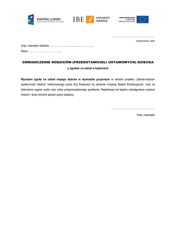………………………………………… /miejscowość, data/ Imię i nazwisko dziecka ............................................................ Klasa ……………………………….. OŚWIADCZENIE RODZICÓW (PRZEDSTAWICIELI USTAWOWYCH) DZIECKA o zgodzie na udział w badaniach Wyrażam zgodę na udział mojego dziecka w wywiadzie grupowym w ramach projektu „Szkoła-rodzicespołeczność lokalna” realizowanego przez Erę Ewaluacji na zlecenie Instytutu Badań Edukacyjnych, oraz na dokonanie nagrań audio oraz video przeprowadzonego spotkania. Rejestracja nie będzie udostępniana osobom trzecim i służy kontroli jakości pracy badaczy. …………………………………………. Imię i nazwisko