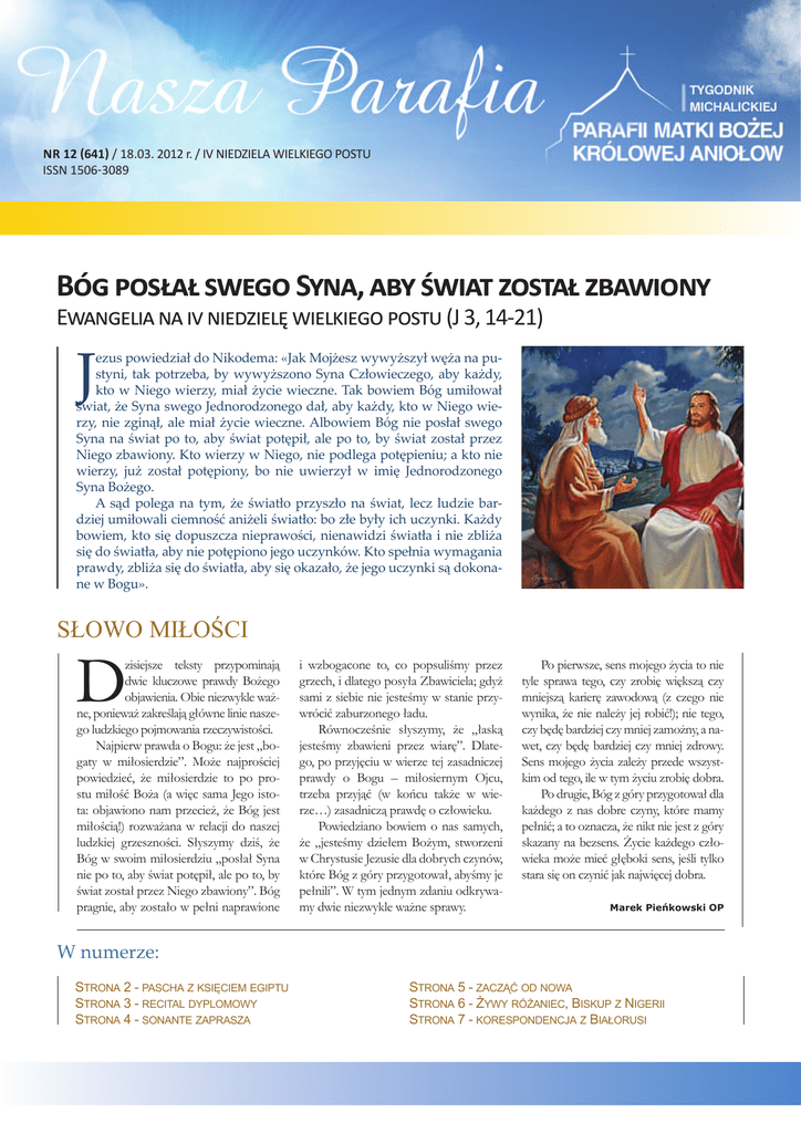 NR 12 •641• / 18.03. 2012 r. / IV NIEDZIELA WIELKIEGO POSTU ISSN 1506!3089 B!" #$%&'& %()"$ S*+', '-* .(/'0 3$%0'& 3-'(/$+* E"#$%&'(# $# () $(&*+(&', "(&'-(&%4 74:;< (J 3, 14-21) J ezus powiedział do Nikodema: «Jak Mojżesz wywyższył węża na pustyni, tak potrzeba, by wywyższono Syna Człowieczego, aby każdy, kto w Niego wierzy, miał życie wieczne. Tak bowiem Bóg umiłował świat, że Syna swego Jednorodzonego dał, aby każdy, kto w Niego wierzy, nie zginął, ale miał życie wieczne. Albowiem Bóg nie posłał swego Syna na świat po to, aby świat potępił, ale po to, by świat został przez Niego zbawiony. Kto wierzy w Niego, nie podlega potępieniu; a kto nie wierzy, już został potępiony, bo nie uwierzył w imię Jednorodzonego Syna Bożego. A sąd polega na tym, że światło przyszło na świat, lecz ludzie bardziej umiłowali ciemność aniżeli światło: bo złe były ich uczynki. Każdy bowiem, kto się dopuszcza nieprawości, nienawidzi światła i nie zbliża się do światła, aby nie potępiono jego uczynków. Kto spełnia wymagania prawdy, zbliża się do światła, aby się okazało, że jego uczynki są dokonane w Bogu». SŁOWO MIŁOŚCI D zisiejsze teksty przypominają dwie kluczowe prawdy Bożego objawienia. Obie niezwykle ważne, ponieważ zakreślają główne linie naszego ludzkiego pojmowania rzeczywistości. Najpierw prawda o Bogu: że jest „bogaty w miłosierdzie”. Może najprościej powiedzieć, że miłosierdzie to po prostu miłość Boża (a więc sama Jego istota: objawiono nam przecież, że Bóg jest miłością!) rozważana w relacji do naszej ludzkiej grzeszności. Słyszymy dziś, że Bóg w swoim miłosierdziu „posłał Syna nie po to, aby świat potępił, ale po to, by świat został przez Niego zbawiony”. Bóg pragnie, aby zostało w pełni naprawione i wzbogacone to, co popsuliśmy przez grzech, i dlatego posyła Zbawiciela; gdyż sami z siebie nie jesteśmy w stanie przywrócić zaburzonego ładu. Równocześnie słyszymy, że „łaską jesteśmy zbawieni przez wiarę”. Dlatego, po przyjęciu w wierze tej zasadniczej prawdy o Bogu – miłosiernym Ojcu, trzeba przyjąć (w końcu także w wierze…) zasadniczą prawdę o człowieku. Powiedziano bowiem o nas samych, że „jesteśmy dziełem Bożym, stworzeni w Chrystusie Jezusie dla dobrych czynów, które Bóg z góry przygotował, abyśmy je pełnili”. W tym jednym zdaniu odkrywamy dwie niezwykle ważne sprawy. Po pierwsze, sens mojego życia to nie tyle sprawa tego, czy zrobię większą czy mniejszą karierę zawodową (z czego nie wynika, że nie należy jej robić!); nie tego, czy będę bardziej czy mniej zamożny, a nawet, czy będę bardziej czy mniej zdrowy. Sens mojego życia zależy przede wszystkim od tego, ile w tym życiu zrobię dobra. Po drugie, Bóg z góry przygotował dla każdego z nas dobre czyny, które mamy pełnić; a to oznacza, że nikt nie jest z góry skazany na bezsens. Życie każdego człowieka może mieć głęboki sens, jeśli tylko stara się on czynić jak najwięcej dobra. Marek Pieńkowski OP W numerze: STRONA 2 - PASCHA Z KSIĘCIEM EGIPTU STRONA 3 - RECITAL DYPLOMOWY STRONA 4 - SONANTE ZAPRASZA STRONA 5 - ZACZĄĆ OD NOWA STRONA 6 - ŻYWY RÓŻANIEC, BISKUP Z NIGERII STRONA 7 - KORESPONDENCJA Z BIAŁORUSI Nasza Parafia nr 12/2012 PASCHA Z KSIĘCIEM EGIPTU NOWY MUSICAL J uż wkrótce Niedziela Palmowa Kościół przywdziewa się w purpurę, która symbolizuje krew i męczeństwo. Zbliżamy się do najważniejszych wydarzeń, jakimi są dla chrześcijanina Męka, Śmierć i Zmartwychwstanie Jezusa Chrystusa. Są to dni, podczas których nie tylko rozmyślamy nad ogromem miłości Boga do człowieka, ale staramy się również dać zewnętrzny wyraz naszym przeżyciom; na nowo rozważyć to, co zaważyło na losach całej ludzkości i każdego, pojedynczego człowieka - i co dokonuje się aż do tej pory. Aby sięgnąć do korzeni tych zbawczych wydarzeń, zrozumieć ich znaczenie i sens, trzeba zagłębić się najpierw w Stary Testament - konkretnie - w Księgę Wyjścia. Trzeba poznać (lub przypomnieć sobie) dzieje Mojżesza, historię wyjścia narodu wybranego z niewoli egipskiej - wreszcie - odnaleźć znaczenie Paschy w życiu Izraelitów. Kolejny krok, to zrozumieć w tym kontekście wydarzenia, które miały miejsce w Wieczerniku i na Golgocie; odnaleźć ich duchowy wymiar i łączność z historią, o której mówi Księga Wyjścia. Temu wszystkiemu ma służyć przygotowany i wystawiany przez młodzież i studentów naszej parafii (twórców muzycznych Jasełek 2010 i Pasji 2011) musical pt. „Mojżesz”. Na utwór składają się: Prolog, osiem Scen oraz Epilog. Dzięki nim poznajemy losy Izraelitów w niewoli egipskiej, dzieje Mojżesza, jesteśmy świadkami objawienia się Jahwe Mojżeszowi. Widzimy spór Mojżesza z faraonem, plagi - wreszcie - śledzimy z napięciem ucieczkę z Egiptu, przejście przez Morze Czerwone, by na koniec usłyszeć znamienne słowa, oczywiście, jak na musical przystało, wyśpiewane żywo i z mocą: Bo cuda dzieją się Gdy wierzysz w nie Gdyś pragnął ich i o nich śnił Więc może sprawisz je Któregoś dnia Gdy wierzysz w nie Ze wszystkich sił Gdy zawsze wierzysz w nie I w swej nadziei trwasz... str. 2 Może ktoś zapytać: dlaczego akurat te wydarzenia przywołujemy w Niedzielę Palmową - niedzielę Męki i Śmierci Jezusa? Najpierw zatrzymajmy się na znaczeniach i symbolach. Święto Paschy (hebr. Pesach - przejście) przypada 14 nissan kalendarza żydowskiego (marzec/kwiecień) po zachodzie słońca. Jest ono ściśle związane z następującym bezpośrednio po nim siedmiodniowym Świętem Przaśników i traktowane jako całość. Od czasu, kiedy zbudowano świątynię w Jerozolimie, Pascha stała sie jednym z tzw. świąt pielgrzymich. Święto Paschy upamiętnia noc, kiedy Izraelici upuścili Egipt, miejsce swojej niewoli. W ostatni wieczór, przed wyjściem z Egiptu