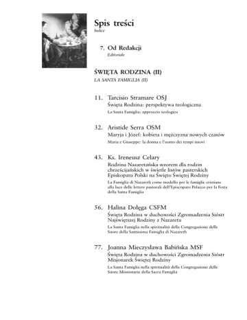 Spis treści Indice 7. Od Redakcji Editoriale ŚWIĘTA RODZINA (II) LA SANTA FAMIGLIA (II) 11. Tarcisio Stramare OSJ Święta Rodzina: perspektywa teologiczna La Santa Famiglia: approccio teologico 32. Aristide Serra OSM Maryja i Józef: kobieta i mężczyzna nowych czasów Maria e Giuseppe: la donna e l’uomo dei tempi nuovi 43. Ks. Ireneusz Celary Rodzina Nazaretańska wzorem dla rodzin chrześcijańskich w świetle listów pasterskich Episkopatu Polski na Święto Świętej Rodziny La Famiglia di Nazareth come modello per le famiglie cristiane alla luce delle lettere pastorali dell’Episcopato Polacco per la Festa della Santa Famiglia 56. Halina Dołęga CSFM Święta Rodzina w duchowości Zgromadzenia Sióstr Najświętszej Rodziny z Nazaretu La Santa Famiglia nella spiritualità della Congregazione delle Suore della Santissima Famiglia di Nazareth 77. Joanna Mieczysława Babińska MSF Święta Rodzina w duchowości Zgromadzenia Sióstr Misjonarek Świętej Rodziny La Santa Famiglia nella spiritualità della Congregazione delle Suore Missionarie della Sacra Famiglia 100. Zofia Bator Święta Rodzina w chrześcijańskiej ikonografii La Santa Famiglia nell’iconografia cristiana 131. Roman Mazurkiewicz „Święta Rodzina” w dawnej poezji polskiej “La Santa Famiglia” nella poesia antica polacca 166. Ks. Jerzy Cedrowski Kult Świętej Rodziny w sanktuarium w Studziannie Il culto della Santa Famiglia nel santuario di Studzianna 182. Ks. Marek Lis Święta Rodzina z Nazaretu: filmowe kroniki i fantazje La Santa Famiglia di Nazareth nei film ŚCIEŻKI MARIOLOGII WSPÓŁCZESNEJ SENTIERI DELLA MARIOLOGIA CONTEMPORANEA 195. Ks. Wacław Siwak Jaka Maryja dla XXI wieku? Maryja w korelacjach z Bogiem, Kościołem i człowiekiem Quale Maria per XXI secolo? Maria in correlazione con Dio, Chiesa e l’uomo MISCELLANEA 251. Michele G. Masciarelli Zrodzony z niewiasty, zrodzony pod prawem. Materiały dla katechezy Nato da donna, nato sotto la legge. Appunti per la Catechesi 277. Angelo Amato SDB Maryja i postmodernizm Maria e la post-modernità DOKUMENTY DOCUMENTI 295. Bp Zbigniew Kiernikowski W tajemnicy Niepokalanej pełnia nowego stworzenia. List pasterski na Uroczystość Niepokalanego Poczęcia Najświętszej Maryi Panny, w 150 rocznicę ogłoszenia dogmatu (2004 r.) 302. Bp Antoni Dydycz Bądź pozdrowiona, pełna łaski (Łk 1, 28). List pasterski Biskupa Drohiczyńskiego na drugą niedzielę Adwentu (2004 r.) 305. Kard. Joachim Meisner List pasterski z okazji 150 rocznicy ogłoszenia dogmatu o Niepokalanym Poczęciu Maryi i z okazji Roku Eucharystii (2004 r.) INFORMACJE NOTIZIE 311. Międzynarodowe sympozjum o Maryjnym współodkupicielstwie (Fatima, 15-17 VII 2009 r.) 311. Powstanie Czeskiej Akademii ChrystologicznoMariologicznej 311. Mariologiczne sympozjum Azji i Oceanii (Lipa City, Filipiny, 12-16 IX 2009 r.) 312. Kongres Maryjno-Mariologiczny w Celaya (4-8 IX 2009 r.) 313. Sympozjum mariologów francuskich (Merville, 7-10 IX 2009 r.) 313. Nowa przewodnicząca Francuskiego Towarzystwa Studiów Maryjnych 314. Sympozjum o Wniebowzięciu Maryi (Rzym, 6-9 X 2009 r.) 314. Sympozjum o bł. Janie Dunsie Szkocie (Niepokalanów, 16 X 2009 r.)