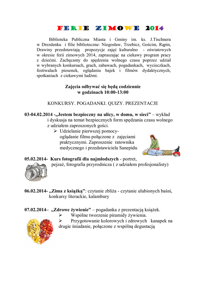 FERIE ZIMOWE 2014 Biblioteka Publiczna Miasta i Gminy im. ks. J.Tischnera w Drezdenku i filie biblioteczne: Niegosław, Trzebicz, Gościm, Rąpin, Drawiny przedstawiają propozycje zajęć kulturalno - oświatowych w okresie ferii zimowych 2014, zapraszając na ciekawy program pracy z dziećmi. Zachęcamy do spędzenia wolnego czasu poprzez udział w wybranych konkursach, grach, zabawach, pogadankach, wycieczkach, festiwalach piosenek, oglądaniu bajek i filmów dydaktycznych, spotkaniach z ciekawymi ludźmi. Zajęcia odbywać się będą codziennie w godzinach 10:00-13:00 KONKURSY. POGADANKI. QUIZY. PREZENTACJE 03-04.02.2014 -„Jestem bezpieczny na ulicy, w domu, w sieci” – wykład i dyskusja na temat bezpiecznych form spędzania czasu wolnego z udziałem zaproszonych gości. Udzielanie pierwszej pomocyoglądanie filmu połączone z zajęciami praktycznymi. Zaproszenie ratownika medycznego i przedstawiciela Sanepidu 05.02.2014- Kurs fotografii dla najmłodszych - portret, pejzaż, fotografia przyrodnicza ( z udziałem profesjonalisty) 06.02.2014- ,,Zima z książką”: czytanie zbliża - czytanie ulubionych baśni, konkursy literackie, kalambury 07.02.2014– ,,Zdrowe żywienie” – pogadanka z prezentacją książek. Wspólne tworzenie piramidy żywienia. Przygotowanie kolorowych i zdrowych kanapek na drugie śniadanie, połączone z wspólną degustacją 10.02.2014– ,,W drodze do Pacanowa – dzień z Koziołkiem Matołkiem” zajęcia literacko - plastyczne poświęcone twórczości Kornela Makuszyńskiego w 130 rocznicę urodzin autora 11.02.2014 - Zajęcia teatralne-- przygotowanie przedstawienia teatralnego ,,Królowa śniegu” 12.02.2014- ,,Mam talent”- zaproszenie młodych talentów z dziedziny muzyki, śpiewu i recytacji połączone z warsztatami dla uczestników zajęć 13.02.2014 – ,,Ptasia stołówka zimą” – projekcja filmu oraz dyskusja o dokarmianiu ptaków zimą Zbiórka pokarmu dla ptaków Karmnik – wykonanie z butelki plastikowej Wycieczka do lasu, dokarmianie zwierząt 14.02.2014- Dzień uśmiechu i miłości – życzenia i serduszka dla sympatii na Walentynki 03.02. – 14.02.2014 – Kwadranse informatyczne - sposoby wyszukiwania informacji Codzienna projekcja wybranych przez dzieci bajek i filmów video. Przyjmowanie wycieczek dzieci i młodzieży przebywających na zimowiskach Wspólne wyjścia z dziećmi do innych placówek kultury 03.02. – 14.02.2014 – Środowiskowe rozgrywki tenisa stołowego z udziałem mistrzów drezdeneckich (w trzech kategoriach wiekowych) 14.02.2014 – Wystawa prac pokonkursowych połączona z zakończeniem ferii zimowych.