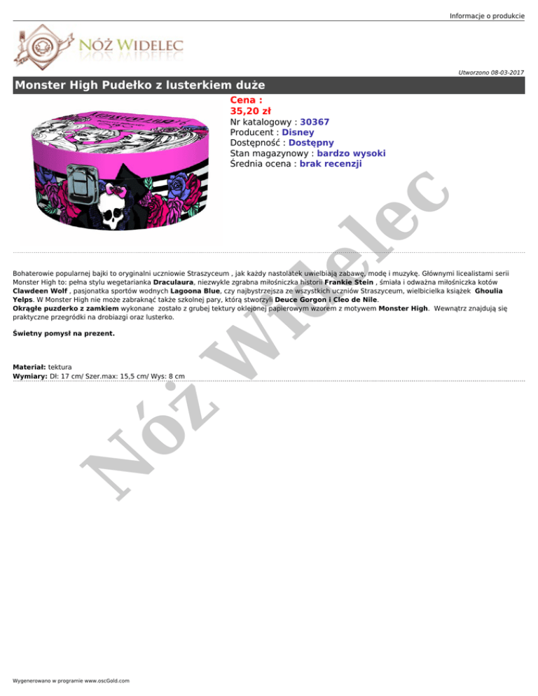 Informacje o produkcie Utworzono 08-03-2017 Monster High Pudełko z lusterkiem duże Cena : 35,20 zł id e le c Nr katalogowy : 30367 Producent : Disney Dostępność : Dostępny Stan magazynowy : bardzo wysoki Średnia ocena : brak recenzji Bohaterowie popularnej bajki to oryginalni uczniowie Straszyceum , jak każdy nastolatek uwielbiają zabawę, modę i muzykę. Głównymi licealistami serii Monster High to: pełna stylu wegetarianka Draculaura, niezwykle zgrabna miłośniczka historii Frankie Stein , śmiała i odważna miłośniczka kotów Clawdeen Wolf , pasjonatka sportów wodnych Lagoona Blue, czy najbystrzejsza ze wszystkich uczniów Straszyceum, wielbicielka książek Ghoulia Yelps. W Monster High nie może zabraknąć także szkolnej pary, którą stworzyli Deuce Gorgon i Cleo de Nile. Okrągłe puzderko z zamkiem wykonane zostało z grubej tektury oklejonej papierowym wzorem z motywem Monster High. Wewnątrz znajdują się praktyczne przegródki na drobiazgi oraz lusterko. W Świetny pomysł na prezent. N óż Materiał: tektura Wymiary: Dł: 17 cm/ Szer.max: 15,5 cm/ Wys: 8 cm Wygenerowano w programie www.oscGold.com