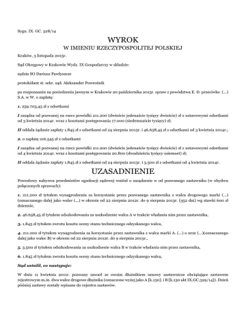 Sygn. IX. GC. 328/14 WYROK W IMIENIU RZECZYPOSPOLITEJ POLSKIEJ Kraków, 3 listopada 2015r. Sąd Okręgowy w Krakowie Wydz. IX Gospodarczy w składzie: sędzia SO Dariusz Pawłyszcze protokólant st. sekr. sąd. Aleksander Powroźnik po rozpoznaniu na posiedzeniu jawnym w Krakowie 20 października 2015r. spraw z powództwa E. D. przeciwko (...) S.A. w W. o zapłatę: 1. 259.703,45 zł z odsetkami I zasądza od pozwanej na rzecz powódki 211.200 (dwieście jedenaście tysięcy dwieście) zł z ustawowymi odsetkami od 3 kwietnia 2014r. wraz z kosztami postępowania 17.000 (siedemnaście tysięcy) zł; II oddala żądanie zapłaty 1.845 zł z odsetkami od 24 sierpnia 2013r. i 46.658,45 zł z odsetkami od 3 kwietnia 2014r.; 2. o zapłatę 216.545 zł z odsetkami I zasądza od pozwanej na rzecz powódki 211.200 (dwieście jedenaście tysięcy dwieście) zł z ustawowymi odsetkami od 4 kwietnia 2014r. wraz z kosztami postępowania 20.800 (dwadzieścia tysięcy osiemset) zł; II oddala żądanie zapłaty 1.845 zł z odsetkami od 24 sierpnia 2013r. i 3.500 zł z odsetkami od 4 kwietnia 2014r. UZASADNIENIE Powodowy nabywca przedmiotów egzekucji sądowej wniósł o zasądzenie w od pozwanego zastawnika (w obydwu połączonych sprawach): 1. 211.200 zł tytułem wynagrodzenia za korzystanie przez pozwanego zastawnika z walca drogowego marki (...) (oznaczanego dalej jako walec (...) w okresie od 22 sierpnia 2012r. do 9 sierpnia 2013r. (352 dni) wg stawki 600 zł dziennie, 2. 46.658,45 zł tytułem odszkodowania za uszkodzenie walca A w trakcie władania nim przez zastawnika, 3. 1.845 zł tytułem zwrotu kosztu oceny stanu technicznego odzyskanego walca, 4. 211.200 zł tytułem wynagrodzenia za korzystanie przez zastawnika z walca marki A. (...) o nrze (...)(oznaczanego dalej jako walec B) w okresie od 22 sierpnia 2012r. do 9 sierpnia 2013r., 5. 3.500 zł tytułem odszkodowania za uszkodzenie walca B w trakcie władania nim przez zastawnika, 6. 1.845 zł tytułem zwrotu kosztu oceny stanu technicznego odzyskanego walca, Sąd ustalił, co następuje: W dniu 11 kwietnia 2011r. pozwany zawarł ze swoim dłużnikiem umowy zastawnicze obciążające zastawem rejestrowym m.in. dwa walce drogowe dłużnika (oznaczone wyżej jako A [k.130]. i B [k.130 akt IX.GC.329/14]). Dzień później zastawy zostały wpisane do rejestru zastawów. Umowami z 4 kwietnia i 10 czerwca 2011r. dłużnik zawarł umowy zastawnicze z konsorcjum pięciu banków spółdzielczych [k.4,6 akt Km.4225/12], którymi na rzecz B. S.w Z. (działającego na rzecz pozostałych uczestników konsorcjum) ustanowił zastaw rejestrowy na innych trzech walcach i na koparce gąsienicowej [wpisy do RZ k.9-19 akt Km.4225/12]. W maju i czerwcu 2012r. w toku egzekucji prowadzonej z wniosku BS w Z. (oznaczanego dalej jako wierzyciel egzekwujący) przeciwko zastawcy komornik zajął koparkę i jeden z walców zastawionych na rzecz wierzyciela egzekwującego [protokół ponownego zajęcia z 26 czerwca 2012r. k.35 akt Km.4225/12]. Pismem 27 czerwca 2012r. [k.38 akt Km.4225/12] wierzyciel egzekwujący wniósł o sprzedaż komisową zajętej koparki i walca oraz dwóch pozostałych walców zastawionych na rzecz wierzyciela egzekwującego. Pismem z 2 lipca 2012r. [k.39 akt Km.4225/12]] komornik zawiadomił pozwanego zastawnika o zajęciu koparki (pozwany miał zastaw rejestrowy także na tej koparce) i w tym samym dniu obwieścił o licytacji [k.42 akt Km.4225/12] koparki i jednego walca oraz złożył ofertę sprzedaży komisowej [k.43-44] drugiego walca (żaden z walców nie był zastawiony na rzecz pozwanego). W dniu 20 lipca 2012r. komornik sprzedał koparkę i walec [protokół k.79bis akt Km.4225/12]. W dniu 21 lipca 2012r. w toku tej samej egzekucji (z wniosku BS w Z.) komornik zajął m.in. walce A i B [protokół zajęcia k.85 akt Km.4225/12 poz.1,4] i oddał je pod dozór (...) odział w R. (maszyny zostały zajęte na drodze zarządzanej przez (...)). Komornik wyznaczył licytację na 2 sierpnia 2012r. na g. 14.00 [k.96 akt Km.4225/12]. W dniu licytacji do kancelarii komornika wpłynęło pismo [k.109 akt Km.4225/12] dłużnika (zastawcy) zawiadamiające o zastawach na walcach na rzecz pozwanego. W tym samym dniu komornik sporządził zawiadomienie dla pozwanego o zajęciu bez informacji o dacie zajęcia [k.119 akt Km.4225/12] i złożył ofertę sprzedaży komisowej walców [k.126-127]. Dzień później, tj. 3 sierpnia 2012r., komornik sporządził obwieszczenie [k.130 akt Km.4225/12] o licytacji walców w dniu 20 sierpnia 2012r. i anulował ofertę sprzedaży komisowej [k.131 akt Km.4225/12], lecz nie zawiadomił pozwanego zastawnika o licytacji. W dniu 10 sierpnia 2012r. do kancelarii komornika wpłynał wniosek pozwanego o zwolnienie walców spod zajęcia [k.174 akt Km.4225/12 poz.2,3] ze względu na zamiar przejęcia walców na własność zgodnie z umowami zastawniczymi. Na licytacji w dniu 20 sierpnia 2012r. obydwa walce (A i B) nabył powód [protokół k.224 akt Km.4225/12] za cenę 97.500 zł (walec A) i 78.750 zł (B) i w tym samym dniu komornik zwrócił się do dozorcy ( (...)) o wydanie walców powodowemu nabywcy [k.228]. W dniu licytacji do kancelarii komornika wpłynęło pismo pozwanego zastawnika z datą 16 sierpnia 2012r. [k.229 akt Km.4225/12] podtrzymujące wniosek o zwolnienie walców spod zajęcia. Do pisma pozwany dołączył oświadczenia z 1 sierpnia 2012r. o przejęciu walców na własność na mocy umów zastawniczych [k.231,235 akt Km.4225/12] oraz protokoły ich wydania przez dłużnika w dniu 1 sierpnia 2012r. [k.232,236 akt Km.4225/12]. Pismem z 23 sierpnia 2012r. [k.260 akt Km.4225/12] komornik zawiadomił zastawnika o dacie zajęcia walców (21 lipca 2012r.) i ich sprzedaży w dniu 20 sierpnia 2012r. Okazało się, że pozwany już 1 sierpnia 2012r. powołując się na zastaw rejestrowy oświadczył dozorcy zatrudnionemu przez (...) Sp. z o.o. (pilnującą maszyn na zlecenie (...)), że ma prawo do zabrania walców 