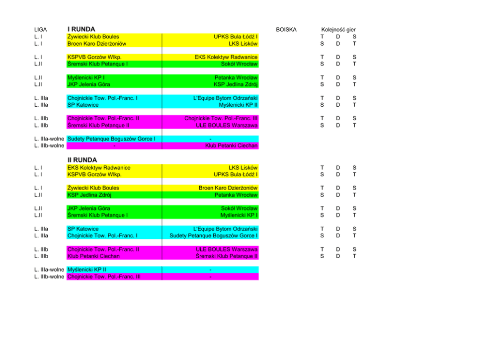 I RUNDA LIGA L. I L. I śywiecki Klub Boules Broen Karo DzierŜoniów UPKS Bula Łódź I LKS Lisków L. I L.II KSPVB Gorzów Wlkp. Śremski Klub Petanque I EKS Kolektyw Radwanice Sokół Wrocław T S D D S T L.II L.II Myślenicki KP I JKP Jelenia Góra Petanka Wrocław KSP Jedlina Zdrój T S D D S T L. IIIa L. IIIa Chojnickie Tow. Pol.-Franc. I SP Katowice L'Equipe Bytom Odrzański Myślenicki KP II T S D D S T L. IIIb L. IIIb Chojnickie Tow. Pol.-Franc. II Śremski Klub Petanque II Chojnickie Tow. Pol.-Franc. III ULE BOULES Warszawa T S D D S T LKS Lisków UPKS Bula Łódź I T S D D S T Broen Karo DzierŜoniów Petanka Wrocław T S D D S T Sokół Wrocław Myślenicki KP I T S D D S T L. IIIa-wolne Sudety Petanque Boguszów Gorce I L. IIIb-wolne - BOISKA Kolejność gier T D S S D T Klub Petanki Ciechan II RUNDA L. I L. I EKS Kolektyw Radwanice KSPVB Gorzów Wlkp. L. I L.II śywiecki Klub Boules KSP Jedlina Zdrój L.II L.II JKP Jelenia Góra Śremski Klub Petanque I L. IIIa L. IIIa SP Katowice Chojnickie Tow. Pol.-Franc. I L'Equipe Bytom Odrzański Sudety Petanque Boguszów Gorce I T S D D S T L. IIIb L. IIIb Chojnickie Tow. Pol.-Franc. II Klub Petanki Ciechan ULE BOULES Warszawa Śremski Klub Petanque II T S D D S T L. IIIa-wolne Myślenicki KP II L. IIIb-wolne Chojnickie Tow. Pol.-Franc. III - III RUNDA L. I L. I Broen Karo DzierŜoniów śywiecki Klub Boules L. I L.II UPKS Bula Łódź I Myślenicki KP I L.II L.II Śremski Klub Petanque I Sokół Wrocław L. IIIa L. IIIa Sudety Petanque Boguszów Gorce I L'Equipe Bytom Odrzański L. IIIb L. IIIb Chojnickie Tow. Pol.-Franc. III Chojnickie Tow. Pol.-Franc. II L. IIIa-wolne Chojnickie Tow. Pol.-Franc. I L. IIIb-wolne - KSPVB Gorzów Wlkp. LKS Lisków T S D D S T EKS Kolektyw Radwanice JKP Jelenia Góra T S D D S T Petanka Wrocław KSP Jedlina Zdrój T S D D S T SP Katowice Myślenicki KP II T S D D S T ULE BOULES Warszawa Klub Petanki Ciechan T S D D S T KSPVB Gorzów Wlkp. Broen Karo DzierŜoniów T S D D S T UPKS Bula Łódź I JKP Jelenia Góra T S D D S T Myślenicki KP I Sokół Wrocław T S D D S T Śremski Klub Petanque II IV RUNDA L. I L. I śywiecki Klub Boules EKS Kolektyw Radwanice L. I L.II LKS Lisków Śremski Klub Petanque I L.II L.II KSP Jedlina Zdrój Petanka Wrocław L. IIIa L. IIIa Chojnickie Tow. Pol.-Franc. I Myślenicki KP II SP Katowice Sudety Petanque Boguszów Gorce I T S D D S T L. IIIb L. IIIb Klub Petanki Ciechan Chojnickie Tow. Pol.-Franc. II Chojnickie Tow. Pol.-Franc. III Śremski Klub Petanque II T S D D S T L. IIIa-wolne L. IIIb-wolne ULE BOULES Warszawa L'Equipe Bytom Odrzański - V RUNDA L. I L. I UPKS Bula Łódź I LKS Lisków L. I L.II śywiecki Klub Boules Sokół Wrocław L.II L.II Petanka Wrocław Śremski Klub Petanque I L. IIIa L. IIIa L'Equipe Bytom Odrzański Chojnickie Tow. Pol.-Franc. I L. IIIb L. IIIb ULE BOULES Warszawa Śremski Klub Petanque II L. IIIa-wolne L. IIIb-wolne Chojnickie Tow. Pol.-Franc. II Broen Karo DzierŜoniów KSPVB Gorzów Wlkp. T S D D S T EKS Kolektyw Radwanice Myślenicki KP I T S D D S T JKP Jelenia Góra KSP Jedlina Zdrój T S D D S T Sudety Petanque Boguszów Gorce I Myślenicki KP II T S D D S T Klub Petanki Ciechan Chojnickie Tow. Pol.-Franc. III T S D D S T SP Katowice -