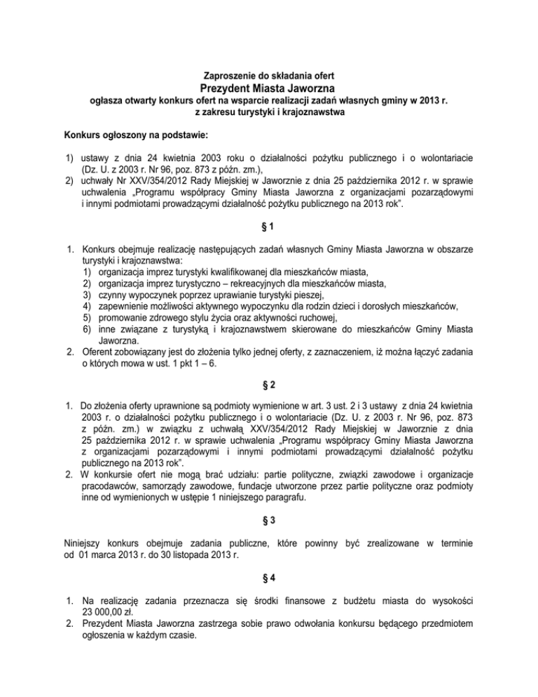 Zaproszenie do składania ofert Prezydent Miasta Jaworzna ogłasza otwarty konkurs ofert na wsparcie realizacji zadań własnych gminy w 2013 r. z zakresu turystyki i krajoznawstwa Konkurs ogłoszony na podstawie: 1) ustawy z dnia 24 kwietnia 2003 roku o działalności pożytku publicznego i o wolontariacie (Dz. U. z 2003 r. Nr 96, poz. 873 z późn. zm.), 2) uchwały Nr XXV/354/2012 Rady Miejskiej w Jaworznie z dnia 25 października 2012 r. w sprawie uchwalenia „Programu współpracy Gminy Miasta Jaworzna z organizacjami pozarządowymi i innymi podmiotami prowadzącymi działalność pożytku publicznego na 2013 rok”. §1 1. Konkurs obejmuje realizację następujących zadań własnych Gminy Miasta Jaworzna w obszarze turystyki i krajoznawstwa: 1) organizacja imprez turystyki kwalifikowanej dla mieszkańców miasta, 2) organizacja imprez turystyczno – rekreacyjnych dla mieszkańców miasta, 3) czynny wypoczynek poprzez uprawianie turystyki pieszej, 4) zapewnienie możliwości aktywnego wypoczynku dla rodzin dzieci i dorosłych mieszkańców, 5) promowanie zdrowego stylu życia oraz aktywności ruchowej, 6) inne związane z turystyką i krajoznawstwem skierowane do mieszkańców Gminy Miasta Jaworzna. 2. Oferent zobowiązany jest do złożenia tylko jednej oferty, z zaznaczeniem, iż można łączyć zadania o których mowa w ust. 1 pkt 1 – 6. §2 1. Do złożenia oferty uprawnione są podmioty wymienione w art. 3 ust. 2 i 3 ustawy z dnia 24 kwietnia 2003 r. o działalności pożytku publicznego i o wolontariacie (Dz. U. z 2003 r. Nr 96, poz. 873 z późn. zm.) w związku z uchwałą XXV/354/2012 Rady Miejskiej w Jaworznie z dnia 25 października 2012 r. w sprawie uchwalenia „Programu współpracy Gminy Miasta Jaworzna z organizacjami pozarządowymi i innymi podmiotami prowadzącymi działalność pożytku publicznego na 2013 rok”. 2. W konkursie ofert nie mogą brać udziału: partie polityczne, związki zawodowe i organizacje pracodawców, samorządy zawodowe, fundacje utworzone przez partie polityczne oraz podmioty inne od wymienionych w ustępie 1 niniejszego paragrafu. §3 Niniejszy konkurs obejmuje zadania publiczne, które powinny być zrealizowane w terminie od 01 marca 2013 r. do 30 listopada 2013 r. §4 1. Na realizację zadania przeznacza się środki finansowe z budżetu miasta do wysokości 23 000,00 zł. 2. Prezydent Miasta Jaworzna zastrzega sobie prawo odwołania konkursu będącego przedmiotem ogłoszenia w każdym czasie. 3. W latach ubiegłych na zadania tego typu przeznaczono: 1) w 2012 roku kwotę 23 000,00 zł dla następujących podmiotów: a) Polski Związek Emerytów, Rencistów i Inwalidów – 1 000,00 zł, b) Stowarzyszenie Emerytów, Rencistów i Inwalidów „Wigor” - 1 000,00 zł, c) OSP „Ciężkowice” - 2 000,00 zł, d) Polskie Towarzystwo Tatrzańskie – 9 500,00 zł, e) PTTK – 9 000,00 zł, f) Klub Inteligencji Katolickiej – 500,00 zł. 2) w 2011 roku kwotę 24 000,00 zł dla następujących podmiotów: a) Stowarzyszenie Absolwentów i Sympatyków Jedynki – 1 500,00 zł, b) ZHP – 4 000,00 zł, c) Polskie Towarzystwo Tatrzańskie – 6 850,00 zł, d) PTTK – 7 650,00 zł, e) Klub Inteligencji Katolickiej – 2 500,00 zł, f) UKS „K-2” - 1 500,00 zł. 4. W wyniku rozpatrzenia zgłoszonych ofert Prezydent Miasta Jaworzna może zlecić zadanie określone w § 1 jednemu lub kilku wykonawcom w granicach łącznej kwoty wymienionej w § 4 ust. 1 zaproszenia. 5. W przypadku, gdy suma dofinansowania zgłoszonych ofert przekroczy wysokość środków przeznaczonych na realizację zadania, organizator konkursu zastrzega sobie możliwość proporcjonalnego zmniejszenia dofinansowania stosownie do posiadanych środków. W takiej sytuacji dopuszcza się możliwość częściowej zmiany oferty. 6. Przyznana dotacja może pokryć do 90% kosztów zadania, pozostałe środki zabezpiecza wnioskodawca. §5 Złożone w ramach konkursu oferty oceniane będą pod względem formalnym, zgodnie z poniższymi kryteriami. 1. Oferta konkursowa powinna być złożona w terminie i miejscu określonym w ogłoszeniu otwartego konkursu ofert. 2. Formularz oferty konkursowej powinien być zgodny z wzorem oferty, który stanowi załącznik do rozporządzenia Ministra Polityki Społecznej z dnia 15 grudnia 2010 r. w sprawie wzoru oferty i ramowego wzoru umowy dotyczących realizacji zadania publicznego oraz wzoru sprawozdania z wykonania tego zadania (Dz. U. z 2011 r. Nr 6, poz. 25 ). Wzór formularza oferty dostępny jest do pobrania na stronie www.jaworzno.pl/pl/nasze_miasto/organizacje_pozarzadowe. 3. Oferta powinna zawierać: a) szczegółowy zakres rzeczowy zadania publicznego proponowanego do realizacji, b) termin i miejsce realizacji zadania publicznego, c) kalkulację przewidywanych kosztów realizacji zadania publicznego, d) informację o wcześniejszej działalności organizacji pozarządowej lub podmiotów wymienionych w art. 3 ust. 3 ustawy składających ofertę w zakresie, którego dotyczy zadanie publiczne, e) informację o posiadanych zasobach rzeczowych i kadrowych zapewniających wykonanie zadania publicznego oraz o planowanej wysokości środków finansowych na realizację danego zadania pochodzących z innych źródeł, f) deklarację o zamiarze odpłatnego lub nieodpłatnego wykonania zadania publicznego, g) inne informacje wymagane zgodnie z niniejszym ogłoszeniem. 4. Oferta konkursowa powinna być sporządzona w języku polskim, pismem maszynowym (komputerowo) lub odręcznie drukowanymi literami. 5. Zadanie przedstawione we wniosku musi być zgodne ze statutem organizacji występującej o dotację oraz tematyką konkursu ofert. 2 6. Do oferty konkursowej należy dołączyć: a) kserokopię aktualnego zgodnego ze stanem faktycznym i prawnym odpisu z rejestru KRS lub innego rejestru (ewidencji) dla podmiotów, które nie podlegają obowiązkowi wpisu do KRS, b) dokument stwierdzający upoważnienie do reprezentowania organizacji, c) ośw