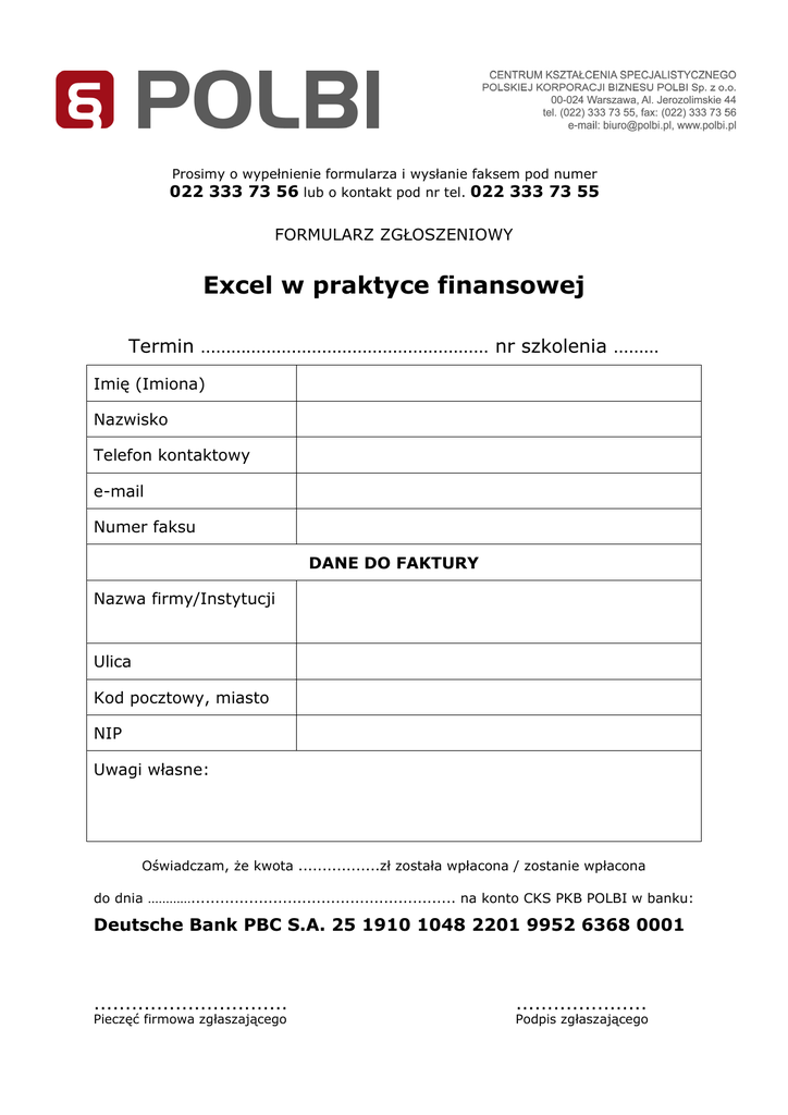 Prosimy o wypełnienie formularza i wysłanie faksem pod numer 022 333 73 56 lub o kontakt pod nr tel. 022 333 73 55 FORMULARZ ZGŁOSZENIOWY Excel w praktyce finansowej Termin ………………………………………………… nr szkolenia ……… Imię (Imiona) Nazwisko Telefon kontaktowy e-mail Numer faksu DANE DO FAKTURY Nazwa firmy/Instytucji Ulica Kod pocztowy, miasto NIP Uwagi własne: Oświadczam, Ŝe kwota .................zł została wpłacona / zostanie wpłacona do dnia …………....................................................... na konto CKS PKB POLBI w banku: Deutsche Bank PBC S.A. 25 1910 1048 2201 9952 6368 0001 ............................... ..................... Pieczęć firmowa zgłaszającego Podpis zgłaszającego