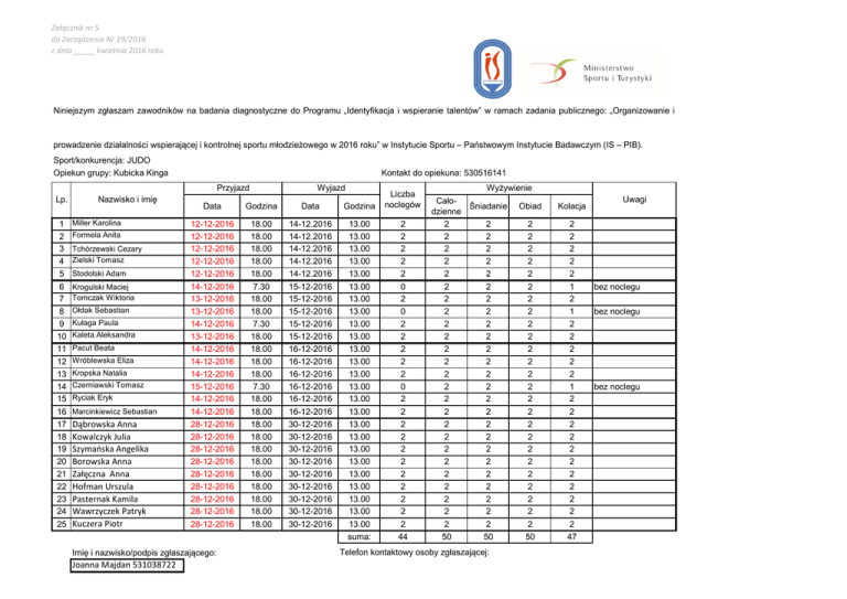 Załącznik nr 5 do Zarządzenia Nr 19/2016 z dnia _____ kwietnia 2016 roku Niniejszym zgłaszam zawodników na badania diagnostyczne do Programu „Identyfikacja i wspieranie talentów” w ramach zadania publicznego: „Organizowanie i prowadzenie działalności wspierającej i kontrolnej sportu młodzieżowego w 2016 roku” w Instytucie Sportu – Państwowym Instytucie Badawczym (IS – PIB). Sport/konkurencja: JUDO Opiekun grupy: Kubicka Kinga Kontakt do opiekuna: 530516141 Przyjazd Lp. 1 2 3 4 5 6 7 8 9 10 11 12 13 14 15 16 17 18 19 20 21 22 23 24 25 Nazwisko i imię Miller Karolina Formela Anita Tchórzewski Cezary Zielski Tomasz Stodolski Adam Krogulski Maciej Tomczak Wiktoria Ołdak Sebastian Kułaga Paula Kaleta Aleksandra Pacut Beata Wróblewska Eliza Kropska Natalia Czerniawski Tomasz Ryciak Eryk Marcinkiewicz Sebastian Dąbrowska Anna Kowalczyk Julia Szymańska Angelika Borowska Anna Załęczna Anna Hofman Urszula Pasternak Kamila Wawrzyczek Patryk Kuczera Piotr Data Godzina Data Godzina Liczba noclegów 12-12-2016 12-12-2016 12-12-2016 12-12-2016 12-12-2016 14-12-2016 13-12-2016 13-12-2016 14-12-2016 13-12-2016 14-12-2016 14-12-2016 14-12-2016 15-12-2016 14-12-2016 14-12-2016 28-12-2016 28-12-2016 28-12-2016 28-12-2016 28-12-2016 28-12-2016 28-12-2016 28-12-2016 28-12-2016 18.00 18.00 18.00 18.00 18.00 7.30 18.00 18.00 7.30 18.00 18.00 18.00 18.00 7.30 18.00 18.00 18.00 18.00 18.00 18.00 18.00 18.00 18.00 18.00 18.00 14-12.2016 14-12.2016 14-12.2016 14-12.2016 14-12.2016 15-12-2016 15-12-2016 15-12-2016 15-12-2016 15-12-2016 16-12-2016 16-12-2016 16-12-2016 16-12-2016 16-12-2016 16-12-2016 30-12-2016 30-12-2016 30-12-2016 30-12-2016 30-12-2016 30-12-2016 30-12-2016 30-12-2016 30-12-2016 13.00 13.00 13.00 13.00 13.00 13.00 13.00 13.00 13.00 13.00 13.00 13.00 13.00 13.00 13.00 13.00 13.00 13.00 13.00 13.00 13.00 13.00 13.00 13.00 13.00 suma: 2 2 2 2 2 0 2 0 2 2 2 2 2 0 2 2 2 2 2 2 2 2 2 2 2 44 Imię i nazwisko/podpis zgłaszającego: Joanna Majdan 531038722 Wyjazd Wyżywienie CałoŚniadanie dzienne 2 2 2 2 2 2 2 2 2 2 2 2 2 2 2 2 2 2 2 2 2 2 2 2 2 2 2 2 2 2 2 2 2 2 2 2 2 2 2 2 2 2 2 2 2 2 2 2 2 2 50 50 Telefon kontaktowy osoby zgłaszającej: Obiad Kolacja 2 2 2 2 2 2 2 2 2 2 2 2 2 2 2 2 2 2 2 2 2 2 2 2 2 50 2 2 2 2 2 1 2 1 2 2 2 2 2 1 2 2 2 2 2 2 2 2 2 2 2 47 Uwagi bez noclegu bez noclegu bez noclegu