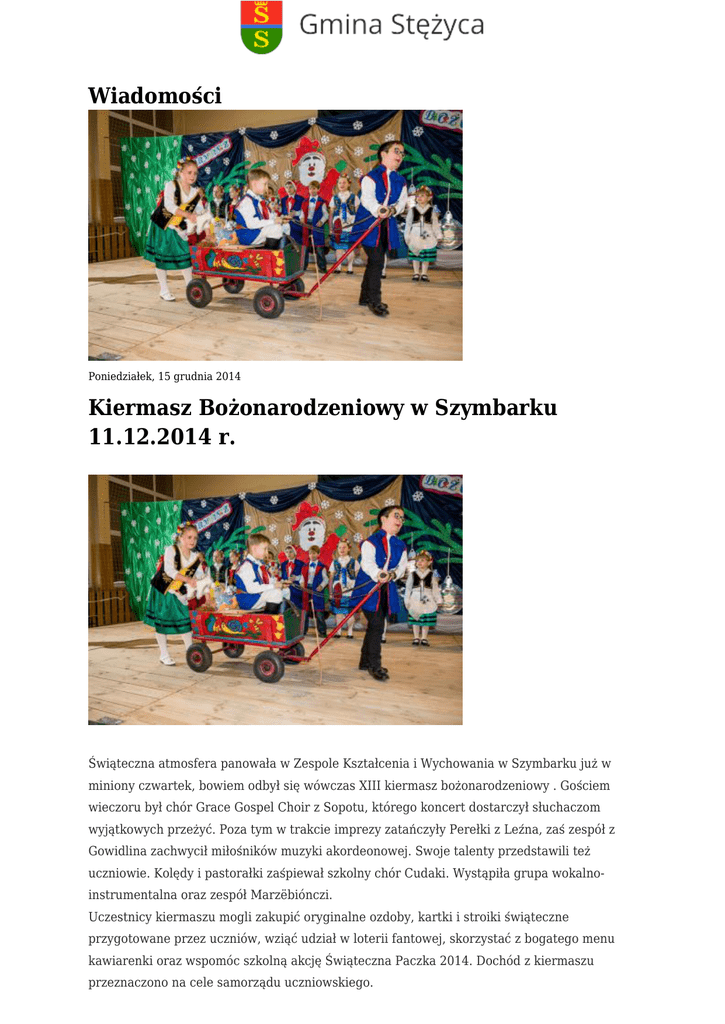 Wiadomości Poniedziałek, 15 grudnia 2014 Kiermasz Bożonarodzeniowy w Szymbarku 11.12.2014 r. Świąteczna atmosfera panowała w Zespole Kształcenia i Wychowania w Szymbarku już w miniony czwartek, bowiem odbył się wówczas XIII kiermasz bożonarodzeniowy . Gościem wieczoru był chór Grace Gospel Choir z Sopotu, którego koncert dostarczył słuchaczom wyjątkowych przeżyć. Poza tym w trakcie imprezy zatańczyły Perełki z Leźna, zaś zespół z Gowidlina zachwycił miłośników muzyki akordeonowej. Swoje talenty przedstawili też uczniowie. Kolędy i pastorałki zaśpiewał szkolny chór Cudaki. Wystąpiła grupa wokalnoinstrumentalna oraz zespół Marzëbiónczi. Uczestnicy kiermaszu mogli zakupić oryginalne ozdoby, kartki i stroiki świąteczne przygotowane przez uczniów, wziąć udział w loterii fantowej, skorzystać z bogatego menu kawiarenki oraz wspomóc szkolną akcję Świąteczna Paczka 2014. Dochód z kiermaszu przeznaczono na cele samorządu uczniowskiego. ( Tekst: K. Pek, zdj. A. Kasprzycki)