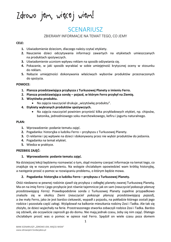 SCENARIUSZ ZBIERAMY INFORMACJE NA TEMAT TEGO, CO JEMY CELE: 1. Uświadomienie dzieciom, dlaczego należy czytać etykiety. 2. Nauczenie dzieci odczytywania informacji zawartych na etykietach umieszczanych na produktach spożywczych. 3. Uświadomienie uczniom wpływu reklam na sposób odżywiania się. 4. Pokazanie, w jaki sposób wyrabiać w sobie umiejętność krytycznej oceny w stosunku do reklam. 5. Nabycie umiejętności dokonywania właściwych wyborów produktów przeznaczonych do spożycia. POMOCE: 1. Plansza przedstawiająca przybysza z Turkusowej Planety o imieniu Ferro. 2. Plansza przedstawiająca sondę – pojazd, w którym Ferro przybył na Ziemię. 3. Wizytówka produktu. • Na zajęcia nauczyciel drukuje „wizytówkę produktu”. 4. Etykiety wybranych produktów spożywczych. • Na zajęcia nauczyciel powinien przynieść kilka przykładowych etykiet, np. chipsów, batonika, jednodniowego soku marchewkowego, kefiru i jogurtu naturalnego. PLAN: 1. 2. 3. 4. 5. Wprowadzenie: podanie tematu zajęć. Pogadanka: historyjka o ludziku Ferro – przybyszu z Turkusowej Planety. O reklamie i jej wpływie na dzieci i dokonywany przez nie wybór produktów do jedzenia. Pogadanka na temat etykiet. Wiedza w praktyce. PRZEBIEG ZAJĘĆ: 1. Wprowadzenie: podanie tematu zajęć. Na dzisiejszej lekcji będziemy rozmawiać o tym, skąd możemy czerpać informacje na temat tego, co znajduje się w naszym pożywieniu. Na wstępie chciałabym opowiedzieć wam krótką historyjkę, a następnie prosić o pomoc w rozwiązaniu problemu, o którym będzie mowa. 2. Pogadanka: historyjka o ludziku Ferro – przybyszu z Turkusowej Planety. Otóż niedawno w pewnej rodzinie zjawił się przybysz z odległej planety zwanej Turkusową Planetą. Ma on na imię Ferro i jego przybycie jest równie tajemnicze jak on sam (nauczyciel pokazuje planszę przedstawiającą Ferro). Prawdopodobnie sonda z Turkusowej Planety zupełnie przypadkowo znalazła się w okolicy Ziemi (nauczyciel pokazuje planszę przedstawiającą pojazd), a ów mały Ferro, jako że jest bardzo ciekawski, wypadł z pojazdu, na pokładzie którego zostali jego rodzice i pozostała część załogi. Wylądował na balkonie mieszkania rodziny Zosi i Tadka. Ale tak się złożyło, że dzieci wyjechały na ferie. Przestraszonego stworka zobaczyli rodzice Zosi i Tadka. Bardzo się zdziwili, ale oczywiście zaprosili go do domu. Nie mają jednak czasu, żeby się nim zająć. Dlatego chciałabym prosić was o pomoc w opiece nad Ferro. Spędził on wiele czasu poza domem 1 BANK SCENARIUSZY „ZDROWO JEM, WIĘCEJ WIEM” www.zdrowojem.fundacjabos.pl i jest bardzo głodny. Należałoby pomóc mu wybrać coś dobrego do jedzenia. Jakie pytanie chcielibyście mu zadać? (dzieci zapytają prawdopodobnie, co stworek lubi jeść). Ferro przybył z Turkusowej Planety i nie wie, co jedzą ludzie zamieszkujący Ziemię oraz co nadaje się tu do jedzenia. Nie potrafi też powiedzieć, co najbardziej lubi, bo nigdy nie jadł tego, co wy jadacie. Musicie mu to powiedzieć: Nauczyciel zapisuje pytania na tablicy: • • • Co jest najlepsze do jedzenia? Co wy lubicie jeść najbardziej i dlaczego? Skąd możecie uzyskać informacje o tym, co należy jeść i jakie produkty są do jedzenia najlepsze? Wskazane jest zastosowanie tutaj formy dramy – jedno dziecko może odgrywać rolę Ferro, a pozostałe dzieci zadawać mu pytania. 3. O reklamie i jej wpływie na dzieci i dokonywane przez nie wybory produktów do jedzenia. Skierowanie rozmowy na temat reklamy: • • • Jakie reklamy żywności dzieci oglądały ostatnio? Czy podobały się im, a jeśli tak, to dlaczego? Gdzie jeszcze można znaleźć informacje na temat tego, co należy jeść, jakie produkty są zdrowe, potrzebne i niezbędne w diecie dziecka? Zabawa „Reklamowanka-zgadywanka” Nauczyciel dzieli dzieci na 5–6-osobowe grupy. Każdej grupie z osobna i tak, aby pozostali nie widzieli, co jest na niej napisane, nauczyciel wręcza karteczkę z nazwą produktu do zareklamowania (jogurt, jabłka, sok marchewkowy, chipsy, słodki napój gazowany). Zadaniem poszczególnych grup jest zareklamowanie produktu bez wymieniania jego nazwy. Pozostali uczniowie odgadują, o jakie produkty chodzi. Wiadomo, że reklamuje się nie tylko rzeczy zdrowe. Z telewizyjnych reklam uzyskujecie wiele informacji o różnych produktach, które można kupić w sklepach – w ten sposób producenci zachęcają was do kupowania swoich produktów. Reklamy są jednak krótkie i tak naprawdę możemy się z nich dowiedzieć jedynie, jak dany produkt wygląda i jak smakuje osobom, które go zjadają. To, że coś jest ładne nie zawsze znaczy, że jest zdrowe i koniecznie trzeba to jeść. Wiedzę na temat tego, jakie produkty są bezpieczne dla zdrowia i co powinniście jeść, możecie zdobyć od nauczycieli, rodziców i z książek. Do tej pory dużo już dowiedzieliście się na temat tego, co jest najlepsze do jedzenia dla dzieci. Warto więc, abyście opowiedzieli o tym przybyszowi z Turkusowej Planety. Nauczyciel może w tym momencie wybrać dzieci, które będą udzielały informacji stworkowi, a pozostałe dzieci będą zgłaszały swoje uwagi. Ferro na pewno chciałby pójść z wami do sklepu. Czy wiecie, gdzie w sklepie spożywczym można znaleźć na przykład pieczywo, gdzie warzywa, owoce, a gdzie np. jogurt i ser? Dlaczego np. kefir i jogurt znajdują się w chłodni? 2 BANK SCENARIUSZY „ZDROWO JEM, WIĘCEJ WIEM” www.zdrowojem.fundacjabos.pl 4. Pogadanka na temat etykiet. Wyobraźcie sobie, że przyszliście z Ferro do sklepu. Ludzik zainteresował się jogurtem naturalnym, soczkiem marchewkowym oraz ciasteczkami i chipsami. Chciałby dowiedzieć się od Was, czy to są dobre produkty do jedzenia, z czego je zrobiono i jak je należy jeść. • Gdzie mógłby znaleźć tego typu informacje? Te wszystkie informacje zawarte są na etykiecie przyklejonej do opakowania produktu spożywczego. Etykieta to