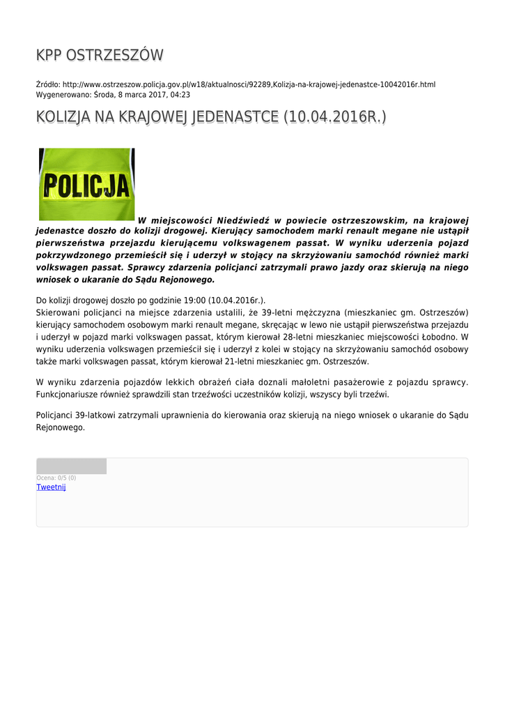 KPP OSTRZESZÓW Źródło: http://www.ostrzeszow.policja.gov.pl/w18/aktualnosci/92289,Kolizja-na-krajowej-jedenastce-10042016r.html Wygenerowano: Środa, 8 marca 2017, 04:23 KOLIZJA NA KRAJOWEJ JEDENASTCE (10.04.2016R.) W miejscowości Niedźwiedź w powiecie ostrzeszowskim, na krajowej jedenastce doszło do kolizji drogowej. Kierujący samochodem marki renault megane nie ustąpił pierwszeństwa przejazdu kierującemu volkswagenem passat. W wyniku uderzenia pojazd pokrzywdzonego przemieścił się i uderzył w stojący na skrzyżowaniu samochód również marki volkswagen passat. Sprawcy zdarzenia policjanci zatrzymali prawo jazdy oraz skierują na niego wniosek o ukaranie do Sądu Rejonowego. Do kolizji drogowej doszło po godzinie 19:00 (10.04.2016r.). Skierowani policjanci na miejsce zdarzenia ustalili, że 39-letni mężczyzna (mieszkaniec gm. Ostrzeszów) kierujący samochodem osobowym marki renault megane, skręcając w lewo nie ustąpił pierwszeństwa przejazdu i uderzył w pojazd marki volkswagen passat, którym kierował 28-letni mieszkaniec miejscowości Łobodno. W wyniku uderzenia volkswagen przemieścił się i uderzył z kolei w stojący na skrzyżowaniu samochód osobowy także marki volkswagen passat, którym kierował 21-letni mieszkaniec gm. Ostrzeszów. W wyniku zdarzenia pojazdów lekkich obrażeń ciała doznali małoletni pasażerowie z pojazdu sprawcy. Funkcjonariusze również sprawdzili stan trzeźwości uczestników kolizji, wszyscy byli trzeźwi. Policjanci 39-latkowi zatrzymali uprawnienia do kierowania oraz skierują na niego wniosek o ukaranie do Sądu Rejonowego. Ocena: 0/5 (0) Tweetnij