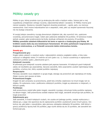 Mölkky zasady gry Mölkky to gra, której prostota czyni ją atrakcyjną dla osób w każdym wieku. Sukces jest w niej wypadkową umiejętności celnego rzucania, odpowiedniej taktyki i szczęścia. W Mölkky można grać niemal wszędzie. Wystarczy niewielki fragment otwartej przestrzeni – ogród, park, czy żwirowa nawierzchnia. Grać można indywidualnie lub w zespołach, wiek, płeć czy stopień sprawności fizycznej nie ma dużego znaczenia. W swojej kolejce zawodnicy rzucają drewnianym zbijakiem tak, aby wywrócić nim, upatrzone wcześniej, ponumerowane kręgle. Celem jest uzbieranie dokładnie 50 punktów. W końcówce trzeba jednak uważać, gdyż przekroczenie tej liczby skutkuje cofnięciem do poziomu 25 punktów. Mölkky powstała zaledwie kilkanaście lat temu w oparciu o tradycyjną grę fińską. W krótkim czasie stała się ona światowym fenomenem. W wielu państwach rozgrywane są krajowe mistrzostwa, a w Finlandii corocznie także mistrzostwa świata. Zasady gry Przygotowanie gry: Kręgle należy ustawić w zwartym szyku i odpowiednim ułożeniu względem siebie, a linię rzutu wytyczyć w odległości około 3-4 metrów od nich (patrz rys. 1). Gracze uczestniczą w zapisywaniu zdobytych punktów (patrz „Zakończenie gry”). Kolejność rzucania: W pierwszej grze kolejność rzucania ustalana jest poprzez losowanie. W kolejnych grach kolejność zależy od rezultatów gry poprzedniej. Zaczyna zawodnik, który poprzednio uzyskał najmniejszą liczbę punktów, a kończy ten, który uzyskał punktów najwięcej. Rozpoczęcie: Pierwszy zawodnik rzuca zbijakiem w grupę kręgli, starając się przewrócić jak największą ich liczbę. Zbijak rzucany jest zawsze od dołu. Przewrócone kręgle: Kręgiel nie jest uznawany za przewrócony, jeżeli leży (choćby częściowo) na innym kręglu lub na zbijaku. Po wykonaniu rzutu i podliczeniu zdobytych punktów, kręgle są ustawiane w miejscach, w których upadły. Punktacja: Jeśli przewrócony został tylko jeden kręgiel, zawodnik rzucający otrzymuje liczbę punktów zapisaną na danym kręglu. Jeśli przewrócona została większa ilość kręgli, zawodnik otrzymuje tyle punktów, ile kręgli przewrócił. Zakończenie gry: Jeśli zawodnik, w trzech kolejnych rzutach, nie uzyska ani jednego punktu, zostaje wykluczony z dalszej gry, a jego rola ogranicza się do zapisywania punktów uzyskanych przez innych graczy. Gra kończy się, gdy jeden z zawodników, jako pierwszy zdobędzie dokładnie 50 punktów. Jeśli któryś z graczy przekroczy łączną ilość 50 punktów, jego wynik obniża się do 25 punktów, ale zawodnik ten kontynuuje grę.
