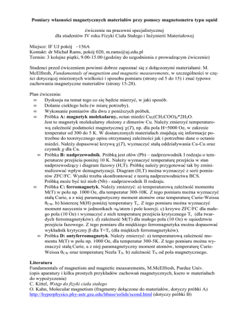 Pomiary własności magnetycznych materiałów przy pomocy magnetometru typu squid ćwiczenie na pracowni specjalistycznej dla studentów IV roku Fizyki Ciała Stałego i InŜynierii Materiałowej Miejsce: IF UJ pokój −156A Kontakt: dr Michał Rams, pokój 020, [email protected] Termin: 3 kolejne piątki, 9.00-15.00 (godziny do uzgodnienia z prowadzącym ćwiczenie) Studenci przed ćwiczeniem powinni dobrze zapoznać się z dołączonymi materiałami: M. McElfresh, Fundamentals of magnetism and magnetic measurements, w szczególności w części dotyczącej mierzonych wielkości i sposobu pomiaru (strony od 5 do 15) i znać typowe zachowania magnetyczne materiałów (strony 15-28). Plan ćwiczenia: • Dyskusja na temat tego co się będzie mierzyć, w jaki sposób. • Dolanie ciekłego helu (w miarę potrzeby). • Wykonanie pomiarów dla dwu z poniŜszych próbek. • Próbka A: magnetyk molekularny, octan miedzi Cu2(CH3COO)4*2H2O. Jest to magnetyk molekularny złoŜony z dimerów Cu. NaleŜy zmierzyć temperaturową zaleŜność podatności magnetycznej χ(T), np. dla pola H=5000 Oe, w zakresie temperatur od 300 do 5 K. W dostarczonych materiałach znajdują się informacje potrzebne do teoretycznego opisu otrzymanej zaleŜności jak i potrzebne dane o octanie miedzi. NaleŜy dopasować krzywą χ(T), wyznaczyć stałą oddziaływania Cu-Cu oraz czynnik g dla Cu. • Próbka B: nadprzewodnik. Próbką jest ołów (Pb) – nadprzewodnik I rodzaju o temperaturze przejścia poniŜej 10 K. NaleŜy wyznaczyć temperaturę przejścia w stan nadprzewodzący i diagram fazowy (H,T). Próbkę naleŜy przygotować tak by zminimalizować wpływ demagnetyzacji. Diagram (H,T) moŜna wyznaczyć z serii pomiarów ZFC/FC. Wyniki trzeba skonfrontować z teorią nadprzewodnictwa BCS. Próbką moŜe być teŜ niob (Nb) - nadprzewodnik II rodzaju. • Próbka C: ferromagnetyk. NaleŜy zmierzyć: a) temperaturową zaleŜność momentu M(T) w polu np. 1000 Oe, dla temperatur 300-10K. Z tego pomiaru moŜna wyznaczyć stałą Curie, a z niej paramagnetyczny moment atomów oraz temperaturę Curie-Weissa θCW. b) histerezę M(H) poniŜej temperatury Tc. Z tego pomiaru moŜna wyznaczyć moment nasycenia w jednostkach µB/atom i pole koercji. c) krzywe ZFC/FC dla małego pola (10 Oe) i wyznaczyć z nich temperaturę przejścia krytycznego Tc (dla twardych ferromagnetyków). d) zaleŜność M(T) dla małego pola (10 Oe) w sąsiedztwie przejścia fazowego. Z tego pomiaru dla miękkiego ferromagnetyka moŜna dopasować wykładnik krytyczny β dla T<Tc (dla miękkich ferromagnetyków). • Próbka D: antyferromagnetyk. NaleŜy zmierzyć: a) temperaturową zaleŜność momentu M(T) w polu np. 1000 Oe, dla temperatur 300-5K. Z tego pomiaru moŜna wyznaczyć stałą Curie, a z niej paramagnetyczny moment atomów, temperaturę CurieWeissa θCW oraz temperaturę Neela TN. b) zaleŜność TN od pola magnetycznego. Literatura Fundamentals of magnetism and magnetic measurements, M.McElfresh, Purdue Univ. (opis aparatury i kilku prostych przykładów zachowań magnetycznych, ksero w materiałach do wypoŜyczenia) C. Kittel, Wstęp do fizyki ciała stałego O. Kahn, Molecular magnetism (fragmenty dołączone do materiałów, dotyczy próbki A) http://hyperphysics.phy-astr.gsu.edu/hbase/solids/scond.html (dotyczy próbki B) Próbka B, nadprzewodnik I rodzaju, Pb Podstawowe informacje na temat nadprzewodników moŜna znaleźć w C. Kittel, Wstęp do fizyki ciała stałego http://hyperphysics.phy-astr.gsu.edu/hbase/solids/scond.html Przygotowanie próbki Pb. Próbka powinna mieć jak najbardziej wydłuŜony kształt, po to by zminimalizować wpływ demagnetyzacji. Długość próbki nie powinna przekraczać 5mm. Próbkę o takim kształcie moŜna przygotować z drutu ołowianego 0.5mm lub wyciąć skalpelem z ołowiu. Próbkę naleŜy zwaŜyć i wkleić do rurki, tak by pręcik Pb był ułoŜony wzdłuŜ rurki (wzdłuŜ pola magnetycznego). Klej GE-varnish schnie około 30min, czas ten moŜna skrócić do 5min delikatnie podgrzewając suszarką. Pomiary z Pb. W stanie normalnym sygnał pomiarowy jest znikomy. Dlatego próbkę naleŜy wycentrować w fazie nadprzewodzącej, w polu mniejszym niŜ pole krytyczne (np. w polu H=100 Oe, T=6 K) . Pomiary dobrze zacząć od pola 100 Oe i zakresu temperatur 10–2K. MoŜna uŜyć sekwencji: Następnie dla najniŜszej temperatury (2 K lub 1.8 K) naleŜy zrobić pomiar M(T=const, H) tak, Ŝeby wyznaczyć pole krytyczne Bc(2 K) oraz podatność magn. w fazy nadprzewodzącej. Sekwencja pomiarowa moŜe wyglądać np. tak: Następnie trzeba zaprogramować serię pomiarów ‘field cooling’ dla róŜnych pól H. śeby zoptymalizować czas pomiarów naleŜy narysować teoretyczny diagram HT i zaplanować dla jakich pól i zakresów temperatur wykonać pomiary i napisać odpowiednią sekwencje pomiarową. Otrzymane wyniki naleŜy porównać z przewidywaniami teorii BCS. W szczególność moŜna sprawdzić: Czy jest to idealny diamagnetyk? Czy wyniki tablicowe dla Pb są takie same? Czy jest to nadprzewodnik I czy II rodzaju? Czy krzywa H(T) zgadza się z BCS? Próbka A: octan miedzi. Literatura O. Kahn, Molecular magnetism (potrzebne fragmenty dołączone) Przygotowanie próbki Octan miedzi jest w postaci proszku. Sygnał od tej próbki jest bardzo mały i trzeba tak zamontować próbkę w rurce, Ŝeby zminimalizować sygnał od mocowania próbki. NaleŜy oszacować moment magnetyczny paramagnetycznych spinów miedzi w 300 K w polu 5000 Oe. Mierzony moment próbki nie moŜe przekraczać 1 emu. Najlepiej zrobić pastylkę, o masie około 100mg, o średnicy 5mm. Pastylkarką 5mm naleŜy posługiwać się bardzo ostroŜnie Ŝeby jej nie uszkodzić. Dopuszczalny nacisk prasy dla pastylkarki 5mm wynosi maksymalnie 500 kg. Zrobioną pastylkę moŜna umieścić w odpowiednio ponakłuwanej rurce. Przy czyszczeniu pastylkarki nie moŜna jej skrobać metalowymi narzędziami ani papierem ściernym ! Pom