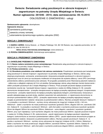 1z7 file:///C:/Users/Anna Jarzembowska/AppData/Local/Microsoft/Windo... Świecie: Świadczenie usług pocztowych w obrocie krajowym i zagranicznym na potrzeby Urzędu Miejskiego w Świeciu Numer ogłoszenia: 261046 - 2015; data zamieszczenia: 05.10.2015 OGŁOSZENIE O ZAMÓWIENIU - usługi Zamieszczanie ogłoszenia: obowiązkowe. Ogłoszenie dotyczy: V zamówienia publicznego zawarcia umowy ramowej ustanowienia dynamicznego systemu zakupów (DSZ) SEKCJA I: ZAMAWIAJĄCY I. 1) NAZWA I ADRES: Gmina Świecie , ul. Wojska Polskiego 124, 86-100 Świecie, woj. kujawsko-pomorskie, tel. 52 333 23 10, faks 52 333 23 51. Adres strony internetowej zamawiającego: www.swiecie.eu I. 2) RODZAJ ZAMAWIAJĄCEGO: Administracja samorządowa. SEKCJA II: PRZEDMIOT ZAMÓWIENIA II.1) OKREŚLENIE PRZEDMIOTU ZAMÓWIENIA II.1.1) Nazwa nadana zamówieniu przez zamawiającego: Świadczenie usług pocztowych w obrocie krajowym i zagranicznym na potrzeby Urzędu Miejskiego w Świeciu. II.1.2) Rodzaj zamówienia: usługi. II.1.4) Określenie przedmiotu oraz wielkości lub zakresu zamówienia: Przedmiotem zamówienia jest świadczenie usług pocztowych w obrocie krajowym i zagranicznym na potrzeby Urzędu Miejskiego w Świeciu. Zakres usług obejmuje przyjmowanie, sortowanie, przemieszczanie i doręczanie przesyłek pocztowych w obrocie krajowym i zagranicznym oraz ich zwrot po wyczerpaniu możliwości ich doręczenia lub wydania odbiorcy i zwrot ZPO (zwrotnego potwierdzenia odbioru) pokwitowane przez adresata. W przypadku posiadania przez Wykonawcę placówki nadawczo - odbiorczej w odległości większej niż 5 km od siedziby Zamawiającego zakres usług obejmuje również dostarczenie i odbiór przesyłek pocztowych do/z Urzędu Miejskiego w Świeciu. Przez przesyłki pocztowe będące przedmiotem zamówienia rozumie się: 1)przesyłki listowe krajowe i zagraniczne o wadze do 2000g (Gabaryt A i B): a)zwykłe ekonomiczne nierejestrowane - przesyłka nierejestrowana nie będąca przesyłką najszybszej kategorii, b)rejestrowane ekonomiczne - przesyłka rejestrowana nie będąca przesyłką najszybszej kategorii, przemieszczaną i doręczaną w sposób zabezpieczający ją przed utratą, ubytkiem zawartości lub uszkodzeniem, c) rejestrowane ekonomiczne ze zwrotnym potwierdzeniem odbioru (ZPO) - przesyłka rejestrowana nie będąca przesyłką najszybszej kategorii, przyjęta za potwierdzeniem nadania i doręczana za pokwitowaniem odbioru, Wymiary przesyłek listowych: Gabaryt A - to przesyłka o wymiarach: Minimum - wymiary strony adresowej nie mogą być mniejsze niż 90 x 140 mm, Maksimum - żaden z wymiarów nie może przekroczyć wysokości (grubości) 20mm, długości 325 mm, szerokości 230 mm. Gabaryt B - to przesyłka o wymiarach: Minimum - jeśli choć jeden z wymiarów przekracza wysokość (grubość) 20mm lub długość 325mm lub szerokość 230mm, Maksimum - suma długości, szerokości i wysokości (grubości) 900mm, przy czym największy z tych wymiarów (długość) nie może przekroczyć 600mm. 2)paczki pocztowe krajowe o wadze do 10.000g (Gabaryt A i B): a)ekonomiczne - paczki rejestrowane nie będące paczkami najszybszej kategorii, b)ekonomiczne ze zwrotnym potwierdzeniem odbioru (ZPO) - paczki rejestrowane ekonomiczne przyjęte za potwierdzeniem nadania i doręczone za pokwitowaniem odbioru. Wymiary paczek pocztowych: Gabaryt A - to paczka o wymiarach: Minimum - wymiary strony adresowej nie mogą być mniejsze niż 90 x 140mm, Maksimum żaden z wymiarów nie może przekroczyć: długość 600mm, szerokość 500mm, wysokość 300mm. Gabaryt B - to paczka o wymiarach: Minimum - jeśli choć jeden z wymiarów przekracza długość 600mm, szerokość 500mm, 2015-10-05 08:58 2z7 file:///C:/Users/Anna Jarzembowska/AppData/Local/Microsoft/Windo... wysokość 300mm, Maksimum - suma długości i największego obwodu mierzonego w innym kierunku niż długość 3000mm, przy czym największy wymiar nie może przekroczyć 1500mm. Ustala się tolerancję wszystkich wymiarów +/- 2mm. 3.Przez zwroty rozumie się zwroty niedoręczonych przesyłek pocztowych po wyczerpaniu możliwości ich doręczenia lub wydania odbiorcy, z podaniem przyczyny niedoręczenia. Przez ZPO (zwrotne potwierdzenie odbioru) rozumie się zwrot pokwitowanego przez adresata potwierdzenia odbioru. 4.Usługa dostarczania przesyłek pocztowych świadczona będzie przez Wykonawcę do każdego wskazanego przez Zamawiającego adresu na terenie RP i poza granicami RP. 5.Wykonawca zobowiązuje się: 1)do przyjęcia do nadania przesyłek pocztowych objętych przedmiotem zamówienia dostarczonych przez upoważnionego pracownika Zamawiającego do placówki nadawczo odbiorczej Wykonawcy celem ich nadania, w przypadku posiadania przez Wykonawcę placówki nadawczo odbiorczej w odległości nie większej niż 5 km od siedziby Zamawiającego. Wykonawca zapewnia, że placówka nadawczo - odbiorcza Wykonawcy będzie czynna codziennie, w dni robocze, od poniedziałku do piątku w godzinach co najmniej od 800 do 1600. W takim przypadku Zamawiający codziennie w dni robocze od poniedziałku do piątku będzie nadawał minimum jeden raz dziennie przesyłki pocztowe w placówce nadawczo - odbiorczej Wykonawcy w godzinach od 1100 do 1600 i odbierał jeden raz dziennie przesyłki pocztowe oraz ZPO (zwrotne potwierdzenie odbioru) i zwroty w placówce nadawczo - odbiorczej Wykonawcy w godzinach od 800 do 900. 2)do dostarczania jeden raz dziennie przesyłek pocztowych oraz ZPO (zwrotne potwierdzenie odbioru) i zwroty do siedziby Zamawiającego codziennie, od poniedziałku do piątku, w dni robocze w godzinach od 800 do 900 i odbioru minimum jeden raz dziennie przesyłek pocztowych przygotowanych do wysyłki z siedziby Zamawiającego codziennie, od poniedziałku do piątku w dni robocze w godzinach od 1100 do 1600, w przypadku posiadania przez Wykonawcę placówki nadawczo - odbiorczej w odległości większej niż 5 km od siedziby Zamawiającego. Odbioru przesyłek poc