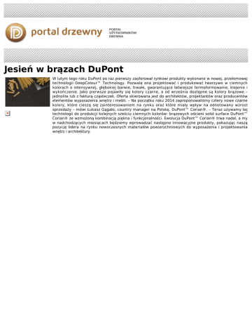Jesień w brązach DuPont W lutym tego roku DuPont po raz pierwszy zaoferował rynkowi produkty wykonane w nowej, przełomowej technologii DeepColour™ Technology. Pozwala ona projektować i produkować tworzywo w ciemnych kolorach o intensywnej, głębokiej barwie, trwałe, gwarantujące łatwiejsze termoformowanie, klejenie i wykończenie. Jako pierwsze pojawiły się kolory czarne, a od września dostępne są kolory brązowe – jednolite lub z fakturą cząsteczek. Oferta skierowana jest do architektów, projektantów oraz producentów elementów wyposażenia wnętrz i mebli. – Na początku roku 2014 zaproponowaliśmy cztery nowe czarne kolory, które cieszą się zainteresowaniem na rynku oraz które miały wpływ na odnotowany wzrost sprzedaży – mówi Łukasz Gągało, country manager na Polskę, DuPont™ Corian®. – Teraz używamy tej technologii do produkcji kolejnych sześciu ciemnych kolorów: brązowych odcieni solid surface DuPont™ Corian® ze wzmożoną kombinacją piękna i funkcjonalności. Ewolucja DuPont™ Corian® trwa nadal, a my w nadchodzących miesiącach będziemy wprowadzać następne innowacyjne produkty, pokazując naszą pozycję lidera na rynku nowoczesnych materiałów powierzchniowych do wyposażenia i projektowania wnętrz i architektury.