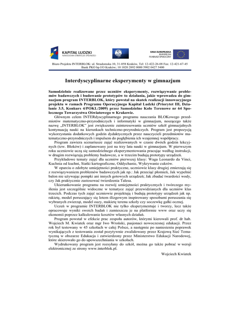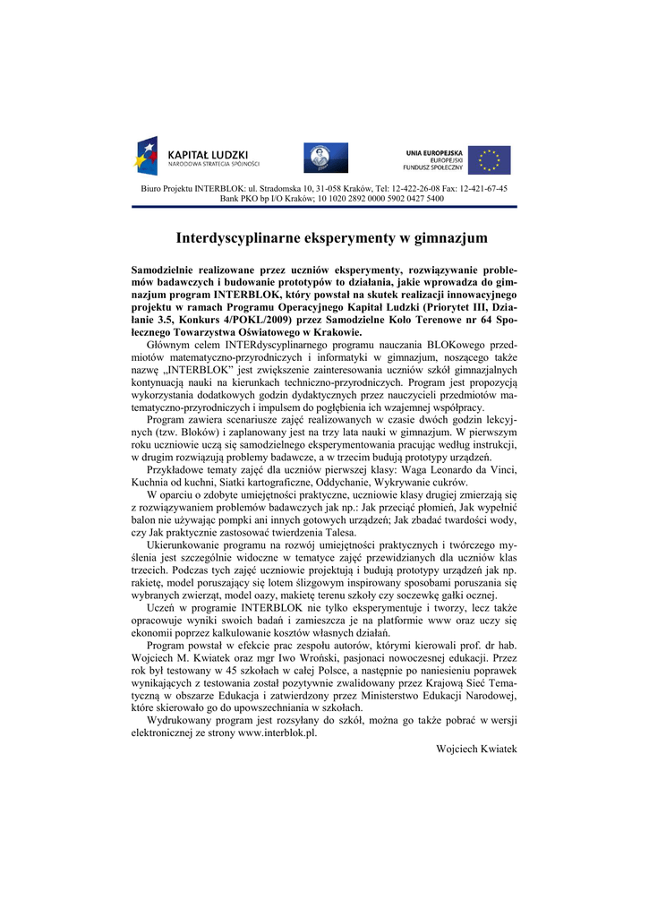 Biuro Projektu INTERBLOK: ul. Stradomska 10, 31-058 Kraków, Tel: 12-422-26-08 Fax: 12-421-67-45 Bank PKO bp I/O Kraków; 10 1020 2892 0000 5902 0427 5400 Interdyscyplinarne eksperymenty w gimnazjum Samodzielnie realizowane przez uczniów eksperymenty, rozwiązywanie problemów badawczych i budowanie prototypów to działania, jakie wprowadza do gimnazjum program INTERBLOK, który powstał na skutek realizacji innowacyjnego projektu w ramach Programu Operacyjnego Kapitał Ludzki (Priorytet III, Działanie 3.5, Konkurs 4/POKL/2009) przez Samodzielne Koło Terenowe nr 64 Społecznego Towarzystwa Oświatowego w Krakowie. Głównym celem INTERdyscyplinarnego programu nauczania BLOKowego przedmiotów matematyczno-przyrodniczych i informatyki w gimnazjum, noszącego także nazwę „INTERBLOK” jest zwiększenie zainteresowania uczniów szkół gimnazjalnych kontynuacją nauki na kierunkach techniczno-przyrodniczych. Program jest propozycją wykorzystania dodatkowych godzin dydaktycznych przez nauczycieli przedmiotów matematyczno-przyrodniczych i impulsem do pogłębienia ich wzajemnej współpracy. Program zawiera scenariusze zajęć realizowanych w czasie dwóch godzin lekcyjnych (tzw. Bloków) i zaplanowany jest na trzy lata nauki w gimnazjum. W pierwszym roku uczniowie uczą się samodzielnego eksperymentowania pracując według instrukcji, w drugim rozwiązują problemy badawcze, a w trzecim budują prototypy urządzeń. Przykładowe tematy zajęć dla uczniów pierwszej klasy: Waga Leonardo da Vinci, Kuchnia od kuchni, Siatki kartograficzne, Oddychanie, Wykrywanie cukrów. W oparciu o zdobyte umiejętności praktyczne, uczniowie klasy drugiej zmierzają się z rozwiązywaniem problemów badawczych jak np.: Jak przeciąć płomień, Jak wypełnić balon nie używając pompki ani innych gotowych urządzeń; Jak zbadać twardości wody, czy Jak praktycznie zastosować twierdzenia Talesa. Ukierunkowanie programu na rozwój umiejętności praktycznych i twórczego myślenia jest szczególnie widoczne w tematyce zajęć przewidzianych dla uczniów klas trzecich. Podczas tych zajęć uczniowie projektują i budują prototypy urządzeń jak np. rakietę, model poruszający się lotem ślizgowym inspirowany sposobami poruszania się wybranych zwierząt, model oazy, makietę terenu szkoły czy soczewkę gałki ocznej. Uczeń w programie INTERBLOK nie tylko eksperymentuje i tworzy, lecz także opracowuje wyniki swoich badań i zamieszcza je na platformie www oraz uczy się ekonomii poprzez kalkulowanie kosztów własnych działań. Program powstał w efekcie prac zespołu autorów, którymi kierowali prof. dr hab. Wojciech M. Kwiatek oraz mgr Iwo Wroński, pasjonaci nowoczesnej edukacji. Przez rok był testowany w 45 szkołach w całej Polsce, a następnie po naniesieniu poprawek wynikających z testowania został pozytywnie zwalidowany przez Krajową Sieć Tematyczną w obszarze Edukacja i zatwierdzony przez Ministerstwo Edukacji Narodowej, które skierowało go do upowszechniania w szkołach. Wydrukowany program jest rozsyłany do szkół, można go także pobrać w wersji elektronicznej ze strony www.interblok.pl. Wojciech Kwiatek