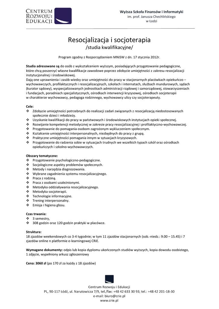 Wyższa Szkoła Finansów i Informatyki im. prof. Janusza Chechlińskiego w Łodzi Resocjalizacja i socjoterapia /studia kwalifikacyjne/ Program zgodny z Rozporządzeniem MNiSW z dn. 17 stycznia 2012r. Studia adresowane są do osób z wykształceniem wyższym, posiadających przygotowanie pedagogiczne, które chcą poszerzyć własne kwalifikacje zawodowe poprzez zdobycie umiejętności z zakresu resocjalizacji instytucjonalnej i środowiskowej. Dają one uprawnienia i zasób wiedzy oraz umiejętności do pracy w stacjonarnych placówkach opiekuńczo – wychowawczych, profilaktycznych i resocjalizacyjnych, szkołach i internatach, służbach mundurowych, sądach (kurator sądowy), wyspecjalizowanych jednostkach administracji rządowej i samorządowej, stowarzyszeniach i fundacjach, poradniach specjalistycznych, ośrodkach interwencji kryzysowej, ośrodkach socjoterapii w charakterze wychowawcy, pedagoga rodzinnego, wychowawcy ulicy czy socjoterapeuty. Cele: Zdobycie umiejętności potrzebnych do realizacji zadań związanych z resocjalizacją niedostosowanych społecznie dzieci i młodzieży. Uzyskanie kwalifikacji do pracy w państwowych i środowiskowych instytucjach opieki społecznej. Rozwijanie kompetencji metodycznej w zakresie pracy resocjalizacyjnej i profilaktyczno-wychowawczej. Przygotowanie do pomagania osobom zagrożonym wykluczeniem społecznym. Kształcenie umiejętności interpersonalnych, niezbędnych do pracy z grupą. Praktyczne umiejętności pomagania innym w sytuacjach kryzysowych. Przygotowanie do radzenia sobie w sytuacjach trudnych we wszelkich typach szkół oraz ośrodkach opiekuńczych i szkolno-wychowawczych. Obszary tematyczne: Przygotowanie psychologiczno-pedagogiczne. Socjologiczne aspekty problemów społecznych. Metody i narzędzia diagnozowania. Wybrane zagadnienia systemu resocjalizacyjnego. Praca z rodziną. Praca z osobami uzależnionymi. Metodyka oddziaływania resocjalizacyjnego. Metodyka socjoterapii. Technologie informacyjne. Trening interpersonalny. Emisja i higiena głosu. Czas trwania: 3 semestry, 308 godzin oraz 120 godzin praktyki w placówce. Struktura: 18 zjazdów weekendowych co 3-4 tygodnie; w tym 11 zjazdów stacjonarnych (sob.-niedz.: 9.00 – 15.45) i 7 zjazdów online n platformie e-learningowej CRiE. Wymagane dokumenty: odpis lub kopia dyplomu ukończonych studiów wyższych, kopia dowodu osobistego, 1 zdjęcie, wypełniony arkusz zgłoszeniowy Cena: 3060 zł (po 170 zł za każdy z 18 zjazdów)