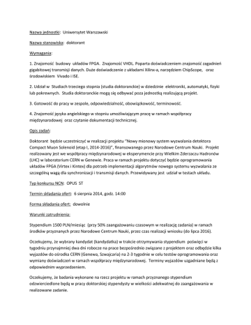 Nazwa jednostki: Uniwersytet Warszawski Nazwa stanowiska: doktorant Wymagania: 1. Znajomość budowy układów FPGA. Znajomość VHDL. Poparta doświadczeniem znajomość zagadnień gigabitowej transmisji danych. Duże doświadczenie z układami Xilinx-a, narzędziem ChipScope, oraz środowiskiem Vivado i ISE. 2. Udział w Studiach trzeciego stopnia (studia doktoranckie) w dziedzinie elektroniki, automatyki, fizyki lub pokrewnych. Studia doktoranckie mogą się odbywać poza jednostką realizującą projekt. 3. Gotowość do pracy w zespole, odpowiedzialność, obowiązkowość, terminowość. 4. Znajomość języka angielskiego w stopniu umożliwiającym pracę w ramach współpracy międzynarodowej oraz czytanie dokumentacji technicznej. Opis zadań: Doktorant będzie uczestniczyć w realizacji projektu “Nowy mionowy system wyzwalania detektora Compact Muon Solenoid (etap I, 2014-2016)”, finansowanego przez Narodowe Centrum Nauki. Projekt realizowany jest we współpracy międzynarodowej w eksperymencie przy Wielkim Zderzaczu Hadronów (LHC) w laboratorium CERN w Genewie. Praca w ramach projektu dotyczyć będzie oprogramowania układów FPGA (Virtex i Kintex) dla potrzeb implementacji algorytmów nowego systemu wyzwalania ze szczególną wagą dla synchronizacji i transmisji danych. Przewidywany jest udział w testach układu. Typ konkursu NCN: OPUS ST Termin składania ofert: 6 sierpnia 2014, godz. 14:00 Forma składania ofert: dowolnie Warunki zatrudnienia: Stypendium 1500 PLN/miesiąc (przy 50% zaangażowaniu czasowym w realizację zadania) w ramach środków przyznanych przez Narodowe Centrum Nauki, przez czas realizacji wniosku (do lipca 2016). Oczekujemy, że wybrany kandydat (kandydatka) w trakcie otrzymywania stypendium poświęci w tygodniu przynajmniej dwa dni robocze na prace bezpośrednio związane z projektem oraz odbędzie kilka wyjazdów do ośrodka CERN (Genewa, Szwajcaria) na 2-3 tygodnie w celu testów oprogramowania oraz wymiany doświadczeń w ramach współpracy międzynarodowej. Terminy wyjazdów uzgadniane będą z odpowiednim wyprzedzeniem. Oczekujemy, że badania wykonane na rzecz projektu w ramach przyznanego stypendium odzwierciedlone będą w pracy doktorskiej stypendysty w wielkości adekwatnej do zaangażowania w realizowane zadanie. Dodatkowe informacje: INFORMACJE O PROJEKCIE Stypendium dotyczy pracy w projekcie nowego układu wyzwalania detektora CMS na miony. Grupa Warszawska CMS (http://cms.fuw.edu.pl/) skupia fizyków, elektroników i techników z Uniwersytetu Warszawskiego, Narodowego Centrum Badań Jądrowych oraz Politechniki Warszawskiej. Razem zaprojektowaliśmy i zbudowaliśmy część mionowego układu wyzwalania detektora Compact Muon Solenoid (CMS, http://cms.web.cern.ch/org/cms-public) pracującego w CERNie przy LHC. Jądrem systemu są 84 płyty trygera zbudowane w oparciu o układ ALTERA Stratix II. Układ z sukcesem pracował w pierwszym okresie działania LHC, w latach 2010-2012, przyczyniając się do sukcesu LHC - odkrycia bozonu Higgsa. Nowy tryb działania LHC po 2014 roku, oraz ambitny program badań CMS narzuca konieczność modyfikacji i przebudowy systemu wyzwalania CMS, w szczególności jego części mionowej. W ramach nowego układu wyzwalania na miony Grupa Warszawska jest odpowiedzialna za optymalizację systemu selekcji przypadków mionowych w tzw. Obszarze Pośrednim detektora. W obszarze tym dane dostarczane są przez trzy rodzaje detektorów mionowych: komory RPC, DT oraz CSC. Trudność selekcji polega nie tylko na właściwym połączeniu danych z tych poddetektorów, ale także na uwzględnieniu zależnego od położenia pola magnetycznego. Jako Grupa Warszawska podjęliśmy się rozwoju nowego algorytmu wyzwalania detektora, budowy części systemu oraz utworzenia oprogramowania do sterowania układem w środowisku CMS. W ramach tej działalności mamy do zaoferowania wiele zagadnień, które mogą stanowić temat pracy doktorskiej. Wśród nich są: symulacje i rozwój algorytmu wyzwalania (praca w językach C++, python), implementacje elementów algorytmu w języku programowania układów scalonych FPGA. WYMAGANE DOKUMENTY: • Wniosek o przyznanie stypendium zawierający informacje o dotychczasowych osiągnieciach naukowych i wyróżnieniach wynikających z prowadzonych badań. • Dokumenty potwierdzające spełnienie przez kandydata warunków wymienionych w wymaganiach. TRYB REKRUTACJI, KONTAKT : Rekrutacja prowadzona jest zgodnie z regułami zawartymi w Uchwale nr. 50/2013 z dnia 3 czerwca 2013 r. Rady Narodowego Centrum Nauki. Dokumenty proszę składać osobiście lub przysłać pocztą na adres: Uniwersytet Warszawski, Wydział Fizyki, sekretariat ZCiOF (pok. 4.03), ul. Pasteura 5 02-093 Warszawa Osoby zainteresowane proszone są również o kontakt na adres e-mail: [email protected]