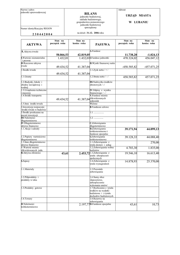 Adresat Nazwa i adres jednostki sprawozdawczej BILANS jednostki budżetowej, zakładu budżetowego, gospodarstwa pomocniczego jednostki budżetowej sporządzony -----------------------------------------------Numer identyfikacyjny REGON Stan na początek roku Stan na koniec roku PASYWA 50.866,53 1.432,01 42.819,05 1.432,01I.Fundusz jednostki 49.434,52 41.387,04 49.434,52 1.2.Budynki, lokale i obiekty inż.lądowej i wodnej 1.3.Urządzenia techniczne i maszyny 1.4.Środki transportu III.Nadwyżka środków obrotowych / -/ 49.434,52 1.5.Inne środki trwałe 2.Inwestycje rozpoczęte /środki trwałe w budowie/ 3.Środki przekazane na poczet inwestycji III.Należności długoterminowe IV.Długoterminowe aktywa finansowe 1.1.Akcje i udziały 1.2.Półprodukty i produkty w toku 1.3.Produkty gotowe 1.4.Towary II.Należności krótkoterminowe -1.024,13 456.047,12 -458.585,82 -457.071,25 458.585,82 457.071,25 39.171,94 44.099,13 39.128,33 44.088,40 41.387,04 1.2.Strata netto / - / 1.1.Materiały 11.738,20 470.324,02 1.1.Zysk netto / + / 1.1.Grunty I.Zapasy Stan na koniec roku II.Wynik finansowy netto 1.Środki trwałe 1.2.Papiery wartościowe długoterminowe 1.3.Inne długoterminowe aktywa finansowe V.Wartość mienia zlikwidowanych jedn. B.Aktywa obrotowe Stan na początek roku A.Fundusz A.Aktywa trwałe I.Wartości niematerialne i prawne II.Rzeczowe aktywa trwałe W LUBANIU na dzień 31.12. 2006 roku 230442004 AKTYWA URZĄD MIASTA IV.Odpisy z wyniku finansowego / - / V.Fundusz mienia 41.387,04zlikwidowanych jednostek VI.Inne B.Fundusze celowe 1.1. ................ 1.2. ............... 43,61 C.Zobowiązania długoterminowe D.Zobowiązania krótkoterminowe i fundusze specjalne I.Zobowiązania krótkoterminowe 1.1.Zobowiązania z tytułu dostaw i usług 1.2.Zobowiązania wobec budżetów 2.453,721.3.Zobowiązania z tytułu ubezpieczeń społecznych 1.4.Zobowiązania z tytułu wynagrodzeń 270,00 4.703,30 1.835,00 19.546,10 16.613,40 14.878,93 25.370,00 43,61 10,73 1.5.Pozostałe zobowiązania 1.6.Sumy obce /depozytowe, zabezpieczenie wykonania umów/ 1.7.Rozliczenie z tytułu środków na wydatki budżetowe i z tytułu dochodów budżetowych 1.8.Rezerwy na zobowiązania 2.197,77II.Fundusze specjalne 1.1Należności z tytułu dostaw i usług 1.1.Zakładowy Fundusz Świadczeń Socjalnych 1.2.Należności od budżetów 1.3.Należności z tytułu ubezpieczeń społecznych 1.4.Pozostałe należności 1.5.Rozliczenia z tytułu środków na wydatki budżetowe i z tytułu dochodów budżetowych III.Środki pieniężne 1.1.Środki pieniężne w kasie 1.2.Środki pieniężne na rachunkach bankowych 1.3.Inne środki pieniężne 1.2.Inne fundusze E.Rozliczenia międzyokresowe 2.197,77I.Rozliczenia międzyokresowe przychodów II.Inne rozliczenia międzyokresowe 43,61 10,73F.Inne pasywa 43,61 10,73 IV.Krótkoterminowe papiery wartościowe V.Rozliczenia międzyokresowe C.Inne aktywa SUMA AKTYWÓW 43,61 10,73 2.197,77 2.197,77 245,22 50.910,14 45.272,77 SUMA PASYWÓW 50.910,14 45.272,77 A.Objaśnienie - wykazane w bilansie wartości aktywów trwałych i obrotowych są pomniejszone odpowiednio o umorzenie i odpisy aktualizujące. B.Informacje uzupełniające istotne dla rzetelności i przejrzystości sytuacji finansowej i majątkowej : 1. Umorzenie wartości niematerialnych i prawnych 2. Umorzenie środków trwałych 38.718,68 3. Umorzenie pozostałych środków trwałych i wyposażenia 14.652,34 4. Odpisy aktualizujące należności ................................................. 5. ........................................................................................................ ...................................................... Główny Księgowy 2007 – 03 - 30 .................................... Rok , miesiąc , dzień .................................................. Kierownik jednostki