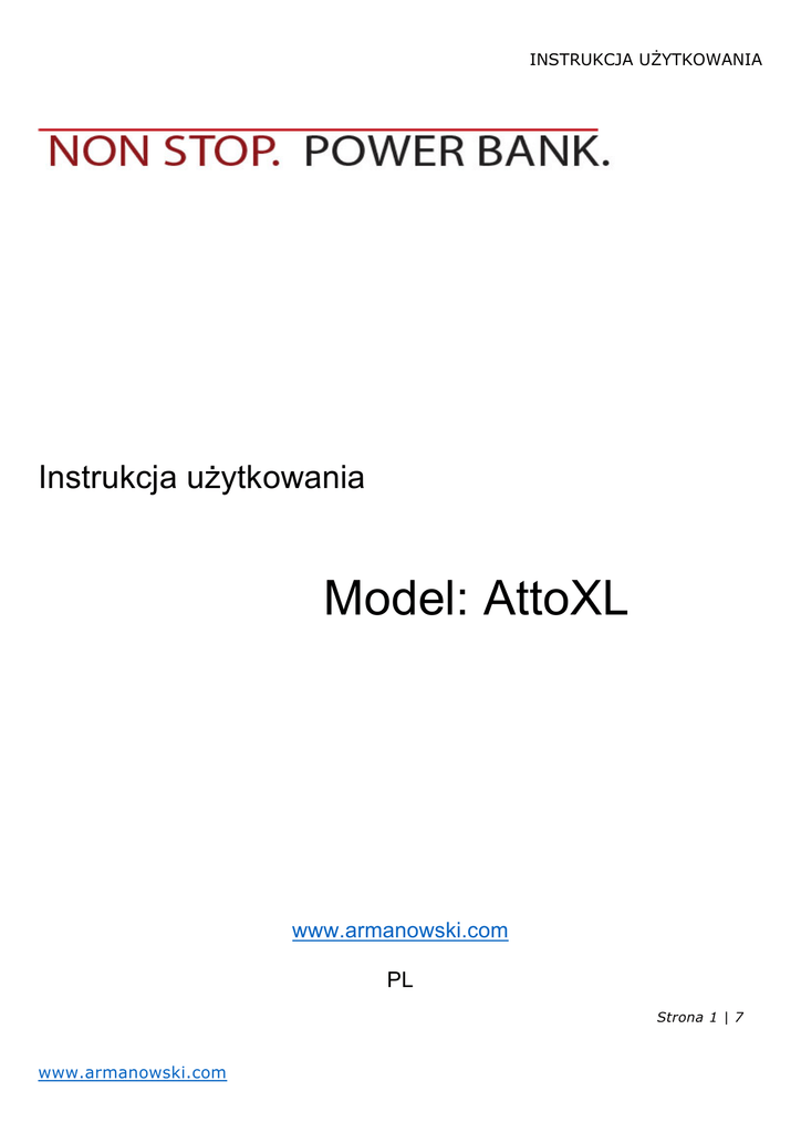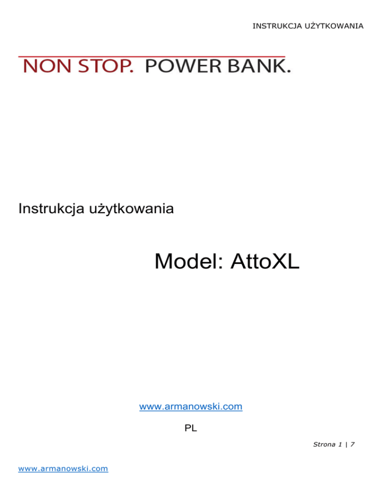 INSTRUKCJA UŻYTKOWANIA Instrukcja użytkowania Model: AttoXL www.armanowski.com PL Strona 1 | 7 www.armanowski.com INSTRUKCJA UŻYTKOWANIA Wygląd produktu: Rys.1. a) b) c) d) e) f) g) h) i) Wtyczka/złącze USB Wtyczka/złącze micro USB Kabel transmisyjny USB Przycisk uruchomiający latarkę, poziom naładowania Wskaźnik poziomu naładowania Latarka LED Port USB wyjście – rozładowywanie urządzenia 1A Port USB wyjście – rozładowywanie urządzenia 1,8A Port micro USB wejście – ładowanie urządzenia 1. Ładowanie urządzenia: Rys.2. a) b) Ładowanie AttoXL poprzez podłączenie do portu USB w komputerze. Ładowanie AttoXL poprzez podłączenie do adaptera/ładowarki sieciowej AC USB z parametrami wyjściowymi 5VDC, 2.0A (max) – brak adaptera/ładowarki AC USB w zestawie. Strona 2 | 7 www.armanowski.com INSTRUKCJA UŻYTKOWANIA 2. Ładowanie urządzeń cyfrowych za pomocą Power Bank AttoXL: Rys.3. NonStop PawerBank AttoXL Przenośna, zewnętrzna bateria Przenośny bank energii/ładowarka, kompatybilny z większością urządzeń mobilnych zasilanych napięciem stałym DC 5V tj. tablety, smartfony, odtwarzacze mp3, mp4, GPS, mini kamery, aparaty fotograficzne itp. Produkt służy jako zapasowa bateria oraz ładowarka akumulatorów urządzeń przenośnych/mobilnych. Produkt posiada certyfikację (CE), więc ze względów bezpieczeństwa nie można modyfikować urządzenia we własnym zakresie lub otwierać obudowę. Dziękujemy za wybór i korzystanie z produktów NonStop. Prosimy zapoznać się z instrukcją bezpiecznego użytkowania przed rozpoczęciem używania produktu. Postępuj zgodnie z instrukcją celem prawidłowego użytkowania. Za powstałe szkody i obrażenia spowodowane nie przestrzeganiem wskazówek bezpieczeństwa i prawidłowego użytkowania nie ponosimy odpowiedzialności. Produkt traci gwarancję. Instrukcja uruchomienia Przed każdym użyciem należy sprawdzić stan naładowania wbudowanego w urządzenie akumulatora. Przed każdym użyciem doładować wewnętrzny akumulatora do pełna. Uwaga!!! Należy zapoznać się z mocą znamionową urządzenia mobilnego oraz porównać z parametrami produktu NonStop (informacje zawarte w danych technicznych). Nie doprowadzać do powstania zwarć na portach USB. Kabel USB dołączony do zestawu może zostać wykorzystany do transmisji danych. Ładowanie NonStop AttoXL (Rys.2) 1.Rozpocząć ładowanie wewnętrznego akumulatora, gdy świeci się jedna dioda LED. 2.Użyć oryginalnego kabla z transmisją dołączonego do zestawu. Wpiąć złącze kabla micro USB do portu micro USB w urządzeniu NonStop AttoXL. 3.Podłączyć złącze kabla USB do portu USB w komputerze lub do innego źródła zasilania (adapter/ładowarka USB AC). Podczas ładowania diody LED mrugają. 4.Urządzenie naładowane do pełna – wszystkie diody LED świecą stałym światłem. 5.Naładowane urządzenie odłączyć od źródła zasilania. Następnie można przystąpić do użytkowania produktu. Czas ładowania uzależniony od pojemności ogniw wewnętrznych, prądu ładowania oraz poziomu naładowania. Oscyluje w przedziale 6-17 godzin. Strona 3 | 7 www.armanowski.com INSTRUKCJA UŻYTKOWANIA Kontrola stanu naładowania 1.Wbudowane Diody LED informują o stanie naładowania wewnętrznego akumulatora. Diody świecące stałym światłem wskazują poziom naładowania. Pojedyncze przyciśnięcie przycisku uruchamia status naładowania urządzenia. Mrugające wskazują status ładowania lub też rozładowywania. 2.Procentowy stan naładowania przy diodach LED świecących stałym światłem wygląda następująco: a) świecąca 1 dioda LED – akumulator naładowany w przedziale 0-25% b) świecące 2 diody LED – akumulator naładowany w przedziale 25-50% c) świecące 3 diody LED – akumulator naładowany w przedziale 50-75% d) świecące 4 diody LED – akumulator naładowany w przedziale 75-100% 0-25% 25-50% 50-75% 75-100% Ładowanie cyfrowych urządzeń przenośnych za pomocą NonStop AttoXL (Rys.3.) 1. Sprawdzić parametry techniczne urządzenia mobilnego. Produkt kompatybilny jest z urządzeniami zasilanymi prądem stałym DC o napięciu 5V. Tablety i sprzęt wymagający wyższego napięcia ok 9 VDC nie będzie mógł być ładowany za pomocą modelu Power Banka AttoXL. 2. Power bank posiada przycisk, który po naciśnięciu uruchomia status kontroli poziomu naładowania. Przed podłączeniem kabla USB i rozpoczęciem ładowania urządzenia mobilnego należy sprawdzić poziom naładowania. 3. Użyć oryginalnego kabla z transmisją dołączonego do zestawu. Wpiąć złącze kabla micro USB do portu micro USB w urządzeniu przenośnym. Wtyczkę USB należy wpiąć do Power Banka złącze USB 1A lub USB 2A. Jednocześnie można ładować dwa urządzenie. 4.Podczas ładowania widoczny jest ruch pojedynczej diody informującej o statusie ładowaniu urządzenia mobilnego. 5. Użytkownik chcąc przerwać ładowanie musi odłączyć kabel USB. 6. Kontrola naładowania urządzenia mobilnego. Po naładowaniu do pełna Power bank odłącza proces ładowania. 7. Po zakończeniu ładowania odłącz kabel USB od urządzenia i produktu. Jeśli produkt się wyłączy należy go ponownie wzbudzić przez wstrząśnięcie. Jeśli podłączone urządzenie podczas ładowania jest w użyciu Power bank nie wyłączy się automatycznie Włączanie i wyłączanie latarki LED Podwójne przyciśnięcie przycisku na obudowie (Rys.1 pkt. d) uruchamia lub wyłącza latarkę LED. Wskazówki bezpiecznego użytkowania UWAGA!!! Prosimy o przestrzeganie poniższych informacji w celu bezpiecznego użytkowania. Klasyfikacja zagrożeń osoby/produkt Użytkować i przechowywać z dala od dzieci i zwierząt, Produkt nie jest zabawką, nie pozostawiać bez nadzoru (również opakowanie) Nie narażać na uszkodzenia mechaniczne, obchodzić się ostrożnie z produktem, Chronić przed wysokimi temperaturami, nadmiernym nasłonecznieniem, silnymi wstrząsami, wilgocią/wilgotnością