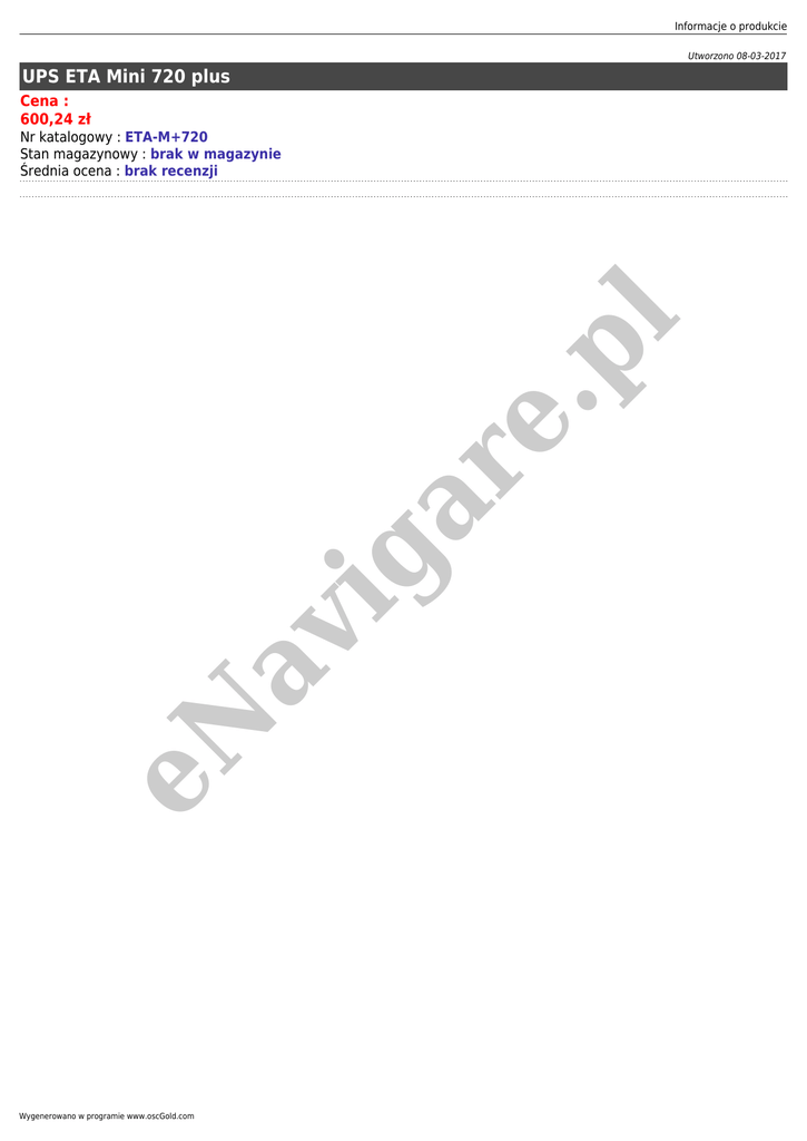 Informacje o produkcie Utworzono 08-03-2017 UPS ETA Mini 720 plus Cena : 600,24 zł eN av ig ar e. pl Nr katalogowy : ETA-M+720 Stan magazynowy : brak w magazynie Średnia ocena : brak recenzji Wygenerowano w programie www.oscGold.com