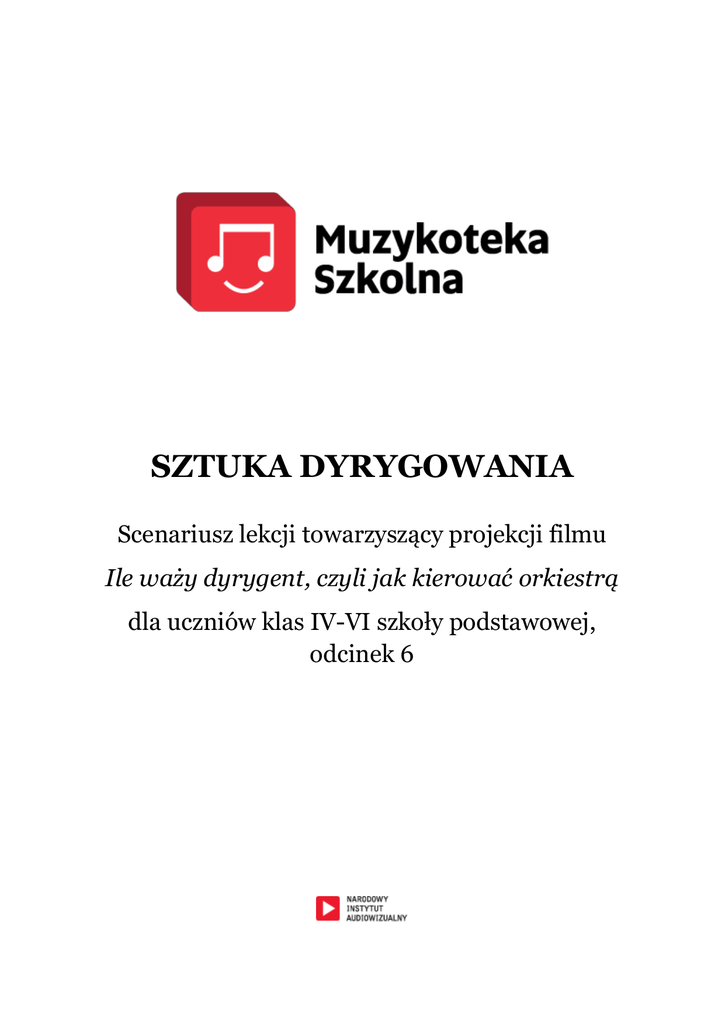SZTUKA DYRYGOWANIA Scenariusz lekcji towarzyszący projekcji filmu Ile waży dyrygent, czyli jak kierować orkiestrą dla uczniów klas IV-VI szkoły podstawowej, odcinek 6 Temat lekcji: Sztuka dyrygowania Czas trwania: 45 minut Cel lekcji: po zajęciach uczeń uświadamia sobie znaczenie roli dyrygenta potrafi wymienić jego główne zadania wie, czym jest partytura, jakie są jej elementy jest świadomy, jakie znaczenie ma sposób interpretacji utworu muzycznego zna zasady taktowania i kontrolowania tempa w utworze rozwija swą wrażliwość muzyczną, uczestnicząc w ćwiczeniach praktycznych Materiały: film z cyklu „Muzykoteka szkolna”(seria dla uczniów klas IV-VI szkoły podstawowej, odcinek 6, pt. Ile waży dyrygent, czyli jak kierować orkiestrą prezentacja multimedialna nagrania wideo prezentujące koncertowe wykonania następujących utworów (wszystkie dostępne są internecie): Ludwig van Beethoven, V Symfonia c-moll op. 67, cz. IV Allegro Johannes Brahms, I Symfonia c-moll op. 68, cz. IV Adagio – Più andante – Allegro non troppo, ma con brio – Più allegro (C-dur) Ryszard Wagner Uwertura do opery Tannhäuser G. Mahler I Symfonia pod. dyr. Simone’a Rattle’a G. Mahler II Symfonia ( finał) pod dyr. Leonarda Bernsteina P. Czajkowski Suita z baletu „Dziadek do orzechów” pod dyr. Seiji Ozawy I. Strawiński Kołysanka z Ognistego ptaka pod dyr. kompozytora metronom (najlepiej elektroniczny, może być również tradycyjny) batuta lub coś, co może ją zastąpić (np. zbliżonych wymiarów patyk) wydruk tekstu znanej uczniom piosenki – kilka kopii (piosenka ma być w metrum 2/4, 3/4 lub 4/4) 3 lub 4 grube flamastry w różnych kolorach 2 Przebieg lekcji: 1. SLAJD NR 1, 2 Podstawowe funkcje dyrygenta Przypominamy klasie tytuł piosenki, którą uczniowie dobrze znają (w metrum 2/4, 3/4 lub 4/4) i prosimy ich, by ją zaśpiewali SLAJD NR 3 – uwaga: nie akompaniujemy im na pianinie, nie gramy przygrywki, nie dajemy żadnego znaku do rozpoczęcia. Prawdopodobnie zapanuje lekka konsternacja, być może w końcu zacznie pojedyncza osoba, a reszta do niej dołączy (wówczas przerywamy wykonanie po kilku chwilach), a może w ogóle nie zaczną. Prosimy ich, by sami zanalizowali tę sytuację: nie wiadomo było, kiedy zacząć, przydałby się ktoś, kto pokaże początek. Wyjaśniamy, że tą osobą jest dyrygent, a jednym z jego zadań jest pokazanie wykonawcom momentu wspólnego wejścia na początku SLAJD NR 4. Ponawiamy próbę, tym razem dając uczniom ręką wyraźny znak do rozpoczęcia (nie dyrygujemy jednak dalej), oczywiście ponownie bez akompaniamentu. Wyjaśniamy uczniom, że równie ważne jest pokazanie zakończenia SLAJD NR 5 – prezentujemy przykłady wideo (w każdym przypadku chodzi o końcowe kilkanaście sekund): finałowe części V Symfonii Beethovena i I Symfonii Brahmsa oraz Uwertury do opery Tannhäuser Wagnera. Pytamy uczniów, czy muzykom byłoby łatwo zakończyć grę w tym samym momencie, gdyby nie było dyrygenta. Powracamy do piosenki SLAJD NR 6 – prosimy o zgłoszenie się 3-4 ochotników do „komisji”. Komisji wręczamy metronom ustawiony na tempo odpowiednie do naszej piosenki. Uczniów prosimy o ponowne jej wykonanie, śpiewamy najpierw sami kilka taktów, by pokazać właściwe tempo. Włączamy metronom (w przypadku elektronicznego bezgłośnie, jedynie z migającą diodą) i – synchronizując się z nim – pokazujemy wejście, nie dyrygujemy jednak dalej, uczniowie śpiewają sami. Komisja obserwuje metronom, słuchając śpiewającej klasy – najprawdopodobniej w którymś momencie uczniowie rozminą się z nim. Gdy stanie się to rażące, przerywamy wykonanie. Prosimy komisję o podzielenie się obserwacjami: wykonawcy nie trzymali tempa. Wyjaśniamy, że to kolejna funkcja dyrygenta – pilnowanie, by muzycy śpiewali/grali cały czas we właściwym tempie SLAJD NR 7. Pytamy uczniów, jak w takim razie najlepiej pokazać tempo podczas dyrygowania. Odpowiedź: trzeba jakoś machać ręką/rękami. Ale jak? SLAJD NR 8 Proponujemy najprostszy sposób – pokazywanie pulsu przez ruch ręką w dół na każdej ćwierćnucie. Prosimy ochotników o pokazanie tempa w taki sposób (demonstrując im to uprzednio) i podzielenie się wrażeniami. Z pewnością zauważą, że ręka szybko się męczy. Wyjaśniamy, że istnieje mniej męczący sposób, zwany taktowaniem: ręka idzie w dół tylko na „raz”, zaś na pozostałe miary w takcie podąża w innych kierunkach, zależnych od tego, czy muzyka jest „na 2”, „na 3” czy „na 4”. Próbujemy wspólnie określić, na ile jest nasza piosenka – prosimy uczniów o jej zaśpiewanie i jednoczesne klaskanie (lub tupanie) na „raz”, pomagając im w tym i głośno licząc. Rysujemy na tablicy uproszczony (bez zawijasów) schemat taktowania w ustalonym metrum (a na slajdzie prezentujemy wszystkie 3 podstawowe: na 2/4, 3/4 i 4/4 SLAJD NR 9), następnie uczymy klasę taktowania metrum z piosenki. Prosimy o zgłoszenie się ochotnika, który staje przed klasą – jego zadaniem będzie zadyrygowanie (za pomocą taktowania prawą ręką) kolejnym wykonaniem fragmentu piosenki. Jeśli będzie zainteresowane, dajemy również szansę paru innym ochotnikom. Wyjaśniamy, że taktowanie nie służy wyłącznie pokazywaniu tempa – dla profesjonalnych muzyków ważne jest również wskazywanie, na ile w takcie jest się w 3 danym momencie (na „raz”, na „dwa” itd.). Wyjaśniamy też, że uczniowie śpiewali piosenkę w sposób ciągły, ale np. w orkiestrze muzycy często wyłączają się z gry, a potem ponownie muszą do niej powrócić i to nie zawsze na „raz”, wówczas taktowanie dyrygenta pomaga odnaleźć właściwe miejsce. Podsumowujemy to, co już wiemy o funkcjach dyrygenta – potrzebny jest do: pokazywania momentu rozpoczęcia utworu pokazania jego zakończenia kontrolowania tempa SLAJD NR 10. Pytamy uczniów, czy wiedzą, jakie przedmioty bywają