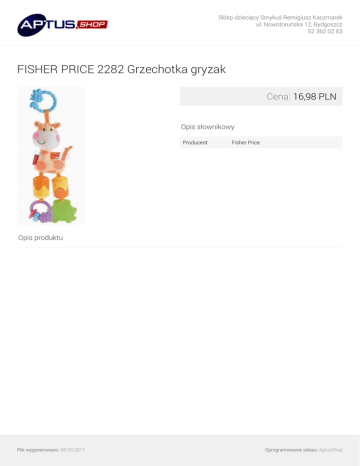 Sklep dziecięcy Smykuś Remigiusz Kaczmarek ul. Nowotoruńska 12, Bydgoszcz 52 362 02 63 FISHER PRICE 2282 Grzechotka gryzak Cena: 16,98 PLN Opis słownikowy Producent Fisher Price Opis produktu Plik wygenerowano: 08-03-2017 Powered by TCPDF (www.tcpdf.org) Oprogramowanie sklepu: AptusShop