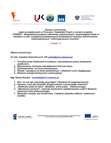Zestaw scenariuszy zajęć prowadzonych w Pracowni Dydaktyki Fizyki w ramach projektu „FENIKS – długofalowy program odbudowy, popularyzacji i wspomagania fizyki w szkołach w celu rozwijania podstawowych kompetencji naukowo-technicznych, matematycznych i informatycznych uczniów” ( Pakiet 7) Wykaz scenariuszy: Dr hab. Czesław Kizowski prof. UR [email protected] 1. Transformacja Galileusza w praktyce. (sprawdzanie prawa dodawania prędkości) 2. Wyznaczanie momentu bezwładności kuli lub walca. 3. Doświadczenia na torze powietrznym. 4. Wózek i sprężyna na torze powietrznym. ( Badanie ruchu drgającego) 5. Badanie energii kinetycznej i potencjalnej. Mgr Sylwia Budzik [email protected] 1. 2. 3. 4. Kto i co się tak naprawdę przyciąga? ( Badanie sił magnetycznych) Dynamo, czyli jak oświetlić drogę podczas nocnej jazdy rowerem? „Elektryka prąd nie tyka”. (Badanie praw prądu elektrycznego) „Wystarczy pocierać”, czyli jak skutecznie naelektryzować ciało?( Badanie własności pola elektrycznego) 5. Wszystko zaczęło się od jasności. ( badanie zjawiska odbicia i załamania światła) IProjekt FENIKS jest współfinansowany z Europejskiego Funduszu Społecznego w ramach programu operacyjnego KAPITAŁ LUDZK\ Uwagi o BHP dotyczące poszczególnych zestawów demonstracyjnych w Pracowni Dydaktyki Fizyki Instytutu Fizyki Uniwersytetu Rzeszowskiego 1. W zestawie pomocy „Elektrostatyka znajdują się urządzenia wytwarzające ładunki o napięciu kilku tysięcy wolt, a mianowicie maszyna elektrostatyczna i generator Van de Graffa. W celu bezpiecznego użytkowania tych przyrządów poleca się po zakończeniu ćwiczenia pamiętać o uziemieniu przez rozładowanie nadmiernej ilości ładunków nie wytwarzać nadmiernej ilości ładunków! 2. Korzystając ze źródła prądu dostarczonego przez tablicę rozdzielczą pracowni, nie należy podłączać do niego urządzeń bez zapoznania się z instrukcją ich obsługi oraz bez zgody prowadzącego zajęcia. Zawsze należy pamiętać, że gniazdo w białej obudowie ma napięcie 220 V, a pozostałe gniazda zaciskowe 9 V. 3. W pracowni korzystać będziemy z pomocy tzw. poliwalentnych. Są to skrzynki z elementami różnych części oprzyrządowania. Należy pamiętać, by po właściwym wykorzystaniu danych elementów złożyć je z powrotem do odpowiedniej skrzynki. 4. Induktor Ruhmkorffa służy jako źródło wysokiego napięcia, które nie tyle jest niebezpieczne dla zdrowia ze względu na dużą częstotliwość, ile ze względu na szkodliwość wyładowań iskrowych w obwodzie wtórnym, szczególnie w stosunku do organizmów słabych. 5. Należy pamiętać, że induktor zasilany jest prądem stałym o napięciu 9V oraz zwracać uwagę na to, by przewody elektryczne doprowadzające napięcie do innych przyrządów nie krzyżowały się może to powodować zwarcia i iskrzenia. 6. W zjawiskach prezentujących linie sił pola elektrycznego przewodnika prostoliniowego, czy linii indukcji magnetycznej przewodnika kołowego czy solenoidu, korzystać musimy z prądu o dużym natężeniu 5 - 20 A. Dłuższe korzystanie jest jednak niewskazane, dlatego, też korzysta się z bardzo krótkich czerpań prądu poprzez styki chwilowe. Należy pamiętać, więc, by dotykanie przewodów wyjściowych ze źródła prądu dokonywać końcówką o dobrej izolacji. 7. W przyrządach, w których przez wyzwolenie sprężyn dokonujemy rzut ciał należy pamiętać, by zajmować odpowiednie miejsce, oraz tak kierować przyrząd, gdzie jest pewność bezpieczeństwa dla innych osób postronnych. 8. Ćwiczenia należy wykonywać w parach. 9. Po przygotowaniu zestawu doświadczalnego do pomiarów. należy powiadomić prowadzącego, aby sprawdził układ. Włączenie aparatury może się odbyć tylko w obecności prowadzącego zajęcia. 10. Podczas pomiarów należy zwracać uwagę na to, aby nie przekroczyć znamionowych wartości mierników, oporników itp. mierzone wielkości należy starannie i przejrzyście notować w tabeli pomiarów. 11. Podczas wykonywania doświadczenia nie wolno odchodzić od swego stanowiska pracy bez zezwolenia prowadzącego. 12. O wszystkich zauważonych usterkach lub zjawiskach nienormalnej pracy urządzeń należy powiadomić prowadzącego zajęcia. 13. Podczas zajęć należy w razie potrzeby rozmawiać przyciszonym głosem, aby nie przeszkadzać innym. Niezależnie od przedstawionych ostrzeżeń, należy zawsze przed przystąpieniem do ćwiczenia zapoznać się z instrukcjami obsługi przyrządów oraz stosownymi instrukcjami BHP. Fizyka na topie • • • Fizyka powinna być wykładana jako nauka przyrodnicza, nie zaś jako nauka matematyczna nauczanie fizyki powinno dawać przykład, jak się w ogóle zdobywa wiedzę w zakresie nauk przyrodniczych niezbędne są systematyczne ćwiczenia uczniów w samodzielnym obserwowaniu i eksperymentowaniu • „Teoria bez praktyki jest martwa, a praktyka bez teorii ślepa” • Z badań psychologii poznawczej wynika, że w myśleniu człowieka występują operacje i schematy operacji korespondujące ze strukturami logicznymi, które formują fizykę. • Jeśli rzeczywiście fizyka jest nauką o fundamentalnych prawach przyrody, to prawa te muszą pozostawać w ścisłym związku z ogólnymi formami umysłu lub wręcz nimi być • Idee, których źródłem jest fizyka, będą nadal tworzyć, tak jak tworzyły od początku XVII wieku, centralną część nowoczesnej kultury. Rozwój fizyki określa też możliwości rozwoju wielu nauk i technologii od kosmologii i nanoelektroniki do biologii i medycyny. To fizyka determinuje w ogromnym stopniu nasze poglądy i granice naszej działalności praktycznej. Zatem nikt nie może być nazwany specjalistą, czy człowiekiem wykształconym, jeżeli nie zna pewnego kanonu pojęć i idei fizycznych. • • •