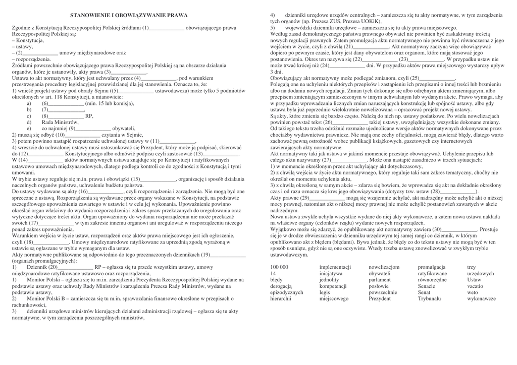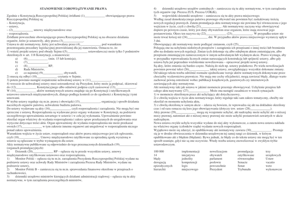 STANOWIENIE I OBOWI ZYWANIE PRAWA Zgodnie z Konstytucj Rzeczypospolitej Polskiej ródłami (1)_____________ obowi zuj cego prawa Rzeczypospolitej Polskiej s : – Konstytucja, – ustawy, – (2)_____________ umowy mi dzynarodowe oraz – rozporz dzenia. ródłami powszechnie obowi zuj cego prawa Rzeczypospolitej Polskiej s na obszarze działania organów, które je ustanowiły, akty prawa (3)_____________. Ustawa to akt normatywny, który jest uchwalany przez (4)_____________, pod warunkiem przestrzegania procedury legislacyjnej przewidzianej dla jej stanowienia. Oznacza to, e: 1) wnie projekt ustawy pod obrady Sejmu ((5)_____________ ustawodawcza) mo e tylko 5 podmiotów okre lonych w art. 118 Konstytucji, a mianowicie: a) (6)_____________ (min. 15 lub komisja), b) (7)_____________, c) (8)_____________ RP, d) Rada Ministrów, e) co najmniej (9)_____________ obywateli, 2) musz si odby (10)_____________ czytania w Sejmie, 3) potem powinno nast pi rozpatrzenie uchwalonej ustawy w (11)_____________, 4) wreszcie do uchwalonej ustawy musi ustosunkowa si Prezydent, który mo e j podpisa , skierowa do (12)_____________ Konstytucyjnego albo odmówi podpisu czyli zastosowa (13)_____________. W (14)_____________ aktów normatywnych ustawa znajduje si po Konstytucji i ratyfikowanych ustawowo umowach mi dzynarodowych, dlatego podlega kontroli co do zgodno ci z Konstytucj i tymi umowami. W trybie ustawy reguluje si m.in. prawa i obowi zki (15)_____________, organizacj i sposób działania naczelnych organów pa stwa, uchwalenie bud etu pa stwa. Do ustawy wydawane s akty (16)_____________, czyli rozporz dzenia i zarz dzenia. Nie mog by one sprzeczne z ustaw . Rozporz dzenia s wydawane przez organy wskazane w Konstytucji, na podstawie szczegółowego upowa nienia zawartego w ustawie i w celu jej wykonania. Upowa nienie powinno okre la organ wła ciwy do wydania rozporz dzenia i zakres spraw przekazanych do uregulowania oraz wytyczne dotycz ce tre ci aktu. Organ upowa niony do wydania rozporz dzenia nie mo e przekaza swoich (17)_____________ w tym zakresie innemu organowi ani uregulowa w rozporz dzeniu niczego ponad zakres upowa nienia. Warunkiem wej cia w ycie ustaw, rozporz dze oraz aktów prawa miejscowego jest ich ogłoszenie, czyli (18)_____________. Umowy mi dzynarodowe ratyfikowane za uprzedni zgod wyra on w ustawie s ogłaszane w trybie wymaganym dla ustaw. Akty normatywne publikowane s odpowiednio do tego przeznaczonych dziennikach (19)_____________ (organach promulgacyjnych): 1) Dziennik (20)_____________ RP – ogłasza si tu przede wszystkim ustawy, umowy mi dzynarodowe ratyfikowane ustawowo oraz rozporz dzenia, 1) Monitor Polski – ogłasza si tu m.in. zarz dzenia Prezydenta Rzeczypospolitej Polskiej wydane na podstawie ustawy oraz uchwały Rady Ministrów i zarz dzenia Prezesa Rady Ministrów, wydane na podstawie ustawy, 2) Monitor Polski B – zamieszcza si tu m.in. sprawozdania finansowe okre lone w przepisach o rachunkowo ci, 3) dzienniki urz dowe ministrów kieruj cych działami administracji rz dowej – ogłasza si tu akty normatywne, w tym zarz dzenia poszczególnych ministrów, 4) dzienniki urz dowe urz dów centralnych – zamieszcza si tu akty normatywne, w tym zarz dzenia tych organów (np. Prezesa ZUS, Prezesa UOKiK), 5) wojewódzki dzienniki urz dowe – zamieszcza si tu akty prawa miejscowego. Według zasad demokratycznego pa stwa prawnego obywatel nie powinien by zaskakiwany tre ci nowych regulacji prawnych. Zatem promulgacja aktu normatywnego nie powinna by równoczesna z jego wej ciem w ycie, czyli z chwil (21)_____________. Akt normatywny zaczyna wi c obowi zywa dopiero po pewnym czasie, który jest dany obywatelom oraz organom, które maj stosowa jego postanowienia. Okres ten nazywa si (22)_____________ (23)_____________. W przypadku ustaw nie mo e trwa krócej ni (24)_____________ dni. W przypadku aktów prawa miejscowego wystarczy upływ 3 dni. Obowi zuj cy akt normatywny mo e podlega zmianom, czyli (25)_____________. Polegaj one na uchyleniu niektórych przepisów i zast pieniu ich przepisami o innej tre ci lub brzmieniu albo na dodaniu nowych regulacji. Zmian tych dokonuje si albo odr bnym aktem zmieniaj cym, albo przepisem zmieniaj cym zamieszczonym w innym uchwalanym lub wydanym akcie. Prawo wymaga, aby w przypadku wprowadzania licznych zmian naruszaj cych konstrukcj lub spójno ustawy, albo gdy ustawa była ju poprzednio wielokrotnie nowelizowana – opracowa projekt nowej ustawy. S akty, które zmienia si bardzo cz sto. Nale do nich np. ustawy podatkowe. Po wielu nowelizacjach powinien powsta tekst (26)_____________ takiej ustawy, uwzgl dniaj cy wszystkie dokonane zmiany. Od takiego tekstu trzeba odró ni rozmaite ujednolicane wersje aktów normatywnych dokonywane przez chocia by wydawnictwa prawnicze. Nie maj one cechy oficjalno ci, mog zawiera bł dy, dlatego warto zachowa pewn ostro no wobec publikacji ksi kowych, gazetowych czy internetowych zawieraj cych akty normatywne. Akt normatywny taki jak ustawa w jakim momencie przestaje obowi zywa . Uchylenie przepisu lub całego aktu nazywamy (27)_____________. Mo e ona nast pi zasadniczo w trzech sytuacjach: 1) w momencie okre lonym przez akt uchylaj cy akt dotychczasowy, 2) z chwil wej cia w ycie aktu normatywnego, który reguluje taki sam zakres tematyczny, cho by nie okre lał on momentu uchylenia aktu, 3) z chwil okre lon w samym akcie – zdarza si bowiem, e wprowadza si akt na dokładnie okre lony czas i od razu oznacza si kres jego obowi zywania (dotyczy tzw. ustaw (28)_____________). Akty prawne (29)_____________ mog si wzajemnie uchyla , akt nadrz dny mo e uchyli akt o ni szej mocy prawnej, natomiast akt o ni szej mocy prawnej nie mo e uchyli postanowie zawartych w akcie nadrz dnym. Nowa ustawa zwykle uchyla wszystkie wydane do niej akty wykonawcze, a zatem nowa ustawa nakłada na wła ciwe organy (członków rz du) wydanie nowych rozporz dze . Wyj tkowo mo e si zdarzy , e opublikowany akt normatywny zaw
