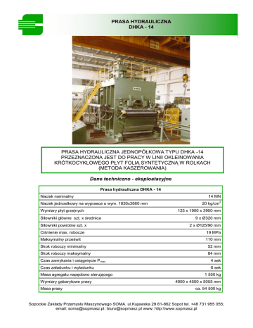PRASA HYDRAULICZNA DHKA - 14 PRASA HYDRAULICZNA JEDNOPÓŁKOWA TYPU DHKA -14 PRZEZNACZONA JEST DO PRACY W LINII OKLEINOWANIA KRÓTKOCYKLOWEGO PŁYT FOLIĄ SYNTETYCZNĄ W ROLKACH (METODA KASZEROWANIA) Dane techniczno - eksploatacyjne Prasa hydrauliczna DHKA - 14 Nacisk nominalny Nacisk jednostkowy na wyprasce o wym. 1830x3660 mm Wymiary płyt grzejnych Siłowniki główne szt. x średnica Siłowniki powrotne szt. x 14 MN 20 kg/cm2 125 x 1900 x 3900 mm 9 x Ø320 mm 2 x Ø125/90 mm Ciśnienie max. robocze 19 MPa Maksymalny prześwit 110 mm Skok roboczy minimalny 52 mm Skok roboczy maksymalny 84 mm Czas zamykania i osiągnięcie Pmax 4 sek Czas załadunku i wyładunku 6 sek Masa agregatu napędowo sterującego Wymiary gabarytowe prasy Masa prasy 1 550 kg 4900 x 4500 x 5055 mm ca. 54 500 kg Sopockie Zakłady Przemysłu Maszynowego SOMA. ul.Kujawska 29 81-862 Sopot tel. +48 731 955 055; email: [email protected]; [email protected] www: http:\\www.sopmasz.pl PRASA HYDRAULICZNA DHKA - 14 Opis budowy i działania W skład prasy wchodzi ponadto: W skład urządzenia wchodzi prasa hydrauliczna, agregat napędowo sterujący, pulpit sterowniczy, elektroniczne bariery ochronne, przenośnik załadowczy i wyładowczy. Wyposażenie specjalne (dodatkowe): Agregat grzewczy AGEO-80. Zasada działania: Prasa DHKA - 14 jest konstrukcji ramowej. Korpus prasy jest dzielony, składa się z trzech segmentów, które połączone ze sobą w sposób rozbieralny. W górnej części korpusu osadzone są cylindry hydrauliczne. Nurniki cylindrów połączone są elastycznie z belkami oporowymi, a następnie z górną płytą grzejną. Płyty grzejne wykonane są ze stalowych płyt z wierconymi poprzecznie kanałami grzewczymi. Ogrzewane są gorącym olejem doprowadzonym z układu grzejnego. Płyty grzejne posiadają izolację cieplną. Do górnej płyty zamontowane dwa cylindry podnoszące oraz układ stabilizacji ruchu płyty. Powierzchnie robocze dolnej i górnej płyty grzejnej, poprzez podkładki wyrównawcze, pokryte są blachami matrycowymi, mocowanymi przez zespół zawieszenia. Powierzchnia robocza dolnej płyty grzejnej pokryta jest przesuwnym przenośnikiem taśmowym, wykonanym z folii termoodpornej. Na prasie zamontowany jest zespół napędu hydraulicznego. Sterowanie prasą z uwzględnieniem działania układu elektrycznego napędu hydraulicznego prasy, przenośnika prasy zsynchronizowanego z przenośnikiem załadowczym i wyładowczym odbywa się z pulpitu sterowniczego za pomocą sterownika prasy współpracującego ze sterownikiem linii kaszerowania. Sopockie Zakłady Przemysłu Maszynowego SOMA. ul.Kujawska 29 81-862 Sopot tel. +48 731 955 055; email: [email protected]; [email protected] www: http:\\www.sopmasz.pl