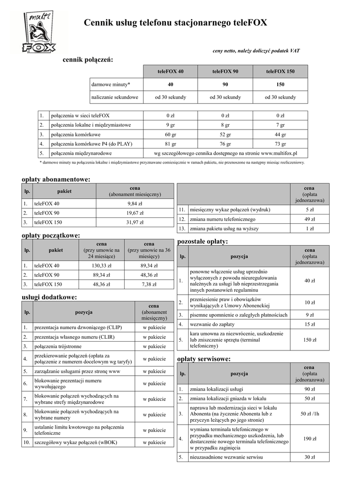 Cennik usług telefonu stacjonarnego teleFOX ceny netto, należy doliczyć podatek VAT cennik połączeń: teleFOX 40 teleFOX 90 teleFOX 150 40 90 150 od 30 sekundy od 30 sekundy od 30 sekundy darmowe minuty* naliczanie sekundowe 1. połączenia w sieci teleFOX 0 zł 0 zł 0 zł 2. połączenia lokalne i międzymiastowe 9 gr 8 gr 7 gr 3. połączenia komórkowe 60 gr 52 gr 44 gr 4. połączenia komórkowe P4 (do PLAY) 81 gr 76 gr 73 gr 5. połączenia międzynarodowe wg szczegółowego cennika dostępnego na stronie www.multifox.pl * darmowe minuty na połączenia lokalne i międzymiastowe przyznawane comiesięcznie w ramach pakietu, nie przenoszone na następny miesiąc rozliczeniowy. opłaty abonamentowe: lp. cena (abonament miesięczny) pakiet 1. teleFOX 40 9,84 zł 2. teleFOX 90 19,67 zł 3. teleFOX 150 31,97 zł opłaty początkowe: lp. pakiet cena (przy umowie na 24 miesiące) cena (przy umowie na 36 miesięcy) 1. teleFOX 40 130,33 zł 89,34 zł 2. teleFOX 90 89,34 zł 48,36 zł 3. teleFOX 150 48,36 zł 7,38 zł usługi dodatkowe: lp. pozycja cena (abonament miesięczny) 1. prezentacja numeru dzwoniącego (CLIP) w pakiecie 2. prezentacja własnego numeru (CLIR) w pakiecie 3. połączenia trójstronne w pakiecie 4. przekierowanie połączeń (opłata za połączenie z numerem docelowym wg taryfy) w pakiecie 5. zarządzanie usługami przez stronę www w pakiecie 6. blokowanie prezentacji numeru wywołującego w pakiecie 7. blokowanie połączeń wychodzących na wybrane strefy międzynarodowe 8. 9. cena (opłata jednorazowa) 11. miesięczny wykaz połączeń (wydruk) 5 zł 12. zmiana numeru telefonicznego 49 zł 13. zmiana pakietu usług na wyższy 1 zł pozostałe opłaty: lp. pozycja cena (opłata jednorazowa) 1. ponowne włączenie usług uprzednio wyłączonych z powodu nieuregulowania należnych za usługi lub nieprzestrzegania innych postanowień regulaminu 40 zł 2. przeniesienie praw i obowiązków wynikających z Umowy Abonenckiej 10 zł 3. pisemne upomnienie o zaległych płatnościach 9 zł 4. wezwanie do zapłaty 15 zł 5. kara umowna za niezwrócenie, uszkodzenie lub zniszczenie sprzętu (terminal telefoniczny) 150 zł opłaty serwisowe: lp. pozycja cena (opłata jednorazowa) 1. zmiana lokalizacji usługi 90 zł w pakiecie 2. zmiana lokalizacji gniazda w lokalu 50 zł blokowanie połączeń wychodzących na wybrane numery w pakiecie 3. naprawa lub modernizacja sieci w lokalu Abonenta (na życzenie Abonenta lub z przyczyn leżących po jego stronie) ustalanie limitu kwotowego na połączenia telefoniczne w pakiecie 4. wymiana terminala telefonicznego w przypadku mechanicznego uszkodzenia, lub dostarczenie nowego terminala telefonicznego w przypadku zaginięcia 190 zł 5. nieuzasadnione wezwanie serwisu 30 zł 10. szczegółowy wykaz połączeń (wBOK) w pakiecie 50 zł /1h