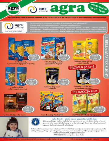 agra od 1989r. agra ofer t 28.0 a ważn a 1-1 6.02 Agra Opole 45-565 Opole, ul. Obrońców Stalingradu 66, tel.: +48 (0-77) 456 78 50, fax: +48 (0-77) 453-05-76, [email protected], www.agra.opole.pl Od 1-go stycznia 2013r hurtownia Agra należy do ogólnopolskiej grupy zakupowej MPT. To kolejny krok w celu zaoferowania Naszym Odbiorcom jak najlepszych cen. Niezależnie od promocji Agry będą przeprowadzane dodatkowe akcje wspólne z grupą MPT - w styczniu ukazała się pierwsza gazetka z dodatkowymi rabatami, (np chałwa z Odry 10%). Poza wydrukowanymi folderami kolejna akcja to dodatkowy rabat 4% na cały asortyment Cukrów Nyskich w okresie 16-31.01.2013. Wkrótce kolejne promocje. www.grupampt.pl 2,49 1,22zł zł 1,49 1,22złzł 1,32 2,61 złzł 1,32 2,61 złzł 1,32 1,56 złzł netto netto brutto brutto Świderek nr 19, Łazanka nr 46, Spaghetti nr 4 500g 2,99 1,22zł zł netto netto netto netto brutto brutto Mlekołaki 250g muszelki czekoladowe, Piegołaki 0,96 1,22zł zł netto netto 1,32 3,14 złzł 1,32 1,04 złzł brutto brutto Cremona 80g classic niebieska Makaron 400g rurka, świderek kolorowa 0,48 1,22zł zł netto netto 1,32złzł 0,59 brutto brutto La Festa 20x25g milky, classico brutto brutto netto netto brutto brutto Makaron jajeczny 250g ryżyk, krajanka PROMOCJA 13+3 lubella/maspex suchy 2,49 1,22zł zł 32,91 1,22 zł zł netto netto 1,32zł zł 35,54 brutto brutto Cremona ZESTAW 13+3 200g classic niebieska PROMOCJA 12+2 0,99 1,22zł zł netto netto 1,32 1,22 złzł brutto brutto Czekodraże 50g PUCHATEK 30,38 1,22 zł zł netto netto 1,32złzł 32,81 brutto brutto EKOLAND ZESTAW 12+2 300g cytryna Julia Broda – córka naszej przedstawicielki Kasi. Julia, urodziła się z średnim niedosłuchem czuciowo - nerwowym. Ubytek słuchu w lewym i prawym uchu wynosi 70 dB,. Szansą na to aby Julia mogła słyszeć jest zakup kosztownych aparatów słuchowych oraz stała rehabilitacja. Kochani, jeśli chcecie nam pomóc w zakupie aparatów, w rehabilitacji i dalszej pracy nad jej rozwojem wystarczy przekazać 1% podatku wypełniając odpowiednią rubrykę w rocznym zeznaniu podatkowym PIT wpisując następujące dane : FUNDACJA DZIECIOM „ZDĄŻYĆ Z POMOCĄ” KRS 0000037904 z dopiskiem : Julia Broda. PURG Agra Opole nie ponosi odpowiedzialoności za ewentualne błędy w druku Oferta ważna do wyczerpania zapasów SŁONECZNE WA KACJE 2013 100 zł netto = 1 pkt SW Mar sa E l A la m de e i W n 5 0 0 0pk t W a p s y 1 8 0 0pk t Ko s 6 0 0 0pk t 2,95 1,22zł zł 1,32złzł 2,69 1,32 3,10 złzł netto netto netto netto brutto brutto Budyń banan-czekolada, banan-wiśnia, czekoladoowy, wiśniowy 125g słoik gerber 2,49 1,22zł zł brutto brutto Sok 300ml czerwone owoce, j-b-marchew, j-m-brzoskwinia, j-m-morela, j-m-pomarańcza, j-marchewka, j-w-jagoda, pomarańczowe owoce, żółe owoce BOBOFRUT 2,99 1,22zł zł 4,45 1,22złzł 1,32złzł 3,23 1,32 4,81 złzł netto netto netto netto brutto brutto Smakowite jarzynki z cielęcina, Jarzynki z delikatna rybka, Rosołek drobiowo - wołowy, Delikatne jarzynki z krolikiem, zupka jarzynowa z krolikiem 12x130g, delikatny kurczak, indyk 80g brutto brutto Ziemniaczki z gotowana rybka i n pietruszki, Wiosenna zupka z indykiem i koperkiem, Bukiet warzyw z rybką w s pomidorowym, Jarzynki z delikatnym schabem, Tradycyjny schab ze śliwką i warzywami, Delikatny kurczak z ziemniaczkami, Krupniczek z cielęciną, Rosołek z kurczakiem, Pomidorowa z indykiem i ryżem, Domowa zupka kalafiorowa z królikiem, Tradycyjny krupniczek drobiowy, Wołowina po staropolsku z kaszą 12x190g 15,29 1,22 zł zł netto netto netto netto 1,32złzł 4,45 1,32złzł 18,81 brutto brutto Galaretka 190g cytrynowa, cz.porzeczka, wiśnia, pomarańcza w czekoladzie brutto brutto Torciki orzechowo-czekoladowe, orzechowo-śmietankowo, truflowo-pistacjowe, waflowo-karmelowe 2,5kg 2,65 1,22złzł 2,68 1,22zł zł 1,32złzł 3,26 1,32złzł 3,30 netto netto netto netto brutto brutto brutto brutto Jeżyki 140g Adwokat, cafe, classic, kokosowe, pomarańczowe, orzechowe, dark cocoa, dark wiśnia Orzechy laskowe, Rodzynki 80g w czekoladzie, mlecznej czekoladzie, Migdały w czekoladzie mlecznej 1,99 1,22złzł 2,68 1,22zł zł 1,32złzł 2,45 1,32złzł 3,30 netto netto netto netto brutto brutto Wafle familijne 180g Cytrynowe, chałwowe, kakaowo-śmietankowe, kakaowe, kokosowe, orzechowe, śmietankowe, truskawkowo-śmietankowe brutto brutto Wiśnia 80g w czekoladzie paczka od 1989r. www.agra.opole.pl, Telefon: +48 (0-77) 456 78 50, fax: +48 (0-77) 453-05-76 agra jutrzenka 3,62 1,22zł zł kamis 1,29 1,22złzł 1,09 1,22złzł 1,32 1,39 złzł 1,32 1,13 zł zł netto netto netto netto brutto brutto brutto brutto Czosnek 25g granulowany Pieprz czarny mielony, ziarnisty, liść laurowy 6g, papryka słodka 20g, Ziele angielskie 15g nowość 1,17 złzł 1,22 1,29 1,22złzł 1,32 1,27 zł zł 1,32 1,39 złzł netto netto brutto brutto Bukiet smaku 75g 2,29 1,22zł zł netto netto netto netto 1,32 2,47 złzł brutto brutto FIX Karkówka w sosie musztardowym, kurczak z jabłkami 28g, kurczak z papryką i cebulą, 15g, szynka po staropolsku 28g + worek brutto brutto Majeranek 14g nowość 1,99 1,22złzł 1,29 1,22złzł netto netto netto netto 1,32 2,15 zł zł 1,32 1,39 złzł brutto brutto Przyprawa do bigosu i kapusty, do dań z fasoli, mięsa wieprzowego, gulaszu, mięsa mielonego 20g brutto brutto FIX Cygański kociołek, gulasz meksykański 42g, kurczak po chińsku 52g, kurczak po prowansalsku 36g, polędwiczki w sosie czosn-zioł 40g, Spaghetti bolognese, napoli 45g, zapiekanka z kurczakiem i brokułami 45g 0,61 1,22złzł 0,68 1,22zł zł 0,59 1,22zł zł 1,32złzł 0,80 1,32 0,81 złzł 1,32 0,73 złzł netto netto netto netto brutto brutto krÜger Pieprz 20g czarny mielony, liść laurowy 6g netto netto brutto brutto Majeranek 8g brutto brutto Pieprz 20g czarny ziarnisty 0,79 1,22złzł 4,59 1,22zł zł netto netto 1,32 0,97 złzł netto netto brutto brutto Wafel Pausenschnite 