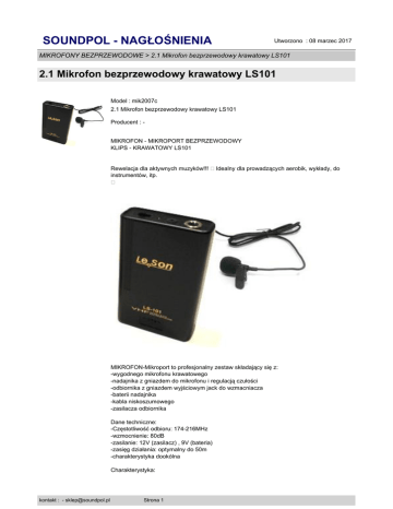 SOUNDPOL - NAGŁOŚNIENIA Utworzono : 08 marzec 2017 MIKROFONY BEZPRZEWODOWE > 2.1 Mikrofon bezprzewodowy krawatowy LS101 2.1 Mikrofon bezprzewodowy krawatowy LS101 Model : mik2007c 2.1 Mikrofon bezprzewodowy krawatowy LS101 Producent : MIKROFON - MIKROPORT BEZPRZEWODOWY KLIPS - KRAWATOWY LS101 Rewelacja dla aktywnych muzyków!!! �Idealny dla prowadzących aerobik, wykłady, do instrumentów, itp. � MIKROFON-Mikroport to profesjonalny zestaw składający się z: -wygodnego mikrofonu krawatowego -nadajnika z gniazdem do mikrofonu i regulacją czułości -odbiornika z gniazdem wyjściowym jack do wzmacniacza -baterii nadajnika -kabla niskoszumowego -zasilacza odbiornika Dane techniczne: -Częstotliwość odbioru: 174-216MHz -wzmocnienie: 80dB -zasilanie: 12V (zasilacz) , 9V (bateria) -zasięg działania: optymalny do 50m -charakterystyka dookólna Charakterystyka: kontakt : - [email protected] Strona 1 SOUNDPOL - NAGŁOŚNIENIA Utworzono : 08 marzec 2017 MIKROFONY BEZPRZEWODOWE > 2.1 Mikrofon bezprzewodowy krawatowy LS101 2.1 Mikrofon bezprzewodowy krawatowy LS101 Mikroport ma dużą czułość, świetną jakość dźwięku, dużo lepszą od innych, znanych mi mikroportów. Wierne przekazywanie dźwięku bez szumów i zakłóceń. Zestaw wykonany na kwarcu, odporny na wszelkie zakłócenia. Można używać w jednym pomieszczeniu 9 urządzeń bez obaw zakłócania się! DO MIKROPORTU MOŻNA PODPIĄĆ DODATKOWO MINIMIKROFON KTÓRY SPRAWDZI SIĘ JAKO PRZYSTAWKA DO GITARY AKUSTYCZNEJ, SKRZYPIEC LUB SAKSOFONU! � � kontakt : - [email protected] Strona 2 SOUNDPOL - NAGŁOŚNIENIA Utworzono : 08 marzec 2017 MIKROFONY BEZPRZEWODOWE > 2.1 Mikrofon bezprzewodowy krawatowy LS101 2.1 Mikrofon bezprzewodowy krawatowy LS101 kontakt : - [email protected] Strona 3 SOUNDPOL - NAGŁOŚNIENIA Utworzono : 08 marzec 2017 MIKROFONY BEZPRZEWODOWE > 2.1 Mikrofon bezprzewodowy krawatowy LS101 2.1 Mikrofon bezprzewodowy krawatowy LS101 � � kontakt : - [email protected] Strona 4 SOUNDPOL - NAGŁOŚNIENIA Utworzono : 08 marzec 2017 MIKROFONY BEZPRZEWODOWE > 2.1 Mikrofon bezprzewodowy krawatowy LS101 2.1 Mikrofon bezprzewodowy krawatowy LS101 kontakt : - [email protected] Strona 5 SOUNDPOL - NAGŁOŚNIENIA Utworzono : 08 marzec 2017 MIKROFONY BEZPRZEWODOWE > 2.1 Mikrofon bezprzewodowy krawatowy LS101 2.1 Mikrofon bezprzewodowy krawatowy LS101 � Cena : 140,00 zł Brutto ( 114,75 zł Netto) Dostępność: Produkt dostępny w naszym sklepie od 03 lipiec 2006 kontakt : - [email protected] Strona 6