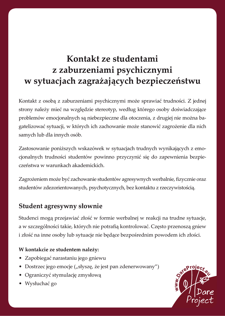 Kontakt ze studentami z zaburzeniami psychicznymi w sytuacjach zagrażających bezpieczeństwu Kontakt z osobą z zaburzeniami psychicznymi może sprawiać trudności. Z jednej strony należy mieć na względzie stereotyp, według którego osoby doświadczające problemów emocjonalnych są niebezpieczne dla otoczenia, z drugiej nie można bagatelizować sytuacji, w których ich zachowanie może stanowić zagrożenie dla nich samych lub dla innych osób. Zastosowanie poniższych wskazówek w sytuacjach trudnych wynikających z emocjonalnych trudności studentów powinno przyczynić się do zapewnienia bezpieczeństwa w warunkach akademickich. Zagrożeniem może być zachowanie studentów agresywnych werbalnie, fizycznie oraz studentów zdezorientowanych, psychotycznych, bez kontaktu z rzeczywistością. Student agresywny słownie Studenci mogą przejawiać złość w formie werbalnej w reakcji na trudne sytuacje, a w szczególności takie, których nie potrafią kontrolować. Często przenoszą gniew i złość na inne osoby lub sytuacje nie będące bezpośrednim powodem ich złości. W kontakcie ze studentem należy: • Zapobiegać narastaniu jego gniewu • Dostrzec jego emocje („słyszę, że jest pan zdenerwowany”) • Ograniczyć stymulację zmysłową • Wysłuchać go • Postawić granice – wyrazić brak akceptacji sytuacji, w których krzyczy, wkracza w sferę intymną (brak akceptacji zachowania, nie studenta) • Obiecać rozmowę, gdy będzie spokojniejszy • Jeśli zachowanie studenta eskaluje wezwać służby porządkowe. Czego należy unikać: • Kłótni, podnoszenia głosu • Działania pod wpływem gniewu (zawstydzania lub ośmieszania studenta) • Naciskania na wyjaśnienie przyczyn agresywnego zachowania • Ignorowania sytuacji • Dotykania studenta. Student agresywny werbalnie i fizycznie Agresja może przejawiać się w różnych formach od zastraszania, słownych gróźb lub wyzwisk do agresji fizycznej skierowanej przeciw przedmiotom lub osobom. Jej przejawem mogą być również maile, telefony lub listy z pogróżkami. W kontakcie ze studentem należy: • Zadbać o bezpieczeństwo swoje i innych – w sytuacji bezpośredniego zagrożenia wezwać służby porządkowe (bezpośrednie groźby, fizyczne zagrożenie ze strony studenta wobec innych osób, rozbijanie przedmiotów, niszczenie mienia), nakazać opuszczenie sali innym studentom • Pozostając ze studentem do czasu przyjazdu służb porządkowych zapewnić sobie drogę ucieczki • Poprosić o asystę kogoś z personelu • Zachować spokój (może on korzystnie wpłynąć na studenta) • Wskazać studentowi w nieagresywny sposób, dla jakich zachowań nie ma akceptacji • Wyrażać się jasno • Obiecać rozmowę, gdy będzie spokojniejszy • Podczas rozmowy postawą ciała wyrażać pewność siebie (kontakt wzrokowy, wyprostowana postawa). Czego należy unikać: • Pozostawania w sytuacji zagrożenia • Samotnego rozmawiania ze studentem • Reagowania złością, gniewem lub agresją • Dotykania studenta, wkraczania w jego sferę intymną • Krytykowania studenta • Wykonywania nagłych ruchów. Student zdezorientowany, psychotyczny, bez kontaktu z rzeczywistością Myślenie psychotyczne objawia się brakiem prawidłowego kontaktu z rzeczywistością z powodu urojeń lub/i omamów oraz dezorganizacją zachowania (niezrozumiała, nielogiczna mowa, skrajnie dziwaczne zachowanie, wycofanie społeczne, nadmierna, nieuzasadniona podejrzliwość). W sytuacji kontaktu ze studentem należy: • Wezwać pogotowie, jeśli jego zachowanie jest bardzo zdezorganizowane lub istnieje obawa o zdrowie jego i innych osób • Rozmawiać ze studentem wprost i konkretnie • Wyrazić swoje obawy związane z sytuacją i przekonanie, że potrzebuje pomocy • Zwracać uwagę na uczucia studenta, ale nie potwierdzać jego urojeniowych przekonań („Rozumiem, że boi się pan teraz i nie czuje się pan bezpiecznie”) • Ograniczyć stymulację zmysłową studenta • Koncentrować się jedynie na tym, co dzieje się w chwili obecnej. Czego należy unikać: • Wkraczania w sferę intymną studenta • Niepokojenia go np. niepotrzebnymi pytaniami o sytuację • Dyskutowania z jego myślami urojeniowymi • Braku elastyczności w postępowaniu • Zalecania innym studentom, by zajęli się kolegą/koleżanką. Ulotka przygotowana na podstawie materiałów opracowanych w ramach projektu DARE 2 przez dr n. med. Edytę Dembińską – lekarza psychiatrę, asystentkę w Katedrze Psychoterapii UJCM, konsultantkę BON UJ w dziedzinie psychiatrii.