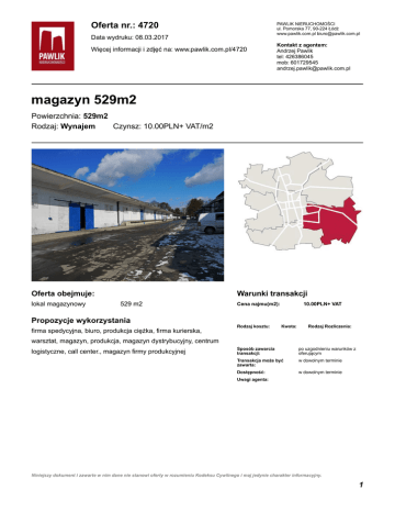 Oferta nr.: 4720 PAWLIK NIERUCHOMOŚCI ul. Pomorska 77, 90-224 Łódź www.pawlik.com.pl [email protected] Data wydruku: 08.03.2017 Więcej informacji i zdjęć na: www.pawlik.com.pl/4720 Kontakt z agentem: Andrzej Pawlik tel: 426386045 mob: 601729545 [email protected] magazyn 529m2 Powierzchnia: 529m2 Rodzaj: Wynajem Czynsz: 10.00PLN+ VAT/m2 Oferta obejmuje: lokal magazynowy Warunki transakcji 529 m2 Propozycje wykorzystania firma spedycyjna, biuro, produkcja ciężka, firma kurierska, Cena najmu(m2): Rodzaj kosztu: 10.00PLN+ VAT Kwota: Rodzaj Rozliczenia: warsztat, magazyn, produkcja, magazyn dystrybucyjny, centrum logistyczne, call center., magazyn firmy produkcyjnej Sposób zawarcia transakcji: po uzgodnieniu warunków z oferującym Transakcja może być zawarta: w dowolnym terminie Dostępność: w dowolnym terminie Uwagi agenta: Niniejszy dokument i zawarte w nim dane nie stanowi oferty w rozumieniu Kodeksu Cywilnego i maj jedynie charakter informacyjny. 1 Oferta nr.: 4720 Więcej informacji i zdjęć na: www.pawlik.com.pl/4720 Opis oferty Hala ogrzewana z rampą o pow. 989 mkw, którą można podzielić na dwie części. Wysokość hali od 4,3m przy drzwiach do 5,0 na środku magazynu, rampa na wysokości 1,1m od poziomu 0 i szerokości 2,5m. Wymiary bram magazynowych; szerokość 2,45 m wysokość 3,0 m. Nośność posadzki 3t/mkw. Stawka zawiera w sobie pełne koszty czyli: ochrona, media (energia, woda, co), przeglądy sprzętu ppoż. itp. Dostęp 24h/dobę. Oferta obejmuje lokal magazynowy Klasa obiektu: C Powierzchnia: 529 m2 Kondygnacja: Parter z parterowy Stan techniczny: bardzo dobry Rodzaje powierzchni użytkowych Kondygnacja Rodzaj powierzchni Powierzchnia Liczba pomieszczeń Parter magazynowy 529.00 m2 1 Kondygnacja Charakter powierzchni Powierzchnia Podłoga Ściana Parter magazynowy 529.00 m2 otynk. i pomal. bez wykończenia Standard beton Sufit Okna brak okien Stan techniczny Budynek istniejący Rok budowy Obecne wykorzystanie magazyn Opis techniczny Konstrukcja budynku: oparta na ścianach nośnych Strop: żelbetowy Kondygnacja Rodzaj powierzchni Powierzchnia Wysokość Siatka słupów Strop Parter magazynowy 529.00 m2 6.00 5.38 m x 8.40 m 3.00 Dostęp Rodzaj wrót dok rozładunkowy Wyposażenie Liczba 2 Szerokość 2.45 m Wysokość 3.00 m Bezpieczeństwo Monitoring Ochrona fizyczna Bocznica kolejowa P-poż Winda towarowa Teleinformatyka Dojazd TIR Ogrzewanie/klimatyzacja plac manewrowy Ogrzewanie Parking Dostęp do lokalu z terenu nieruchomości Niniejszy dokument i zawarte w nim dane nie stanowi oferty w rozumieniu Kodeksu Cywilnego i maj jedynie charakter informacyjny. 2 Oferta nr.: 4720 Więcej informacji i zdjęć na: www.pawlik.com.pl/4720 Media Toaleta Położenie do wykonania w lokalu Sąsiedztwo magazynowe Instalacja elektryczna Dostęp do drogi wewnętrzna Instalacja siłowa Droga utwardzona? Tak ZDJĘCIA OFERTY Niniejszy dokument i zawarte w nim dane nie stanowi oferty w rozumieniu Kodeksu Cywilnego i maj jedynie charakter informacyjny. 3 Oferta nr.: 4720 Więcej informacji i zdjęć na: www.pawlik.com.pl/4720 Niniejszy dokument i zawarte w nim dane nie stanowi oferty w rozumieniu Kodeksu Cywilnego i maj jedynie charakter informacyjny. 4