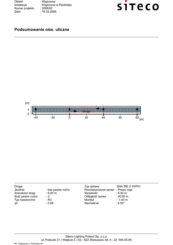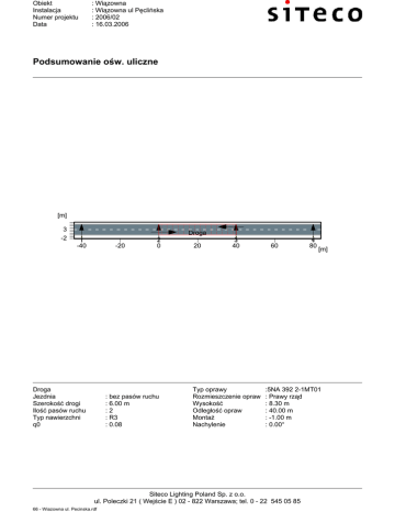 Obiekt Instalacja Numer projektu Data : Wiązowna : Wiązowna ul Pęclińska : 2006/02 : 16.03.2006 Podsumowanie ośw. uliczne [m] 3 -2 Droga 1 -40 -20 Droga Jezdnia Szerokość drogi Ilość pasów ruchu Typ nawierzchni q0 2 0 : bez pasów ruchu : 6.00 m :2 : R3 : 0.08 20 3 40 Typ oprawy Rozmieszczenie opraw Wysokość Odległość opraw Montaż Nachylenie 60 [m] :5NA 392 2-1MT01 : Prawy rząd : 8.30 m : 40.00 m : -1.00 m : 0.00° Siteco Lighting Poland Sp. z o.o. ul. Poleczki 21 ( Wejście E ) 02 - 822 Warszawa; tel. 0 - 22 545 05 85 66 - Wiazowna ul. Pecinska.rdf 4 80 Obiekt Instalacja Numer projektu Data : Wiązowna : Wiązowna ul Pęclińska : 2006/02 : 16.03.2006 Tabela, Luminancja, Droga (1) [m] 5.50 4.50 3.50 2.50 1.50 0.50 (0.3) (0.3) (0.3) (0.3) (0.3) (0.3) (0.3) 0.4 0.4 0.4 0.4 (0.3) (0.3) (0.3) 0.4 (0.3) (0.3) 0.4 0.4 0.4 0.4 0.5 0.5 0.6 0.6 0.4 (0.3) 0.4 0.4 0.4 (0.3) 0.4 0.5 0.5 0.6 0.6 0.7 0.7 0.6 0.4 0.4 0.4 0.4 0.5 0.4 0.5 0.5 0.6 0.7 0.8 0.8 0.8 0.7 0.5 0.6 0.5 0.5 0.5 0.4 0.5 0.6 0.7 [0.9] [0.9] [0.9] 0.8 0.7 0.5 0.6 0.5 0.5 0.6 0.5 0.6 0.6 0.7 0.7 0.8 [0.9] 0.8 0.7 0.6 0.6 0.5 1.43 4.29 7.14 10.00 12.86 15.71 18.57 21.43 24.29 27.14 30.00 32.86 35.71 38.57 Luminancja [cd/m2] Położenie obserwatora 1 Średnia luminancja Minimalna luminancja Równ. ogólna luminancji U0 Współczynnik olśnienia TI Równom. wzdłużna UI Lśr Lmin Lmin/Lśr TI Llmin/Llmax : x = -60, y = 1.5, z = 1.5 : 0.5 cd/m˛ : 0.3 cd/m˛ : 0.5 : 14.6 % : 0.45 Siteco Lighting Poland Sp. z o.o. ul. Poleczki 21 ( Wejście E ) 02 - 822 Warszawa; tel. 0 - 22 545 05 85 66 - Wiazowna ul. Pecinska.rdf [ Obiekt Instalacja Numer projektu Data : Wiązowna : Wiązowna ul Pęclińska : 2006/02 : 16.03.2006 Tabela, Luminancja, Droga (2) [m] 5.50 4.50 3.50 2.50 1.50 0.50 (0.3) (0.3) (0.3) 0.4 0.5 0.5 0.4 (0.3) 0.4 (0.3) (0.3) (0.3) (0.3) (0.3) 0.4 0.4 0.4 0.6 0.6 0.6 0.5 0.5 0.5 0.4 0.4 (0.3) (0.3) 0.4 0.4 0.4 0.5 0.7 0.8 0.8 0.7 0.7 0.6 0.5 0.5 0.4 0.4 0.4 0.5 0.6 0.5 0.8 0.9 0.9 0.9 0.9 0.8 0.7 0.6 0.5 0.5 0.5 0.5 0.6 0.6 0.8 0.9 1.0 [1.1] [1.1] 0.9 0.8 0.6 0.5 0.6 0.5 0.6 0.6 0.6 0.8 0.8 1.0 0.8 0.8 0.8 0.7 0.6 0.5 0.6 0.5 1.43 4.29 7.14 10.00 12.86 15.71 18.57 21.43 24.29 27.14 30.00 32.86 35.71 38.57 Luminancja [cd/m2] Położenie obserwatora 2 Średnia luminancja Minimalna luminancja Równ. ogólna luminancji U0 Współczynnik olśnienia TI Równom. wzdłużna UI Lśr Lmin Lmin/Lśr TI Llmin/Llmax : x = 100, y = 4.5, z = 1.5 : 0.6 cd/m˛ : 0.3 cd/m˛ : 0.47 : 7.7 % : 0.53 Siteco Lighting Poland Sp. z o.o. ul. Poleczki 21 ( Wejście E ) 02 - 822 Warszawa; tel. 0 - 22 545 05 85 66 - Wiazowna ul. Pecinska.rdf [ Obiekt Instalacja Numer projektu Data : Wiązowna : Wiązowna ul Pęclińska : 2006/02 : 16.03.2006 Podsumowanie rezultatów obliczeń, Droga u δ h u b Dane oprawy Producent Nr zamówienia Nazwa oprawy Wyposażenie : Siteco : 5NA 392 2-1MT01/ : ST 50 : 1 x ST (Osram) 70 W / 6500 lm Jezdnia Szerokość drogi Ilość pasów ruchu Typ nawierzchni q0 Ruch prawostronny : bez pasów ruchu (b) : 6.00 m :2 : R3 : 0.08 Rozmieszczenie opraw : Prawy rząd Wysokość (h) : 8.30 m Odległość opraw (a) : 40.00 m Montaż (u) : -1.00 m Nachylenie (δ) : 0.00° Współczynnik utrzymania : 0.80 Luminancja Położenie obserwatora 1 Średni U0 (min/śred) : x=-60.00m, y=1.50m, z=1.50m : 0.52 cd/m2 (ME5 min. 0.5) : 0.5 (ME5 min. 0.35) Położenie obserwatora 2 Średni U0 (min/śred) : x=100.00m, y=4.50m, z=1.50m : 0.58 cd/m2 (ME5 min. 0.5) : 0.47 (ME5 min. 0.35) Równomierność wzdłużna UI (B1: x = -60.00, y = 1.50, z = 1.50) UI (B2: x = 100.00, y = 4.50, z = 1.50) : 0.45 : 0.53 (ME5 min. 0.4) (ME5 min. 0.4) Olśnienie / Współczynnik otoczenia SR TI (B1: y=1.50m) SR : 14.60 % : 0.65 (ME5 max. 15) (ME5 min. 0.5) Siteco Lighting Poland Sp. z o.o. ul. Poleczki 21 ( Wejście E ) 02 - 822 Warszawa; tel. 0 - 22 545 05 85 66 - Wiazowna ul. Pecinska.rdf Obiekt Instalacja Numer projektu Data : Wiązowna : Wiązowna ul Pęclińska : 2006/02 : 16.03.2006 Arkusz danych, ST 50 (5NA 392 2-1MT01) Produkt: Siteco 5NA 392 2-1MT01 Street light ST 50 dla1 x high-pressure sodium lamp 70 W, zCG upper housing and gear tray made of glas fibre reinforced polyester power factor corrected radial facetted reflector diffuser, acryl Degree of protection:IP 65 Protection class: II Mounting type::Pylon annex luminaire, Pylon top luminaire default position, LP 1, RP 3 Dane oprawy Obliczenia kosztów Układ zapłonowy Moc oprawy Długość Szerokość Wysokość : : : : : : 81.3 CG 83 W 600 mm 290 mm 222 mm Wyposażenie Ilość Oznaczenie Moc Kolor Strum. św. Siteco Lighting Poland Sp. z o.o. ul. Poleczki 21 ( Wejście E ) 02 - 822 Warszawa; tel. 0 - 22 545 05 85 66 - Wiazowna ul. Pecinska.rdf : : : : : 1 ST (Osram) 70 W 6500 lm