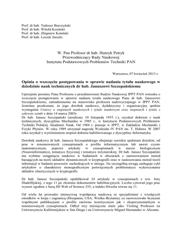 Prof. dr hab. Tadeusz Burczyński Prof. dr hab. Witold Kosiński Prof. dr hab. Zbigniew Kotulski Prof. dr hab. Leszek Jarecki W. Pan Profesor dr hab. Henryk Petryk Przewodniczący Rady Naukowej Instytutu Podstawowych Problemów Techniki PAN Warszawa, 07 kwiecień 2013 r. Opinia o wszczęciu postępowania w sprawie nadania tytułu naukowego w dziedzinie nauk technicznych dr hab. Januszowi Szczepańskiemu Uprzejmie prosimy Pana Profesora o przedstawienie Radzie Naukowej IPPT PAN wniosku o wszczęcie postępowania w sprawie nadania tytułu naukowego Panu dr hab. Januszowi Szczepańskiemu, zatrudnionemu na stanowisku profesora nadzwyczajnego w IPPT PAN. Jesteśmy przekonani, że jego dorobek naukowy, dydaktyczny i organizacyjny spełnia wymagania Ustawy o stopniach naukowych i tytule naukowym oraz stopniach i tytule z zakresie sztuki z dnia 14 marca 2003r. Dr hab. Janusz Szczepański (urodzony 10 listopada 1955 r.), uzyskał doktorat z nauk technicznych, dyscyplina Mechanika w 1985 r., w Instytucie Podstawowych Problemów Techniki Polskiej Akademii Nauk. Od 1984 r. pracuje w IPPT, w Zakładzie Mechaniki i Fizyki Płynów. W roku 1989 otrzymał nagrodę Wydziału IV PAN im. T. Hubera. W 2007 roku uzyskał z wyróżnieniem stopień doktora habilitowanego z dyscypliny Informatyka. Dorobek naukowy dr hab. Janusza Szczepańskiego obejmuje szerokie spektrum dziedzin, od prac w renomowanych czasopismach o profilu informatycznym lub nawet czysto matematycznym, poprzez artykuły w czasopismach w nurcie biologicznym (Neuroinformatics), tematyce fizycznej i tematyce inżynierskiej. Dr hab. Janusz Szczepański ma wybitne osiągnięcia naukowe w badaniach w obszarach z zastosowaniem metod bazujących na teorii układów dynamicznych w kryptografii oraz w zastosowaniu metod teorii informacji w badaniu procesów zachodzących w mózgu. Na szczególną uwagę zasługuje cykl artykułów o charakterze monograficznym poświęconych problematyce wykorzystania układów chaotycznych w kryptografii. Dr hab. Janusz Szczepański opublikował 34 artykuły w czasopismach z tzw. listy filadelfijskiej, z tego 11 po złożeniu dokumentów habilitacyjnych. Liczba cytowań jego prac wynosi zgodnie z bazą ISI Web of Science 255, a indeks Hirscha równa się 11. Od wielu lat prowadzi intensywną współpracę naukową ze specjalistami z wiodących ośrodków w kraju i zagranicą (Hiszpania, USA, Wielka Brytania), co zaowocowało licznymi wspólnymi publikacjami o profilu zarówno teoretycznym jak i eksperymentalnym w renomowanych czasopismach. Odbył trzy miesięczne staże jako Visiting Professor na Uniwersytecie Kalifornijskim w San Diego i na Uniwersytecie Miguel Hernandez w Alicante. Osiągnięcia naukowe uzyskane przez niego wspólnie ze współpracownikami w ciągu ostatnich 6 lat obejmują badania dotyczące analizy procesów transmisji informacji w sieciach neuronowych, szczególnie w mózgu (Neuroinformatyka, Teoria Informacji), bezpieczeństwa danych w sieciach teleinformatycznych, m.in. związanych z tym zagadnieniem aspektów kryptologicznych w kontekście problematyki chaosu dla układów o dyskretnej liczbie stanów. Dr hab. Janusz Szczepański ma także liczące się osiągnięcia organizacyjne. W szczególności należy wymienić pełnienie funkcji Sekretarza przez trzy kadencje (1991, 1993, 1995) konferencji „Polish-Swedish Symposium on Mechanics”. Od stycznia 2010 r. jest Zastępcą Przewodniczącego Rady Naukowej IPPT PAN oraz pełni funkcję Przewodniczącego Komisji Koordynacyjnej ds. stopni naukowych w IPPT PAN. Kierował i brał udział w licznych projektach badawczych KBN, MNiSW oraz NCN. Był też kierownikiem polsko-hiszpańskich projektów PAN-CSIC poświęconych zastosowaniom metod Teorii Informacji do analizy danych eksperymentalnych uzyskiwanych w Laboratorium Prof. M.V. Sanchez-Vives. Z ramienia NBP (spółka Centrast) współuczestniczył w przygotowaniu Ustawy o podpisie elektronicznym. Dr hab. Janusz Szczepański prowadzi także bardzo aktywną działalność na polu dydaktyki. Wypromował jednego doktora (dr Andrzej Chmielowiec, praca doktorska pt. : „Generowanie parametrów algorytmów klucza publicznego uwzględniające aspekty bezpieczeństwa i wydajności„ (obrona z wyróżnieniem w listopadzie 2012 r.). Z kolei przygotowanie rozprawy drugiego doktorant mgr Bartosza Paprockiego pt. : „Analiza wydajności transmisji danych w komórkach i sieciach neuronowych metodami Teorii Informacji„ jest bardzo zaawansowane. Ponadto, od roku 2007 dr hab. Janusz Szczepański prowadzi zajęcia jako profesor nadzwyczajny na Uniwersytecie Kazimierza Wielkiego w Bydgoszczy. Dotychczas wypromował 5-ciu magistrów oraz około 20 dyplomantów inżynierów. Tematyka wykładów to: rachunek prawdopodobieństwa z elementami statystyki, teoria informacji, bezpieczeństwo systemów teleinformatycznych, kryptografia. Przez wiele lat był członkiem Komisji oceniającej najlepsze prace magisterskie z zakresu kryptografii; prezentacja prac odbywała się podczas corocznych konferencji ENIGMA poświęconych bezpieczeństwu systemów teleinformatycznych. Dr hab. Janusz Szczepański jest stałym recenzentem m. in. takich czasopism jak IEEE Transactions on Circuits and Systems I oraz II, Physics Letters A, Neurocomputing, Applied Mathematical Modelling, Information Sciences. Recenzował dwie prace doktorskie: dr Gabrieli Mochol – Instytut Nenckiego i dr Stefana Kotowskiego – PJWSTK. Recenzował także kilka projektów NCBiR. Uważamy, że osiągnięcia naukowe, dydaktyczne i organizacyjne dr hab. Janusza Szczepańskiego w pełni uzasadniają wniosek o wszczęcie procedury nadania mu tytułu naukowego. Z poważaniem