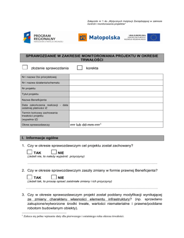 Załącznik nr 1 do „Wytycznych Instytucji Zarządzającej w zakresie kontroli i monitorowania projektów” SPRAWOZDANIE W ZAKRESIE MONITOROWANIA PROJEKTU W OKRESIE TRWAŁOŚCI złożenie sprawozdania korekta Nr i nazwa Osi priorytetowej Nr i nazwa działania/schematu Nr projektu Tytuł projektu Nazwa Beneficjenta Data zakończenia realizacji - data ostatniej płatności IZ Termin końcowy zachowania trwałości projektu (wypełnia IZ) rrrr lub dd-mm-rrrr1 Okres sprawozdawczy I. Informacje ogólne 1. Czy w okresie sprawozdawczym cel projektu został zachowany? TAK NIE (Jeżeli nie, to należy wyjaśnić przyczyny) ……………………………………………………………………………………………………………… 2. Czy w okresie sprawozdawczym zaszły zmiany w formie prawnej Beneficjenta? TAK NIE (Jeżeli tak, to proszę opisać zaistniałe zmiany i ich przyczyny) ..……………………………………………………………………………………………………………… 3. Czy w okresie sprawozdawczym projekt został poddany modyfikacji wynikającej ze zmiany charakteru własności elementu infrastruktury? (np. sprzedano zakupione/wytworzone środki trwałe, wartości niematerialne i prawne/poddane robotom budowlanym obiekty). 1 Zaleca się pełne wpisanie daty dla pierwszego i ostatniego roku okresu trwałości. TAK NIE (Jeżeli tak, to proszę opisać zaistniałe zmiany i ich przyczyny) ……………………………………………………………………………………………………………………… ……………………………………………………………………………………………………………………… ……………………………………………………………………………………………………....................... 4. Czy w okresie sprawozdawczym projekt został poddany modyfikacji polegającej na zaprzestaniu działalności produkcyjnej (działalności Beneficjenta, która została dofinansowana w ramach projektu). TAK NIE (Jeżeli tak, to proszę opisać zaistniałe zmiany i ich przyczyny) ……………………………………………………………………………………………………………………… ……………………………………………………………………………………………………………………… ……………………………………………………………………………………………………....................... 5. Czy w okresie sprawozdawczym projekt został poddany modyfikacji mającej wpływ na charakter lub warunki realizacji projektu? (np. infrastruktura powstała podczas realizacji projektu została wykorzystana na inny niż przewidziany we wniosku cel) TAK NIE (Jeżeli tak, to proszę opisać zaistniałe zmiany i ich przyczyny) ……………………………………………………………………………………………………………………… ……………………………………………………………………………………………………………………… …………………………………………………………………………………………………….... 6. Czy w okresie sprawozdawczym projekt został poddany modyfikacji powodującej uzyskanie nieuzasadnionej korzyści przez beneficjenta lub inny podmiot ? (np. na przedmiot objęty projektem uzyskano dofinansowanie ze środków publicznych wspólnotowych bądź krajowych, dofinansowano projekt z innych źródeł, np. NFOŚiGW, nastąpiło umorzenie kredytu; bądź oddano go w leasing, najem; TAK NIE (Jeżeli tak, to proszę opisać zaistniałe zmiany i ich przyczyny). ……………………………………………………………………………………………………………………… ……………………………………………………………………………………………………………………… ……………………………………………………………………………………………………....................... 7. Czy w trakcie trwania okresu realizacji projektu lub po jego zakończeniu projekt został skontrolowany przez instytucję zewnętrzną inną aniżeli IZ MRPO np. NIK, UKS, UZP? TAK NIE (Jeżeli tak, to należy podać zakres, termin przeprowadzenia kontroli oraz załączyć wyciąg z wyników kontroli – fragment w zakresie dotyczącym zrealizowanego projektu. Wyciąg z danej kontroli należy złożyć tylko jeden raz.) ……………………………………………………………………………………………………………………… ………………………………………………………………………………………………………...................... Strona 2 z 8 8. Czy w okresie trwałości przeprowadzano przeglądy gwarancyjne infrastruktury? TAK NIE NIE DOTYCZY (Jeśli tak, należy załączyć do sprawozdania potwierdzone za zgodność z oryginałem kopie protokołów z przeglądów i ewentualne protokoły z odbioru prac naprawczych) 9. Czy w okresie konserwacji? TAK sprawozdawczym NIE infrastruktura poddana była bieżącej NIE DOTYCZY (Jeśli tak, należy krótko opisać zakres prac lub/i załączyć aktualne zdjęcia, protokoły odbioru prac) 10. Czy w okresie sprawozdawczym dokonano wymiany lub modernizacji środków trwałych, wyposażenia zakupionego w ramach projektu? TAK NIE NIE DOTYCZY (Jeśli tak, należy opisać jakie środki trwałe, wyposażenie zostało wymienione lub zmodernizowane oraz podać przyczynę wymiany/modernizacji) II. Promocja projektu 1. Czy Beneficjent stosuje odpowiednie środki informowania i promocji projektu, zgodnie z umową zawartą w ramach MRPO? TAK NIE 2. Proszę wymienić instrumenty informacji i promocji, które są stosowane dla projektu. (Instrumentami informacji i promocji projektu są m.in. tablice informacyjne,
