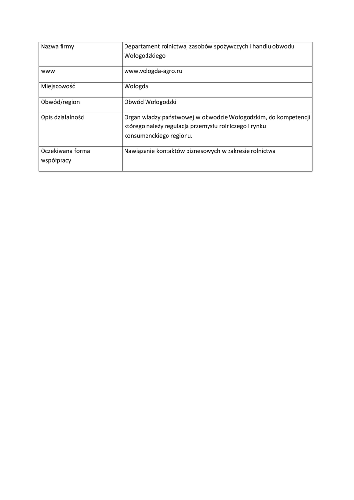 Nazwa firmy Departament rolnictwa, zasobów spożywczych i handlu obwodu Wołogodzkiego www www.vologda-agro.ru Miejscowość Wołogda Obwód/region Obwód Wołogodzki Opis działalności Organ władzy państwowej w obwodzie Wołogodzkim, do kompetencji którego należy regulacja przemysłu rolniczego i rynku konsumenckiego regionu. Oczekiwana forma współpracy Nawiązanie kontaktów biznesowych w zakresie rolnictwa