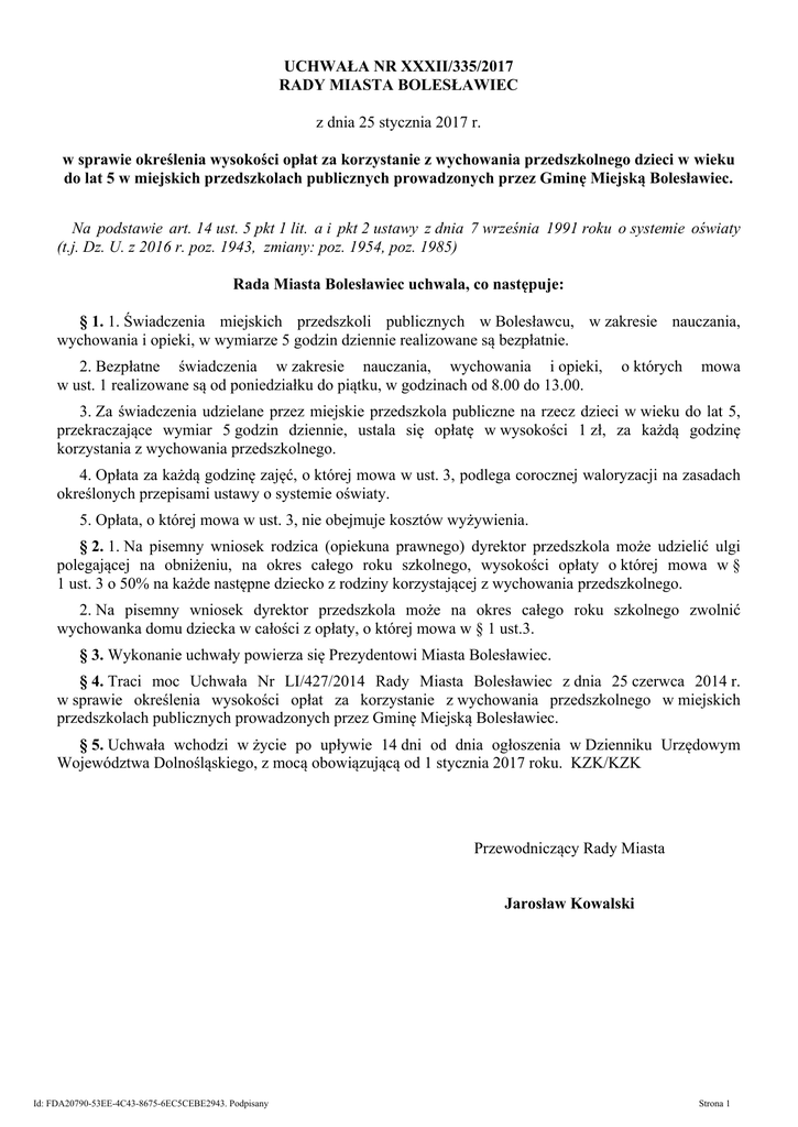 UCHWAŁA NR XXXII/335/2017 RADY MIASTA BOLESŁAWIEC z dnia 25 stycznia 2017 r. w sprawie określenia wysokości opłat za korzystanie z wychowania przedszkolnego dzieci w wieku do lat 5 w miejskich przedszkolach publicznych prowadzonych przez Gminę Miejską Bolesławiec. Na podstawie art. 14 ust. 5 pkt 1 lit. a i pkt 2 ustawy z dnia 7 września 1991 roku o systemie oświaty (t.j. Dz. U. z 2016 r. poz. 1943, zmiany: poz. 1954, poz. 1985) Rada Miasta Bolesławiec uchwala, co następuje: § 1. 1. Świadczenia miejskich przedszkoli publicznych w Bolesławcu, w zakresie nauczania, wychowania i opieki, w wymiarze 5 godzin dziennie realizowane są bezpłatnie. 2. Bezpłatne świadczenia w zakresie nauczania, wychowania i opieki, w ust. 1 realizowane są od poniedziałku do piątku, w godzinach od 8.00 do 13.00. o których mowa 3. Za świadczenia udzielane przez miejskie przedszkola publiczne na rzecz dzieci w wieku do lat 5, przekraczające wymiar 5 godzin dziennie, ustala się opłatę w wysokości 1 zł, za każdą godzinę korzystania z wychowania przedszkolnego. 4. Opłata za każdą godzinę zajęć, o której mowa w ust. 3, podlega corocznej waloryzacji na zasadach określonych przepisami ustawy o systemie oświaty. 5. Opłata, o której mowa w ust. 3, nie obejmuje kosztów wyżywienia. § 2. 1. Na pisemny wniosek rodzica (opiekuna prawnego) dyrektor przedszkola może udzielić ulgi polegającej na obniżeniu, na okres całego roku szkolnego, wysokości opłaty o której mowa w § 1 ust. 3 o 50% na każde następne dziecko z rodziny korzystającej z wychowania przedszkolnego. 2. Na pisemny wniosek dyrektor przedszkola może na okres całego roku szkolnego zwolnić wychowanka domu dziecka w całości z opłaty, o której mowa w § 1 ust.3. § 3. Wykonanie uchwały powierza się Prezydentowi Miasta Bolesławiec. § 4. Traci moc Uchwała Nr LI/427/2014 Rady Miasta Bolesławiec z dnia 25 czerwca 2014 r. w sprawie określenia wysokości opłat za korzystanie z wychowania przedszkolnego w miejskich przedszkolach publicznych prowadzonych przez Gminę Miejską Bolesławiec. § 5. Uchwała wchodzi w życie po upływie 14 dni od dnia ogłoszenia w Dzienniku Urzędowym Województwa Dolnośląskiego, z mocą obowiązującą od 1 stycznia 2017 roku. KZK/KZK Przewodniczący Rady Miasta Jarosław Kowalski Id: FDA20790-53EE-4C43-8675-6EC5CEBE2943. Podpisany Strona 1 Uzasadnienie 1) Zmiana uchwały wynika ze zmiany ustawy z dnia 1 grudnia 2016 r. o dochodach jednostek samorządu terytorialnego oraz niektórych innych ustaw ((Dz. U. z 2016 r., poz. 1985). Wynika z niej, że podział części oświatowej subwencji ogólnej między jednostki samorządu terytorialnego odbędzie się z uwzględnieniem, mi.in. „liczby dzieci w wieku 6 lat i powyżej, objętych wychowaniem przedszkolnym w przedszkolach, oddziałach przedszkolnych w szkołach podstawowych i innych formach wychowania przedszkolnego”. Wprowadza również zmiany w zakresie opłat za korzystanie z wychowania przedszkolnego dzieci w wieku do lat 5. 2) Zgodnie z zapisami ustawy o systemie oświaty (Dz. U. z 2016 r. poz. 1943 i 1954) rada gminy określa wysokość opłat za korzystanie z wychowania przedszkolnego w prowadzonych przez gminę publicznym przedszkolu lub publicznej innej formie wychowania przedszkolnego, a także może określić warunki częściowego lub całkowitego zwolnienia z opłat powyżej 5 godzin. 3) Dotychczasowa uchwała Rady Miasta Bolesławiec Nr LI/427/2014 z dnia 25 czerwca 2014 r. w sprawie określenia wysokości opłat za korzystanie z wychowania przedszkolnego w miejskich przedszkolach publicznych prowadzonych przez Gminę Miejską Bolesławiec obejmowała wszystkie dzieci, również 6-letnie i starsze objęte wychowaniem przedszkolnym. Ustawodawca wprowadził zmianę dotyczącą wieku dzieci. Zgodnie z nią, od stycznia 2017 r. dzieci sześcioletnie i starsze uczęszczające do przedszkoli, oddziałów przedszkolnych i innych form wychowania przedszkolnego objęte zostaną dofinansowaniem w ramach subwencji oświatowej. Natomiast na dofinansowanie zadań w zakresie wychowania przedszkolnego dzieci w wieku do lat 5 gmina otrzyma dotację celową. 4) Brak możliwości pobierania opłat za pobyt dziecka w wieku 6 lat i więcej w publicznej placówce wychowania przedszkolnego oznacza, że rodzice dzieci realizujących obowiązek rocznego przygotowania przedszkolnego będą ponosić jedynie opłaty za korzystanie przez dziecko z wyżywienia. Szacuje się, że z budżetu państwa gmina uzyska nieplanowaną średnią kwotę subwencji oświatowej w wysokości ok. 4.089 zł na jedno dziecko, tj. około 1.150.000 zł na dzieci w miejskich przedszkolach publicznych. 5) Na realizację zadań z zakresu wychowania przedszkolnego, oprócz środków własnych, gmina otrzymuje dotację celową z budżetu państwa. Na 2017 r. planowana kwota dotacji wynosi 1.338 zł na jedno dziecko. 6) Nie przewiduje się w chwili obecnej wydawania aktów wykonawczych do niniejszej uchwały. 7) Konsultacje nie zostały przeprowadzone, ponieważ przepisy powszechnie obowiązujące nie przewidują dla podjęcia niniejszej uchwały obowiązku przeprowadzania konsultacji oraz uzyskania opinii. 8) Nie ma możliwości podjęcia działań alternatywnych do wskazanych w przedmiotowej uchwale z uwagi na obowiązującą regulację prawną. 9) Uchwała wchodzi w życie po upływie 14 dni od ogłoszenia w Dzienniku Urzędowym Województwa Dolnośląskiego z mocą obowiązującą od dnia 1 stycznia 2017 r. KZK/KZK Przewodniczący Rady Miasta Jarosław Kowalski Id: FDA20790-53EE-4C43-8675-6EC5CEBE2943. Podpisany Strona 1