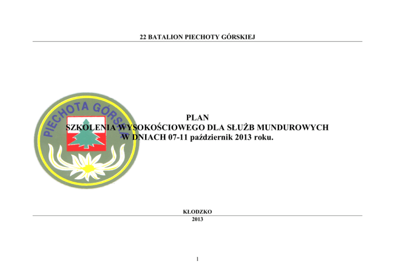 22 BATALION PIECHOTY GÓRSKIEJ PLAN SZKOLENIA WYSOKOŚCIOWEGO DLA SŁUŻB MUNDUROWYCH W DNIACH 07-11 październik 2013 roku. KŁODZKO 2013 1 PROGRAM SZKOLENIA Data Godzina do godz 16.00 Temat zajęć Odpowiedzialny za realizację Zakwaterowanie uczestników szkolenia, wydanie przepustek Miejsce plac apelowy batalionu 07.10. 16.30-18.30 Uroczyste rozpoczęcie szkolenia 13. Omówienie programu szkolenia, zapoznanie z warunkami bezpieczeństwa na czas szkolenia. 8.00-8.30 Przejazd do miejsca szkolenia 9.00-14.00 Zagadnienia: - Sprzęt ratowniczy. Kierownicy grup szkoleniowych Instruktorzy 22 bpg Twierdza Kłodzka, Ratusz Indywidualnie Kłodzko Instruktorzy 22 bpg Twierdza Kłodzka - Podstawowe techniki ratownicze, - Zjazdy, przepinki, „M” - Budowa kolejek linowych i „tyrolskich” 08.10. 13. 14.00-15.00 Przerwa obiadowa Zagadnienia: 15.00-18.00 WYPADEK MASOWY (10osób) - segregacja poszkodowanych - ewakuacja wg. priorytetów rannych z kazamatów Twierdzy. Kierownik szkolenia 18.00-18.30 Odprawa kierowników grup szkoleniowych 2 Twierdza Kłodzka Uwagi 7.30-8.30 Przejazd do miejsca szkolenia 9.00- 13.30 Zagadnienia: - Budowa stanowisk do technik linowych - Budowa mostów linowych - Budowa stanowisk do ewakuacji ze szczelin - techniki improwizowane 09.10. 13. Kierownicy grup szkoleniowych Instruktorzy 22 bpg Lądek Zdrój góra Trojak 13.30-14.30 Przerwa obiadowa 14.30-17.30 Zagadnienia: Indywidualnie - Zabezpieczenie oraz ewakuacja (różnymi sposobami) poszkodowanych ze szczelin Instruktorzy 22 bpg - Transport poszkodowanych za pomocą technik linowych (kolejki poziome i kolejki tyrolskie) 17.30-18.00 Odprawa kierowników grup szkoleniowych Kierownik szkolenia 7.30-8.30 Kierownicy grup szkoleniowych Przejazd do miejsca szkolenia 08.30-13.30 PRZEMIESZCZANIE SIĘ ORAZ TRANSPORT TECHNIKAMI KOMBINOWANYMI LUDZI I SPRZĘTU. 10.10. Zagadnienia: 13. - Budowa różnych stanowisk do technik linowych - Zjazdy i przepinki do wyjścia bez styczności z lustrem wody - Budowa długich kolejek - Sposoby transportu lin na drugi brzeg 3 Instruktorzy 22 bpg Kamieniołom Głuszyca Górna - Przepinki z lin poziomych do zjazdu - Zjazd do środka pływającego 13.30-14.30 Przerwa obiadowa Indywidualnie 14.30-18.00 Zagadnienia: - Przepinki z lin poziomych do zjazdu - Zjazd do wody - Podjęcie ludzi z wody do środka pływającego - Transport środkiem pływającym do miejsca podebrania przez śmigłowiec Instruktorzy 22 bpg 18.00-18.30 Odprawa kierowników grup szkoleniowych Kierownik szkolenia 7.30-08.30 Kierownicy grup szkoleniowych Przejazd do miejsca szkolenia 09.00-13.30 Zaganienia: - Budowa stanowisk do technik linowych na konstrukcjach technicznych. - Długie zjazdy na różnych przyrządach Instruktorzy 22 bpg - Długie wejścia po linie - Wejście za pomocę drabinki speleo różne sposoby asekuracji 11.10. - Transport poszkodowanego za pomocą 13. przeciwwagi - Wybór stanowisk i sposoby naciągania lin do kolejki tyrolskiej. - Trasport poszkodowanego w koszu ewakuacyjnym 13.30-14.30 Przerwa obiadowa Indywidualnie 4 Tama na rzece Wilczki oraz wąwóz rzeki Wilczki i wodospad w Międzygórzu 14.30-17.00 Zagadnienia: - Metody oraz sprzęt do bezpiecznego poruszania się w nurcie wody szbkopłynącej - Zjazd w nurcie Wodospadu Wilczki - Poruszanie się za pomocą liny poręczowej Instruktorzy 22 bpg/ Kierownik szkolenia 17.00 Zakończenie szkolenia. 5