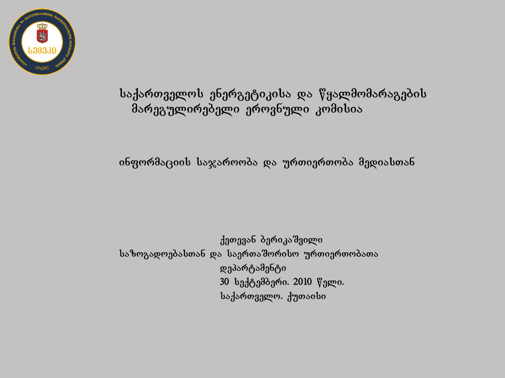 saqarTvelos energetikisa da wyalmomaragebis maregulirebeli erovnuli komisia informaciis sajarooba da urTierToba mediasTan qeTevan berikaSvili sazogadoebasTan da saerTaSoriso urTierTobaTa departamenti 30 seqtemberi. 2010 weli. saqarTvelo. quTaisi informaciis sajaroobis mniSvneloba komisiisTvis • komisiis erT-erTi mTavari prioritetia semekis saqmianobaze informaciis xelmisawvdomoba sazogadoebis farTo fenebisTvis. • gansakuTrebiT ki mniSvnelovania momxmareblisaTvis, romelisTvisac ara mxolod sainteresoa, aramed aucilebelia komisiis konkretuli saqmianobebis Sesaxeb drouli informaciis miwodeba. • informacia sajaroa yvelasaTvis. informaciis sajaroobis ganmsazRvreli dokumentebi • saqarTvelos zogadi administraciuli kodeqsis III Tavi;. • “eleqtroenergetikisa da bunebrivi gazis Sesaxeb” saqarTvelos kanonis me-12 muxli • komisiis debuleba. ra ainteresebT sazogadoebis farTo fenebs? • sazogadoebis mxridan mkacrad kontroldeba semekis saqmianobis gamWvirvaloba; • Mmomxmareblis mxridan didia interesi tarifebze. es exeba rogorc tarifebis matebis aseve, tarifebis klebis SemTxvevebs. • yuradReba maxvildeba kompaniebisa da momxmareblebisaTvis gansazRvrul uflebebze, radganac xSiria kompaniebis mxridan momxmarebelTa uflebebis darRvevis faqtebi.. informaciis miwodebis saSualebebi • komisiis veb-gverdi: www.gnerc.org; • relizebi; • pres-konferenciebi informaciis miwodeba komisiis veb-gverdiT • departamenti intensiurad muSaobs veb-gverdis rogorc informaciiT datvirTvaze, aseve misi dizainis modernizebaze; • 2009 wlis dasawyisSi moxda veb-gverdis ganaxleba momxmarebelTaTvis informaciis moZiebis gamartivebis mizniT. • veb-gverdze ganTavsebulia semekis saqmianobis Sesaxeb sruli informacia, romelic sWirdebaT/ainteresebT sazogadoebis sxvadasxva kategoriebs. informaciis miwodeba komisiis veb-gverdiT • veb-gverdiT sargebloben licenziatebi, abonentebi, mediis warmomadgenlebi, samTavrobo da arasamTavrobo organizaciebi. • dRis ganmavlobaSi saSualod 30-dan 120-mde momxmarebeli sargeblobs veb-gverdiT. • komisiis mier miRebuli normatiuli aqtebi veb-gverdze Tavsdeba misi ZalaSi Sesvlis dRidan. informaciis miwodeba komisiis veb-gverdiT • veb-gverdis saSualebiT momxmareblebs SeuZliaT, winaswar proeqtis saxiT gaecnon maT da SeniSvnebis arsebobis SemTxvevaSi, isini gamoagzavnon saitze miTiTebuli sakontaqto nomrebisa Tu eleqtronuli fostis saSualebiT. • komisia iRebs sajaro gadawyvetilebebs. nebismier pirs SeuZlia monawileoba miiRos sajaro administraciuli warmoebis procesSi, romlis Sesaxebac informacia qveyndeba komisiis oficialur veb-gverdze. • komisiis sajaro sxdomebis dRis wesrigi qveyndeba veb-gverdis mTavar gverdze mis gamarTvamde 7 dRiT adre. relizebi • departamentis mier mzaddeba komisiis mier miRebuli gadawyvetilebebis Sesaxeb saboloo informacia pres-relizis saxiT. • Ppres-relizebi Tavsdeba mTavar gverdze. Aaseve, eleqtronuli fostis saSualebiT egzavneba yvela mediasaSualebasa da sxvadasxva dainteresebul kompanias/abonents. pres-konferenciebi • mimdinare sakiTxebze komisia sistematurad marTavs preskonferenciebs JurnalistebisaTvis • pres-konferenciaze Jurnalistebs eZlevaT saSualeba pasuxi miiRon maT mier dasmul sxva sakiTxebzec. urTierToba mediasTan • mniSvnelovania mediasTan uwyveti kavSiri. sociologiuri gamokiTxvebi cxadyofs, rom saqarTvelos mosaxleobis 75%-mde, qveyanaSi mimdinare informacias iRebs televiziis, radios, internet-gamocemebisa da beWduri mediis saSualebiT. • komisia TanamSromlobs rogorc qarTul, aseve ucxour mediasTan. daintereseba semekis saqmianobis Sesaxeb ufro metia qarTuli mediis mxridan. • yovelwliurad formdeba xelSekrulebebi sxvadasxva sainformacio saSualebebTan utyuari informaciis gavrcelebis uzrunvelyofis mizniT.. urTierToba mediasTan • SerCevis kriteriumebia media saSualebebis ganviTarebis stabiluroba, JurnalistTa profesionalizmi, sainformacio saSualebis maRali reitingi, rogorc saqarTveloSi, aseve saqarTvelos farglebs gareT. • 2010 wlis wliuri xelSekrulebebi: • sainformacio saagento ”interpresniusi” www.ipn.ge • sainformacio saagento ”jeohotniusi” • radiomauwyebloba www.ghn.ge ”afxazeTis xma” FM 98.8 urTierToba mediasTan • mediis saSualebiT vrceldeba yvela uaxlesi informacia komisiis saqmianobis Sesaxeb, romelic sazogadoebisa da saerTaSoriso urTierTobaTa departamentis mier mzaddeba pres-relizebis an/da anonsis saxiT. • komisiaSi dagegmili sajaro sxdomebisa Tu sxva RonisZiebebis Sesaxeb mediis warmomadgenlebs winaswar egzavnebaT informacia eleqtronuli fostis meSveobiT an xdeba maTi gafrTxileba telefonis saSualebiT. • presis Jurnalistebis mxridan calkeuli kiTxvebis SemTxvevaSi, maT mier igzavneba werili, romelsac semeki pasuxs gascems 10 samuSao dRis vadaSi. (saqarTvelos zogadi administarciuli kodeqsi. Tavi III). urTierToba mediasTan • satelevizio siuJetis momzadebisas xdeba winaswari SeTanxmeba Temaze da Caweris droze. • xSiria satelefono komentarebi. sagulisxmoa, rom aseTi gziT komisiis TanamSromelTa mier gakeTebuli komentarebi, xSirad araswori interpretaciiT vrceldeba. Jurnalistis mier xdeba informaciis damaxinjeba. • Jurnalistis mier araswori informaciis gaSuqebis an informaciis damaxinjebis SemTxvevaSi, semekis mxridan xdeba dauyovneblivi reagireba. redaqciaSi igzavneba Sesabamisi werili an/da dgeba satelefono saubari, ris Sedegadac xdeba ”SeniSvnis” saxiT swori informaciis gavrceleba. ZiriTadad, ra ainteresebs medias? • informacia tarifebis Sesaxeb; • informacia komisiis mier gamoyenebuli sanqciebis Sesaxeb; • komisiis wliuri angariSebi; • semekis TanamSromelTa xelfasis odenoba. Mmedia monitoringi • departamentis mier xorcieldeba yoveldRiuri monitoringi semekis saqmianobis Sesaxeb mediis saSualebiT gavrcelebul informaciebze. • magaliTisTvis, 18 agvistos mdgomareobiT bolo 6 Tvis ganmavlobaSi gamoqveynebuli statiebis raodenoba energoseqtorisa da wyalmomaragebis seqtoris Sesaxeb Seadgina 214. maT Soris didi nawili aris semekis mier pres-relizebis saxiT gagzavnili informaciebi. seminarebi/trenin