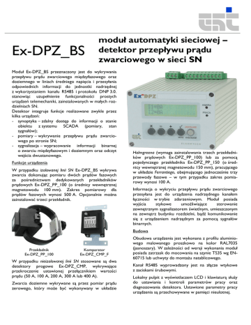 Ex-DPZ_BS moduł automatyki sieciowej – detektor przepływu prądu zwarciowego w sieci SN Moduł Ex-DPZ_BS przeznaczony jest do wykrywania przepływu prądu zwarciowego międzyfazowego oraz doziemnego w liniach średniego napięcia i przesyłania odpowiednich informacji do jednostki nadrzędnej z wykorzystaniem kanału RS485 i protokołu DNP 3.0. stanowiąc uzupełnienie funkcjonalności prostych urządzeń telemechaniki, zainstalowanych w małych rozdzielniach SN. Detektor integruje funkcje realizowane zwykle przez kilka urządzeń: - synoptyka – zdalny dostęp do informacji o stanie obiektu z systemu SCADA (pomiary, stan sygnałów); - pomiary – wykrywanie przepływu prądu zwarciowego po stronie SN; - sygnalizacja – wypracowanie informacji binarnej o zwarciu międzyfazowym i doziemnym oraz odczyt wejścia dwustanowego. Funkcje urządzenia W przypadku izolowanej linii SN Ex-DPZ_BS wykrywa zwarcia dokonując pomiaru dwóch prądów fazowych za pośrednictwem dedykowanych przekładników prądowych Ex-DPZ_PP_100 (o średnicy wewnętrznej magnetowodu 100 mm). Zakres pomiarowy dla prądów fazowych wynosi 500 A. Opcjonalnie można zainstalować trzeci przekładnik. Holmgreena (wymaga zainstalowania trzech przekładników prądowych Ex-DPZ_PP_100) lub za pomocą pojedynczego przekładnika Ex-DPZ_PP_150 (o średnicy wewnętrznej magnetowodu 150 mm), pracującego w układzie Ferrantiego, obejmującego jednocześnie trzy przewody fazowe – w tym przypadku zakres pomiarowy wynosi 100 A. Informacja o wykryciu przepływu prądu zwarciowego przesyłana jest do urządzenia nadrzędnego kanałem łączności w trybie zdarzeniowym. Moduł posiada wyjścia stykowe umożliwiające sterowanie zewnętrznym sygnalizatorem świetlnym, umieszczonym na zewnątrz budynku rozdzielni, bądź komunikowanie się z urządzeniem nadrzędnym za pomocą sygnałów binarnych. Budowa Przekładnik Ex-DPZ_PP_100 Komparator Ex-DPZ_CMP_F W przypadku nieizolowanej linii SN stosowane są dwa detektory progowe Ex-DPZ_CMP, wykrywające przekroczenie ustawionej przełącznikiem wartości prądu (50 A, 100 A, 200 A, 300 A lub 400 A). Zwarcia doziemne wykrywane są przez pomiar prądu zerowego, który może być wykonywany w układzie Obudowa urządzenia jest wykonana z profilu aluminiowego malowanego proszkowo na kolor RAL7035 (jasnoszary). W zależności od wersji wykonania moduł posiada zatrzask do mocowania na szynie TS35 wg EN60715 lub uchwyty do montażu natablicowego. Kanał RS485 wyprowadzony jest na złącze wtykowe z zaciskami śrubowymi. Lokalny pulpit z wyświetlaczem LCD i klawiaturą służy do ustawiania i kontroli parametrów pracy oraz diagnozowania detektora. Ustawione parametry pracy urządzenia są przechowywane w pamięci nieulotnej. Parametry techniczne: Urządzenie zostało zaprojektowane i wykonane zgodnie z wymaganiami dyrektyw 2006/95/WE (LVD) oraz 2004/108/WE (EMC) Parametry ogólne Wymiary Warunki pracy Obwody zasilania Zaciski (W x S x G) Temperatura pracy / przechowywania Wilgotność względna Napięcie zasilania Pobór mocy z zasilania Zasilania, wejścia i wyjść dwustanowych Obwody prądowe Obwody wejściowe i wyjściowe: Wejście dwustanowe Wyjścia sterowania lampą sygnalizacyjną Wejścia pomiarowe prądowe Wejścia komparatora Komunikacja z urządzeniem: Z systemem nadrzędnym 78 x 110 x 140 mm (0°…+50) °C / (-20 …+70) °C do 90 % 24 V DC < 1 VA złącza w rastrze 5,08 mm, do przewodów o maksymalnym przekroju 2,5 mm2 Typ wtyku: MSTB 2,5 złącza w rastrze 5,08 mm, do przewodów o maksymalnym przekroju 2,5 mm2 Typ wtyku: MSTB 2,5 Napięcie wejściowe Rozdzielczość czasowa dla napięcia ~230V Liczba wyjść Znamionowy prąd Okres impulsu Czas impulsu Zakres pomiarowy - prąd fazowy Zakres pomiarowy - prąd doziemny Rozdzielczość Separacja wejść Zakres pracy Progi Wyjście 230 V 50 Hz 10 ms 2 20 mA (1…10) s 0,1 s 500 A 100 A 12 bitów wysokoomowa 500 A 50 A, 100 A, 200 A, 300 A, 400 A światłowód plastikowy Standard elektryczny Złącze RS 485 wtykowe, śrubowe w rastrze 3,5 mm, do przewodów o maksymalnym przekroju 1,5 mm2 DNP 3.0 Protokół Schematy podłączenia dla różnych układów pomiarowych EKT/KO-JSz/1,0
