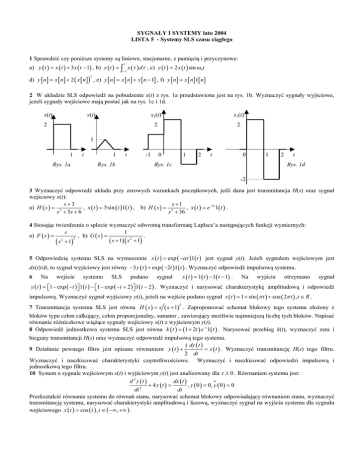 SYGNAŁY I SYSTEMY lato 2004 LISTA 5 - Systemy SLS czasu ciągłego 1 Sprawdzić czy poniższe systemy są liniowe, stacjonarne, z pamięcią i przyczynowe: t a) y ( t ) = x ( t ) + 3 x ( t −1) , b) y ( t ) = ∫ x (τ ) dτ , c) y ( t ) = 2 x ( t ) sin ω 0 t −1 d) y [ n ] = x [ n ] + 2 ( x [ n ]) , e) y [ n ] = x [ n ] + x [ n − 1] , f) y [ n ] = x [ n ]1[ n ] 3 2 W układzie SLS odpowiedź na pobudzenie x(t) z rys. 1a przedstawiona jest na rys. 1b. Wyznaczyć sygnały wyjściowe, jeżeli sygnały wejściowe mają postać jak na rys. 1c i 1d. x(t) y(t) 2 x1(t) x1(t) 2 2 1 1 Rys. 1a t 1 t -1 Rys. 1b 0 1 2 t 0 1 Rys. 1c 2 t Rys. 1d -2 3 Wyznaczyć odpowiedź układu przy zerowych warunkach początkowych, jeśli dana jest transmitancja H(s) oraz sygnał wejściowy x(t): s+3 s +1 a) H ( s ) = 2 , x ( t ) = 5sin ( t )1( t ) , b) H ( s ) = 2 , x ( t ) = e −2 t 1 ( t ) . s + 5s + 6 s + 36 4 Stosując twierdzenie o splocie wyznaczyć odwrotną transformatę Laplace’a następujących funkcji wymiernych: s 1 , b) G ( s ) = . a) F ( s ) = 2 2 ( s + 1) ( s 2 + 1) ( s + 1) 5 Odpowiedzią systemu SLS na wymuszenie x ( t ) = exp ( −α t )1( t ) jest sygnał y(t). Jeżeli sygnałem wejściowym jest dx(t)/dt, to sygnał wyjściowy jest równy −3 y ( t ) + exp ( −2t )1( t ) . Wyznaczyć odpowiedź impulsową systemu. 6 Na wejście systemu SLS podano x ( t ) = 1( t ) − 1( t − 1) . sygnał Na wyjściu otrzymano sygnał y ( t ) = 1 − exp ( −t ) 1( t ) − 1 − exp ( −t + 2 ) 1( t − 2 ) . Wyznaczyć i narysować charakterystykę amplitudową i odpowiedź impulsową. Wyznaczyć sygnał wyjściowy y(t), jeżeli na wejście podano sygnał x ( t ) = 1 + sin (π t ) + cos ( 2π t ) , t ∈ R . 7 Transmitancja systemu SLS jest równa H ( s ) = s ( s + 1) . Zaproponować schemat blokowy tego systemu złożony z 2 bloków typu człon całkujący, człon proporcjonalny, sumator , zawierający możliwie najmniejszą liczbę tych bloków. Napisać równanie różniczkowe wiążące sygnały wejściowy x(t) z wyjściowym y(t). 8 Odpowiedź jednostkowa systemu SLS jest równa k ( t ) = (1 + 2t ) e − t 1( t ) . Narysować przebieg k(t), wyznaczyć zera i bieguny transmitancji H(s) oraz wyznaczyć odpowiedź impulsową tego systemu. 1 dy ( t ) = x ( t ) . Wyznaczyć transmitancję H(s) tego filtru. 9 Działanie pewnego filtru jest opisane równaniem y ( t ) + 2 dt Wyznaczyć i naszkicować charakterystyki częstotliwościowe. Wyznaczyć i naszkicować odpowiedzi impulsową i jednostkową tego filtru. 10 System o sygnale wejściowym x(t) i wyjściowym y(t) jest analizowany dla t ≥ 0 . Równaniem systemu jest: • d 2 y (t ) dx ( t ) + 4 y (t ) = , y ( 0 ) = 0, y ( 0 ) = 0 2 dt dt Przekształcić równanie systemu do równań stanu, narysować schemat blokowy odpowiadający równaniom stanu, wyznaczyć transmitancję systemu, narysować charakterystyki amplitudową i fazową, wyznaczyć sygnał na wyjściu systemu dla sygnału wejściowego x ( t ) = cos ( t ) , t ∈ ( −∞, +∞ ) . 11 Dany jest schemat blokowy pewnego systemu S1 pokazany na rysunku 2a, a ∈ R x(t) y(t) ∫ + x(t) ∫ + a ∫ + a Rys. 2a ∫ b y(t) Rys. 2b Wyznaczyć równanie różniczkowe systemu wiążące sygnał wejściowy x(t) z sygnałem wyjściowym y(t), wyznaczyć transmitancję systemu S1, jej zera i bieguny, wyznaczyć odpowiedź impulsową systemu S1, wyznaczyć i naszkicować charakterystyki amplitudową i fazową systemu S1. Rysunek 2b przedstawia system S2 będący szeregowym połączeniem dwóch systemów o strukturze jak na rysunku 2a oraz członu całkującego. Wyznaczyć transmitancję systemu S2, oraz zera i bieguny transmitancji. 12 Rysunek 3 przedstawia schemat blokowy pewnego systemu czasu ciągłego. Napisać równanie różniczkowe wiążące sygnał wejściowy x(t) z sygnałem wyjściowym y(t), wyznaczyć transmitancję tego systemu, zaznaczyć w płaszczyźnie zespolonej rozkład zer i biegunów transmitancji, wyznaczyć odpowiedź impulsową tego systemu, wyznaczyć i naszkicować odpowiedź systemu na pobudzenie sygnałem x ( t ) = sin ( t ) ⋅1( t ) . x(t) + + 0.5 ∫ - + y(t) 2 ∫ 10 Rys. 3 12 13 Odpowiedź jednostkowa pewnego systemu czasu ciągłego wyraża się wzorem k ( t ) = ( exp(−1 2T ) − exp(−1/ T ) ) ⋅1( t ) , gdzie T>0 jest parametrem. Wyznaczyć transmitancję tego systemu, w płaszczyźnie zespolonej naszkicować rozkład zer i biegunów transmitancji, wyznaczyć odpowiedź impulsową tego systemu, naszkicować schemat blokowy tego systemu. Dla pewnej wybranej wartości parametru T wykreślić odpowiedzi impulsową i jednostkową tego systemu. 14 System SLS czasu ciągłego pobudzany sygnałem x(t) opisany jest układem równań różniczkowych o zerowych warunkach początkowych x1 ( 0 ) = x2 ( 0 ) = 0 . • x1 = x1 + x0 • oraz równaniem dla sygnału wyjściowego y(t) o postaci y = − 1 (1 + ε ) x1 + x2 4 x2 = x1 − 3x2 Wyznaczyć transmitancję tego systemu, wyznaczyć równanie różniczkowe wiążące sygnał wyjściowy y(t) z pobudzeniem x0(t), wyznaczyć odpowiedź impulsową h(t) dla przypadków ε ≠ 0 i ε = 0 . 15 Na rysunku 4 przedstawiono schemat blokowy pewnego systemu. x(t) + + H1(s) y(t) H3(s) + Rys. 4 H2(s) Transmitancje poszczególnych bloków opisane są wzorami H 1 (s ) = s −1 2 s + 4s + 3 H2 ( s) = s 3 + 3s 2 + 4 s + 2 s 2 + 2s − 3 s . Wyznaczyć transmitancję systemu, odpowiedź impulsową, równanie systemu, wyznaczyć i naszkicować s+2 charakterystykę amplitudową systemu. H 3 (s ) =